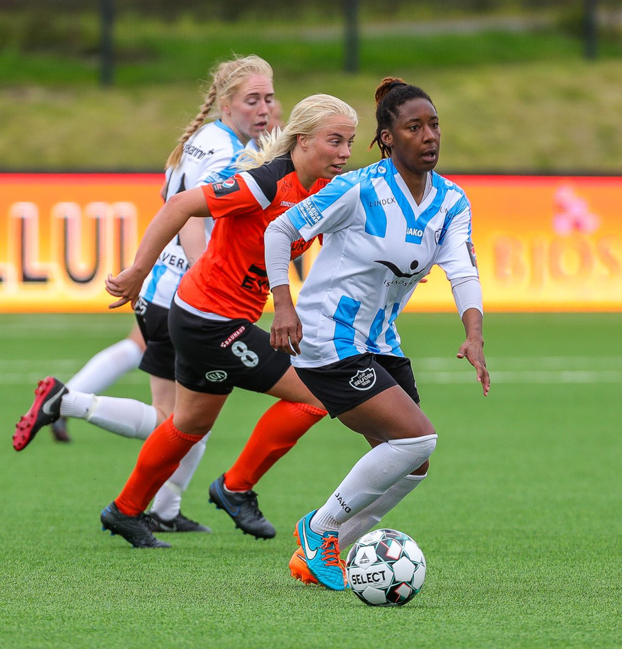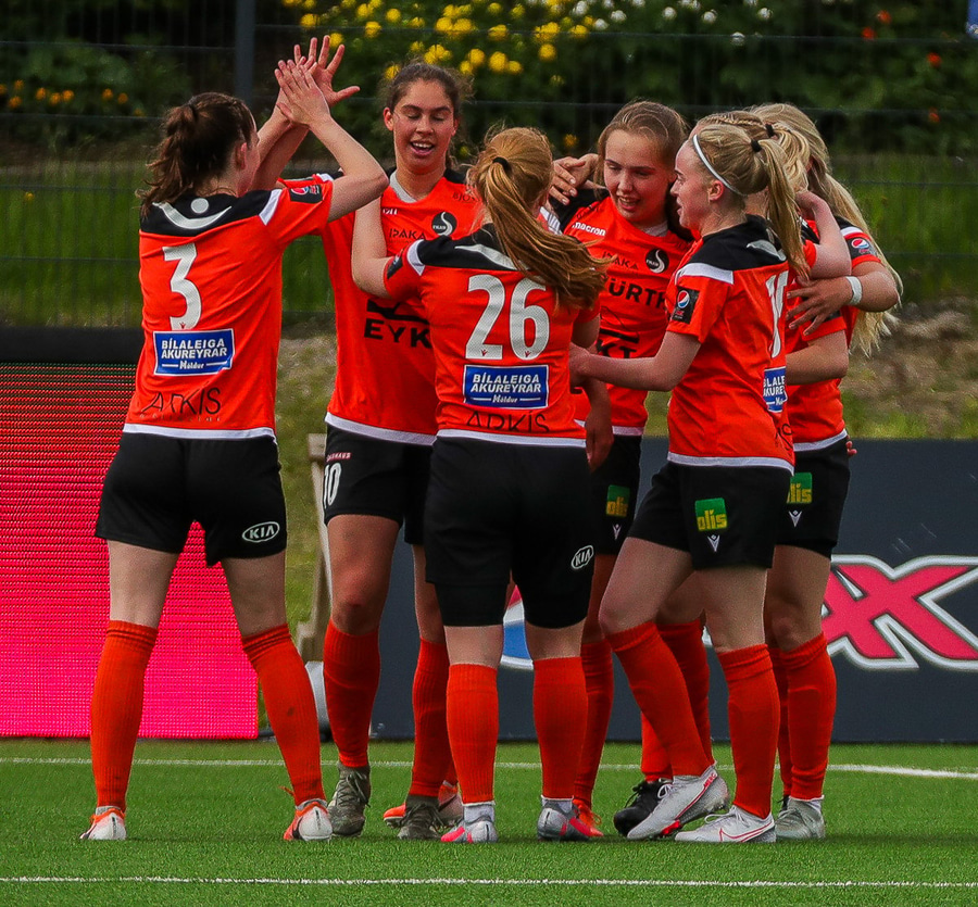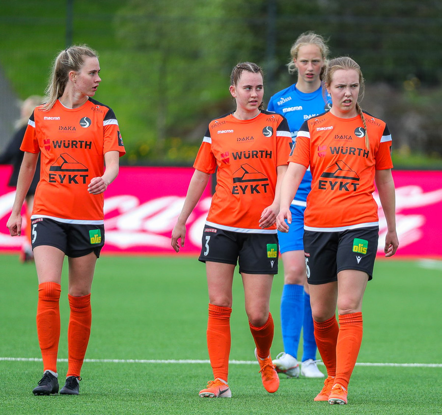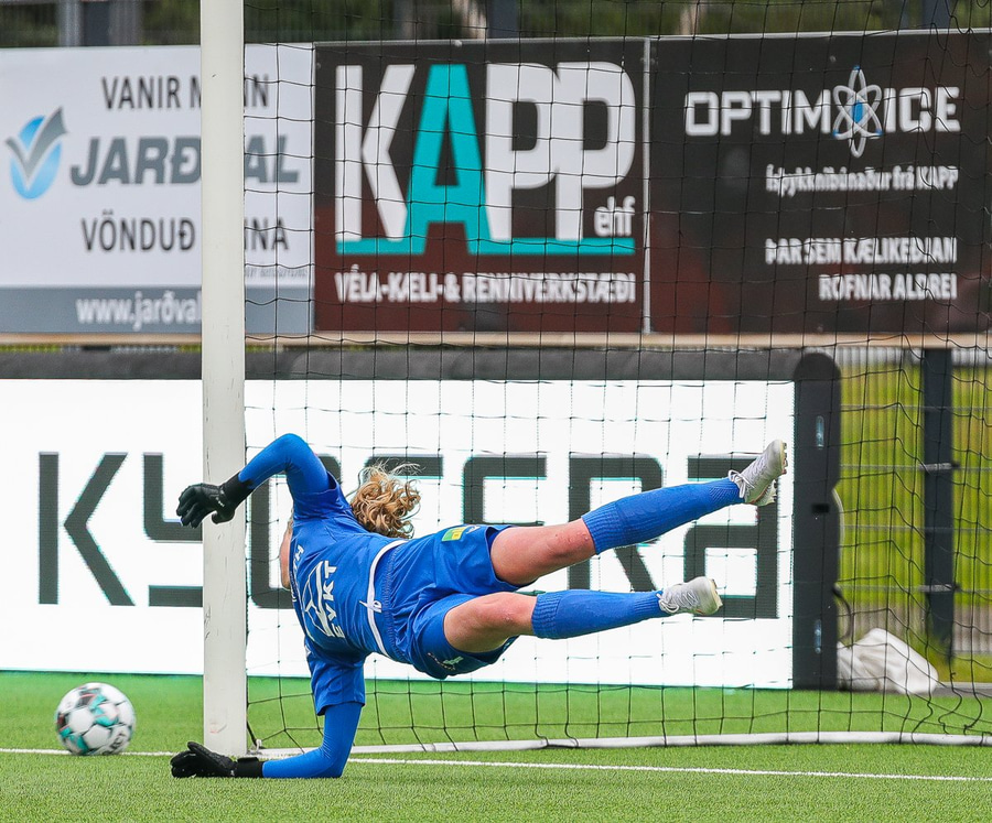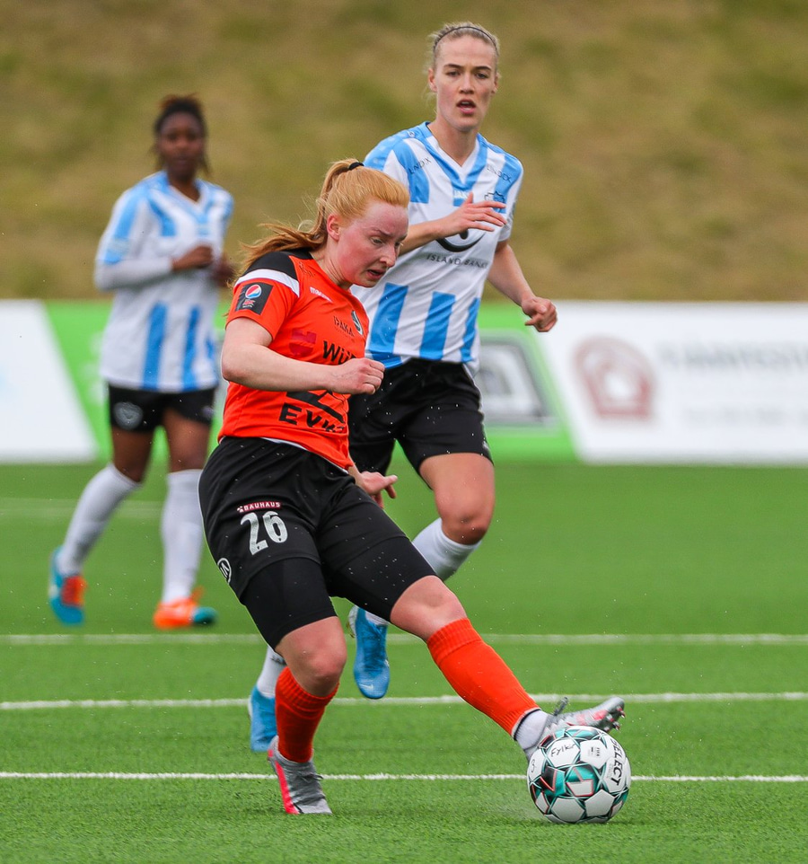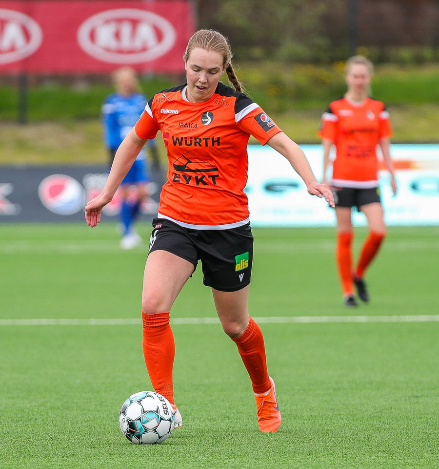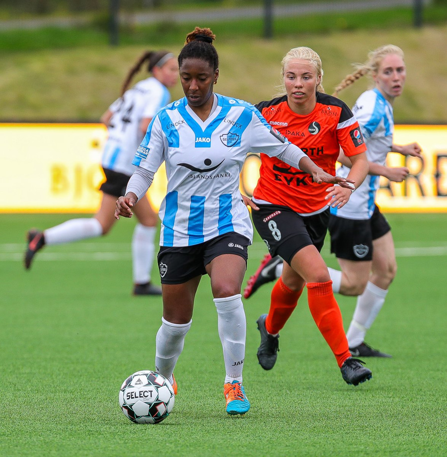 Bryndís kemst þá í fína stöðu. Með Sólveigu og Þórdísi með sér gegn tveimur varnarmönnum en nær ekki að skvera boltann fyrir hlaupið hjá samherja því Kaylan kemur vel út úr markinu og hreinsar.