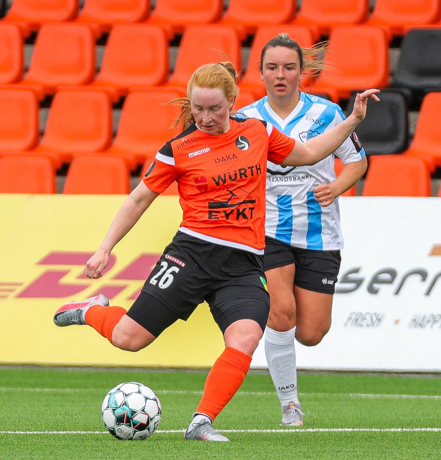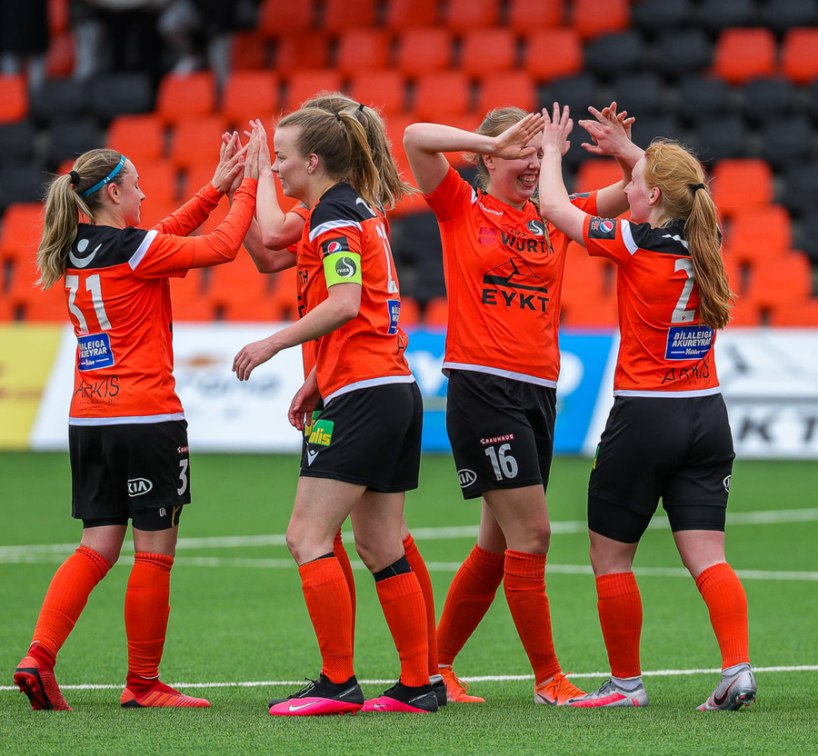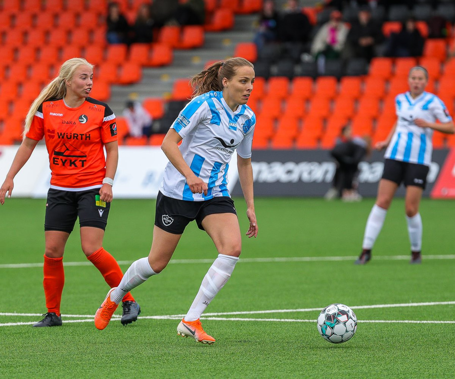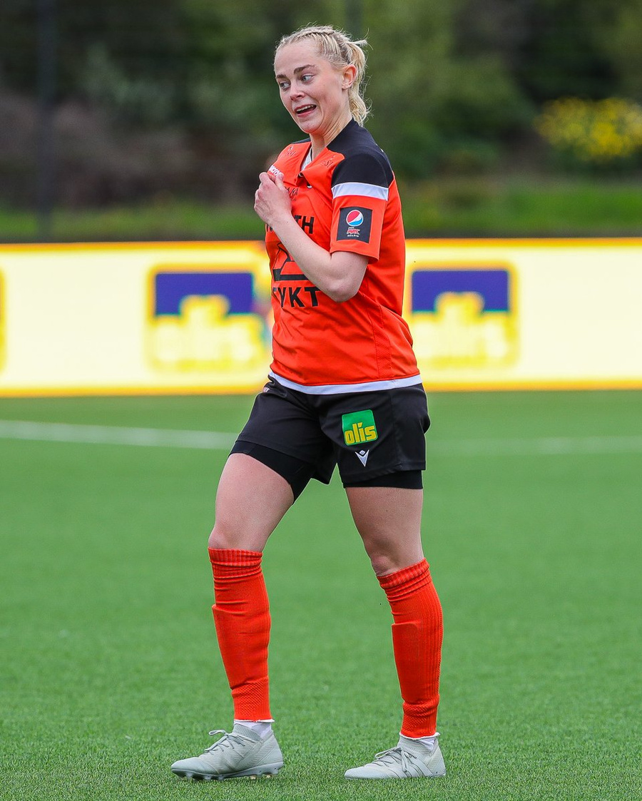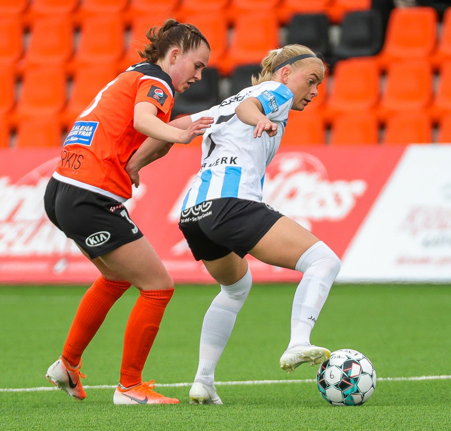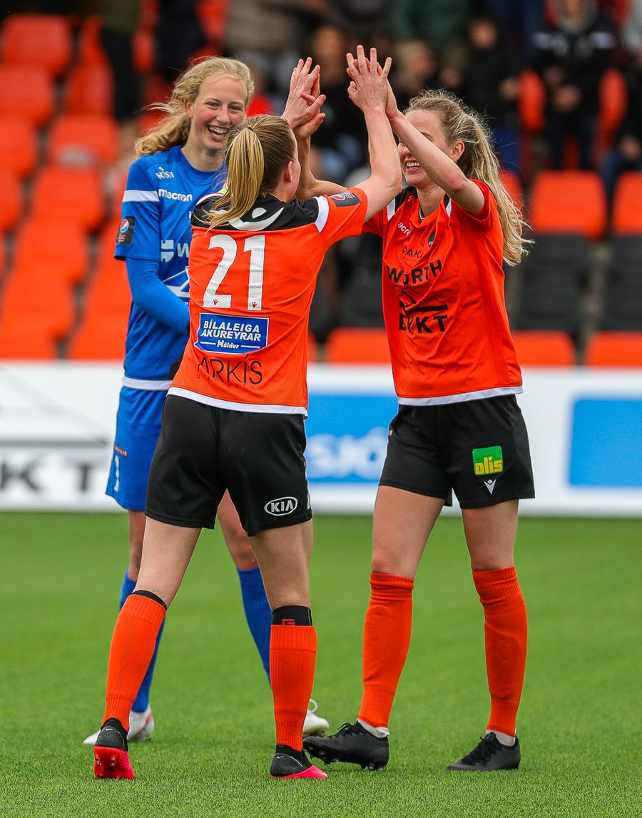 Bryndís kemst þá í fína stöðu. Með Sólveigu og Þórdísi með sér gegn tveimur varnarmönnum en nær ekki að skvera boltann fyrir hlaupið hjá samherja því Kaylan kemur vel út úr markinu og hreinsar.