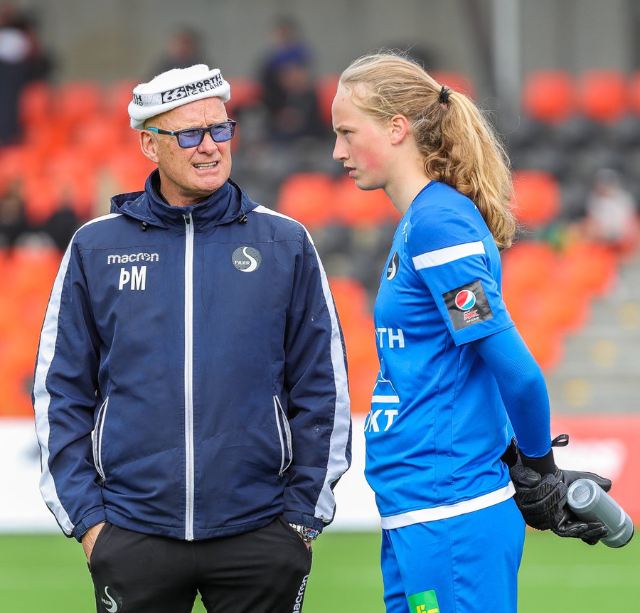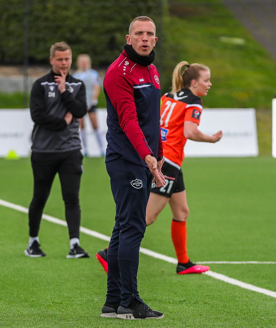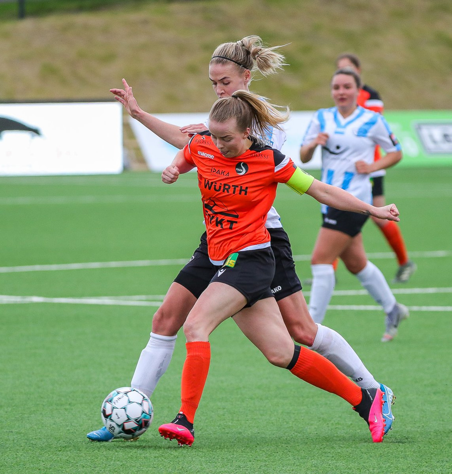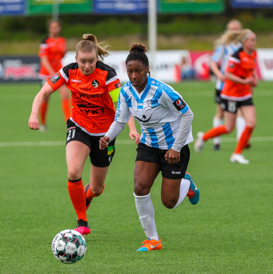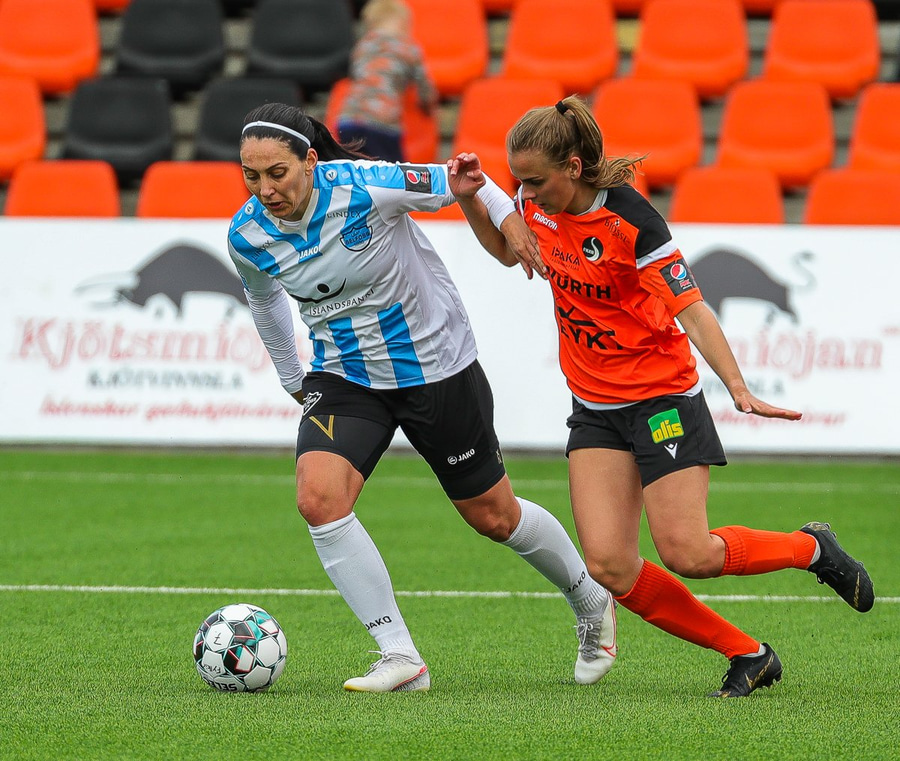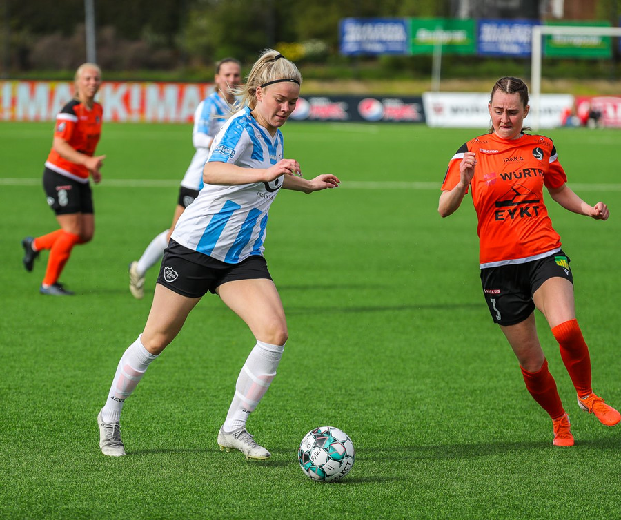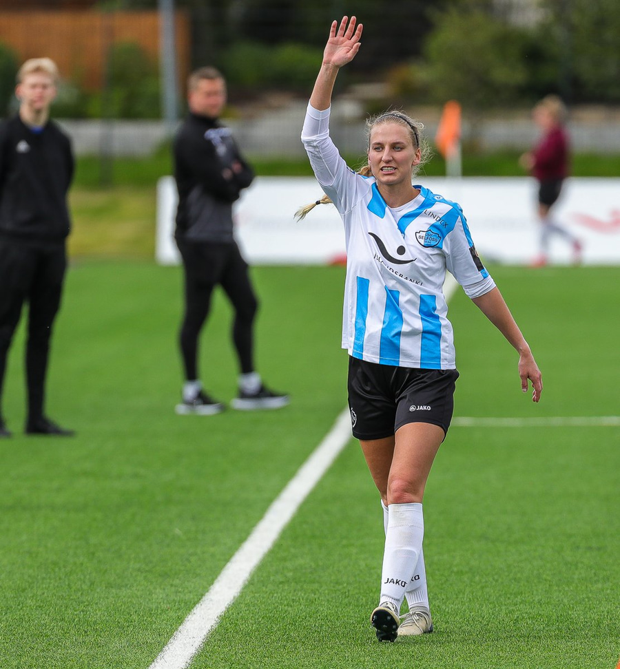 Bryndís kemst þá í fína stöðu. Með Sólveigu og Þórdísi með sér gegn tveimur varnarmönnum en nær ekki að skvera boltann fyrir hlaupið hjá samherja því Kaylan kemur vel út úr markinu og hreinsar.