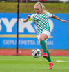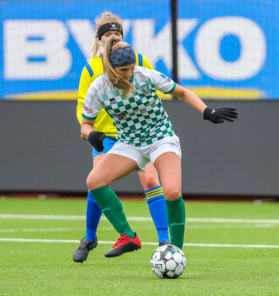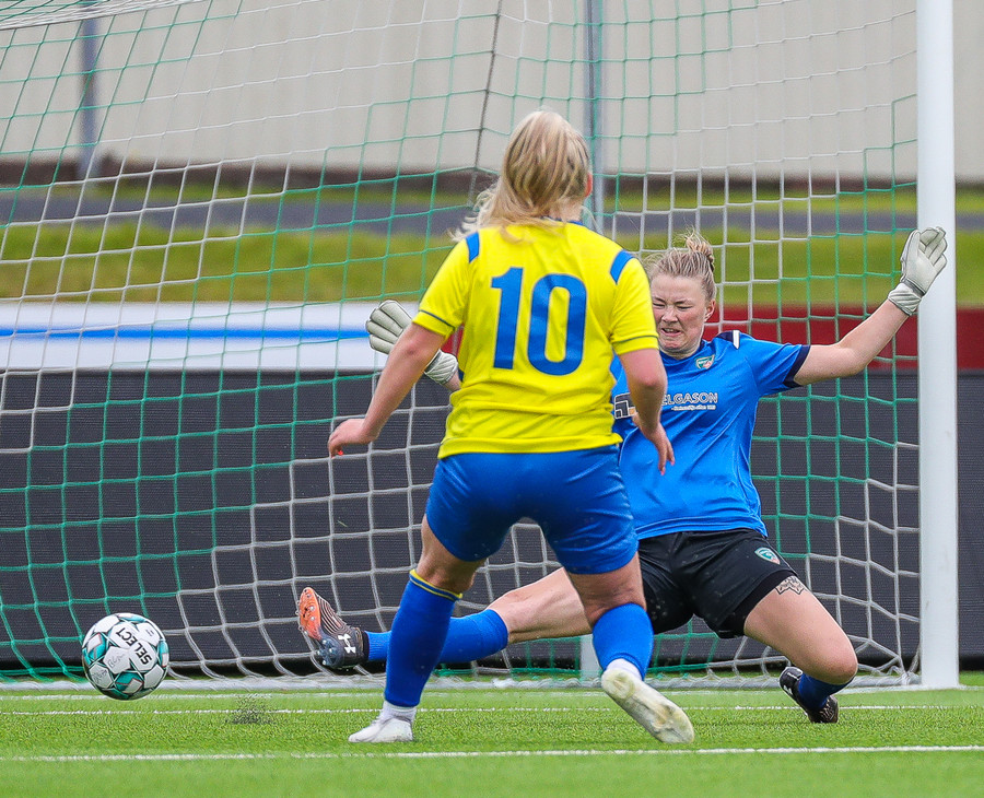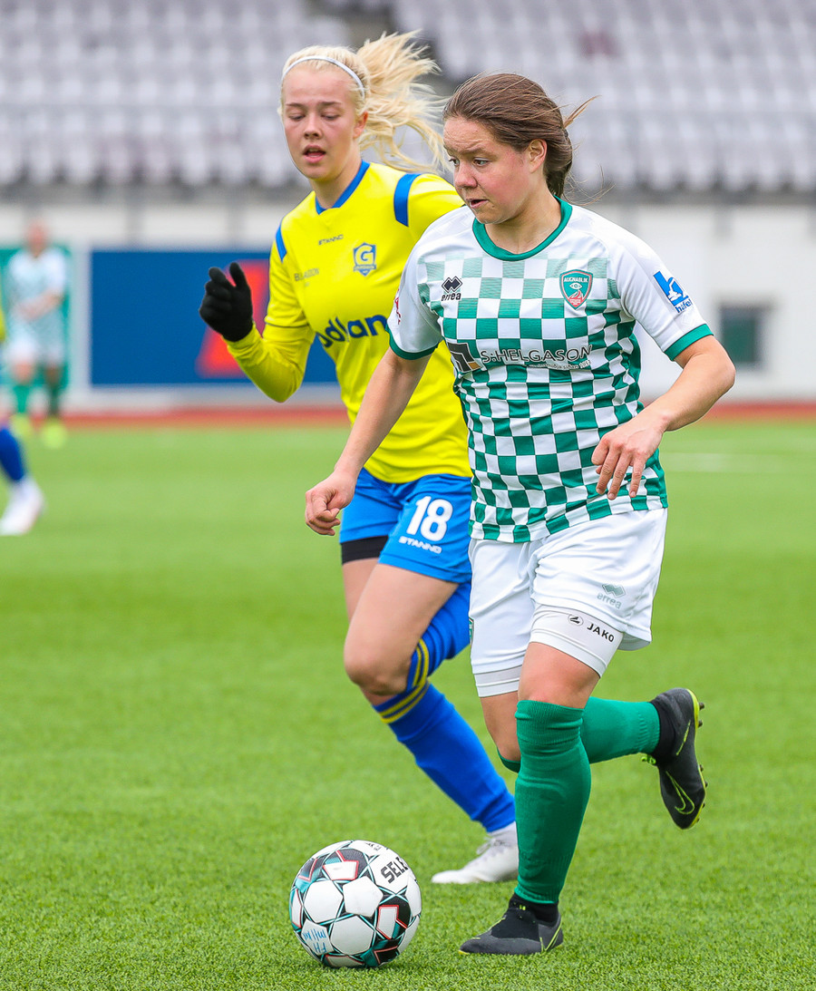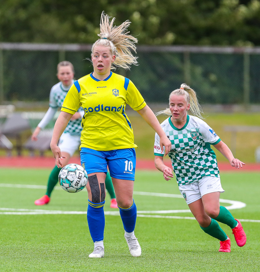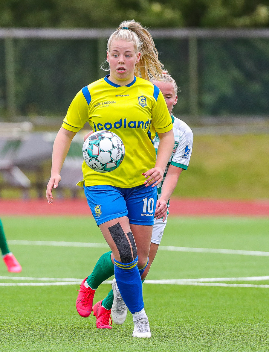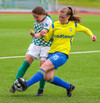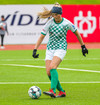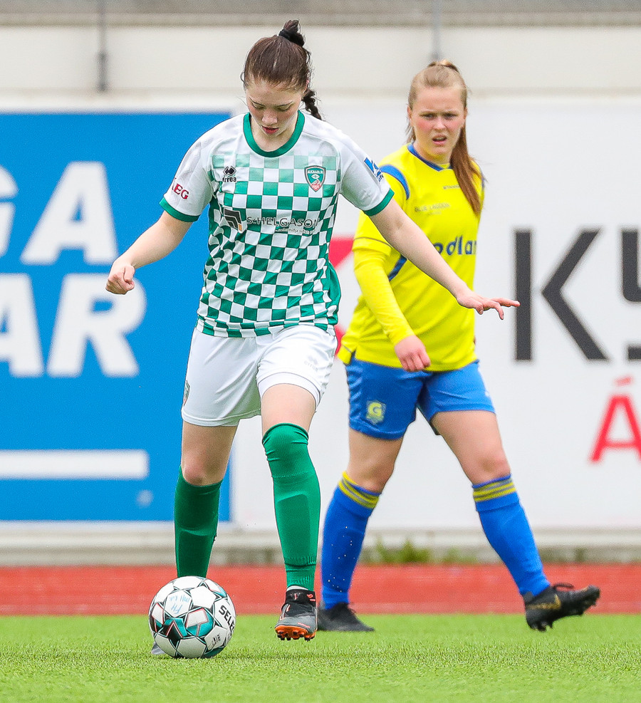 Vigdís fer illa með tvo varnarmenn en í staðinn fyrir að skjóta á markið reynir hún að senda til hliðar en samherji kemst ekki í boltann.