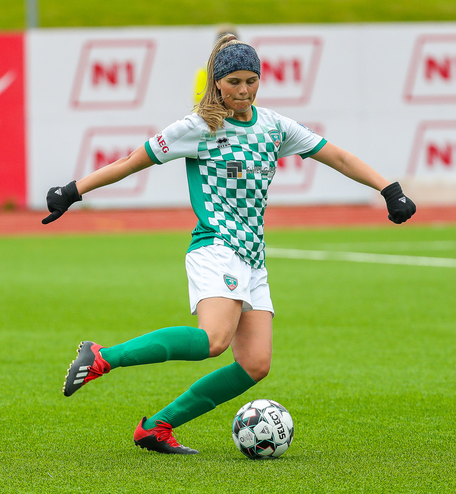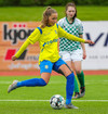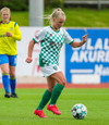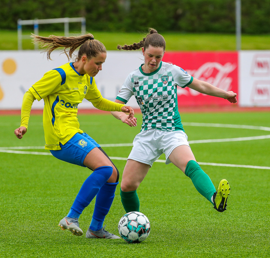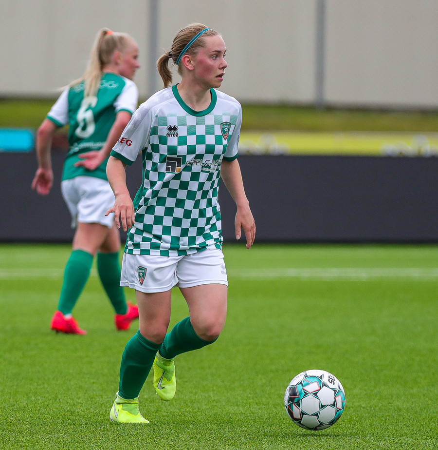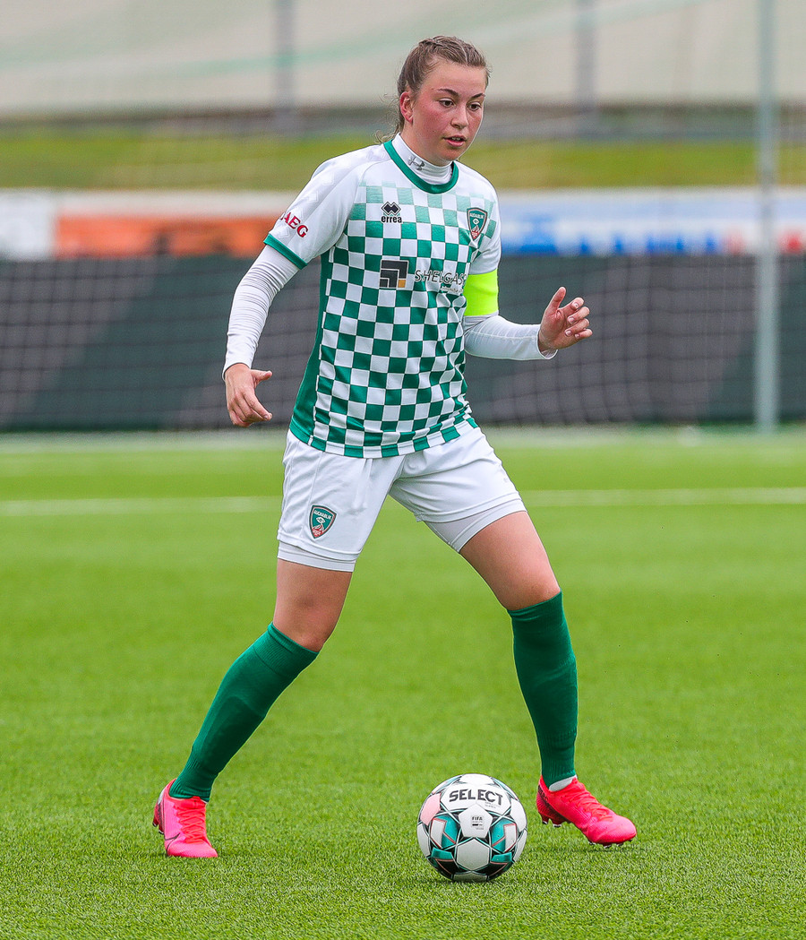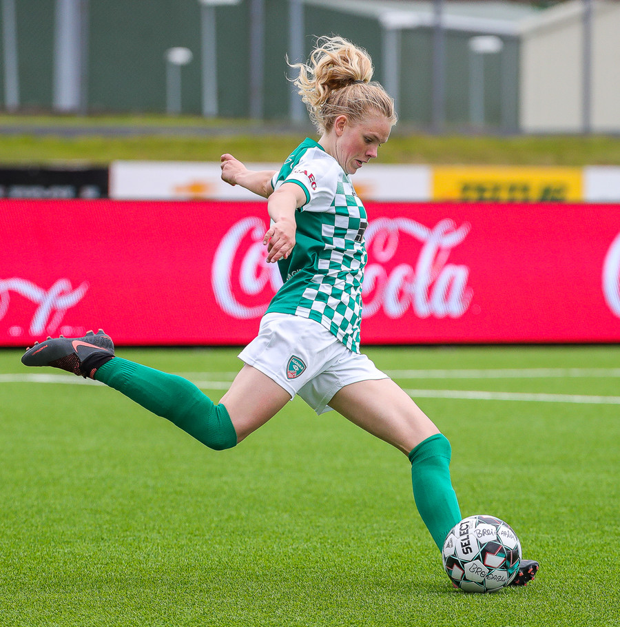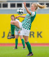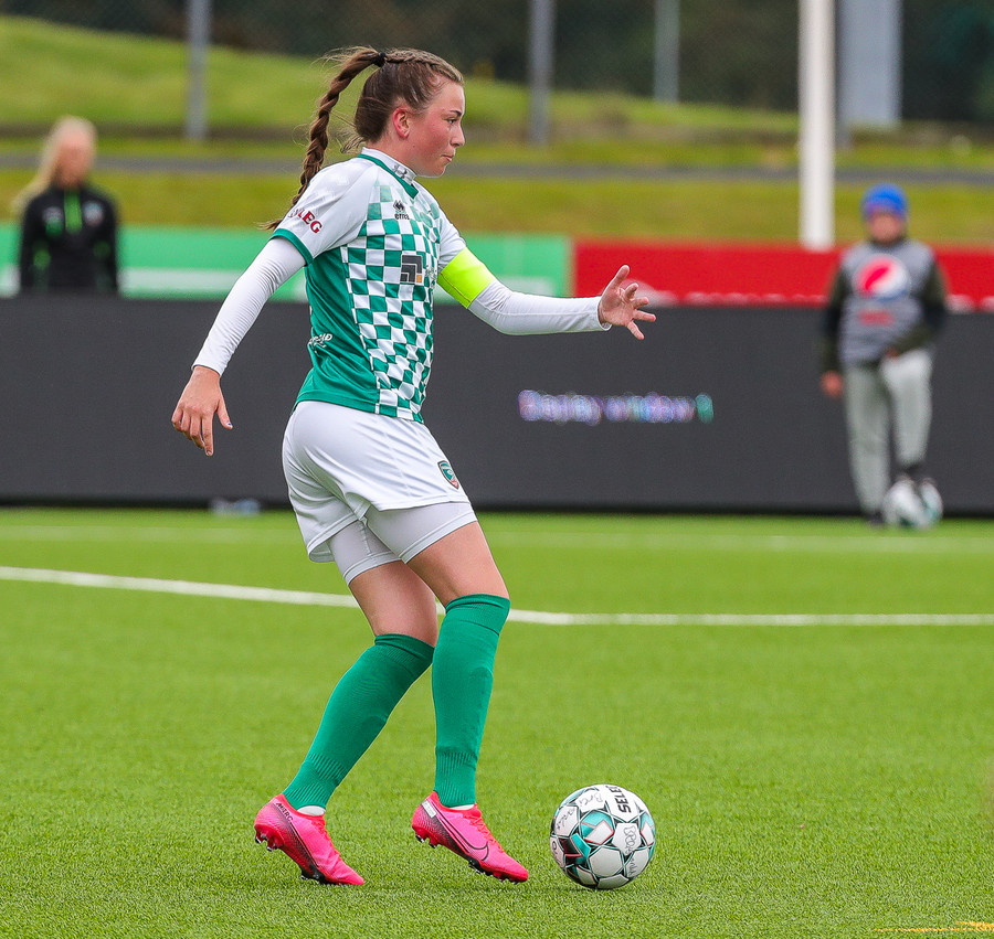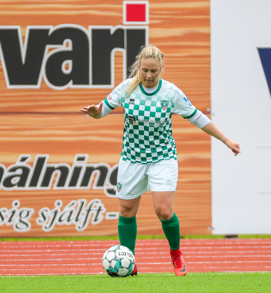 Vigdís fer illa með tvo varnarmenn en í staðinn fyrir að skjóta á markið reynir hún að senda til hliðar en samherji kemst ekki í boltann.