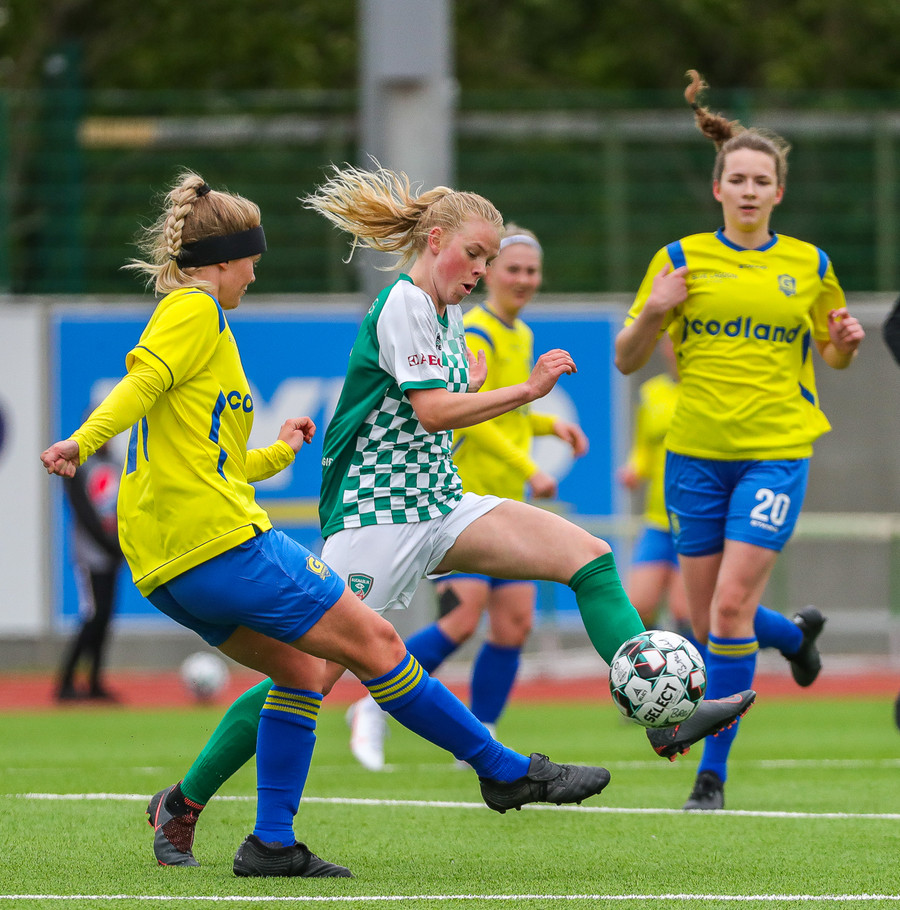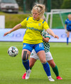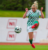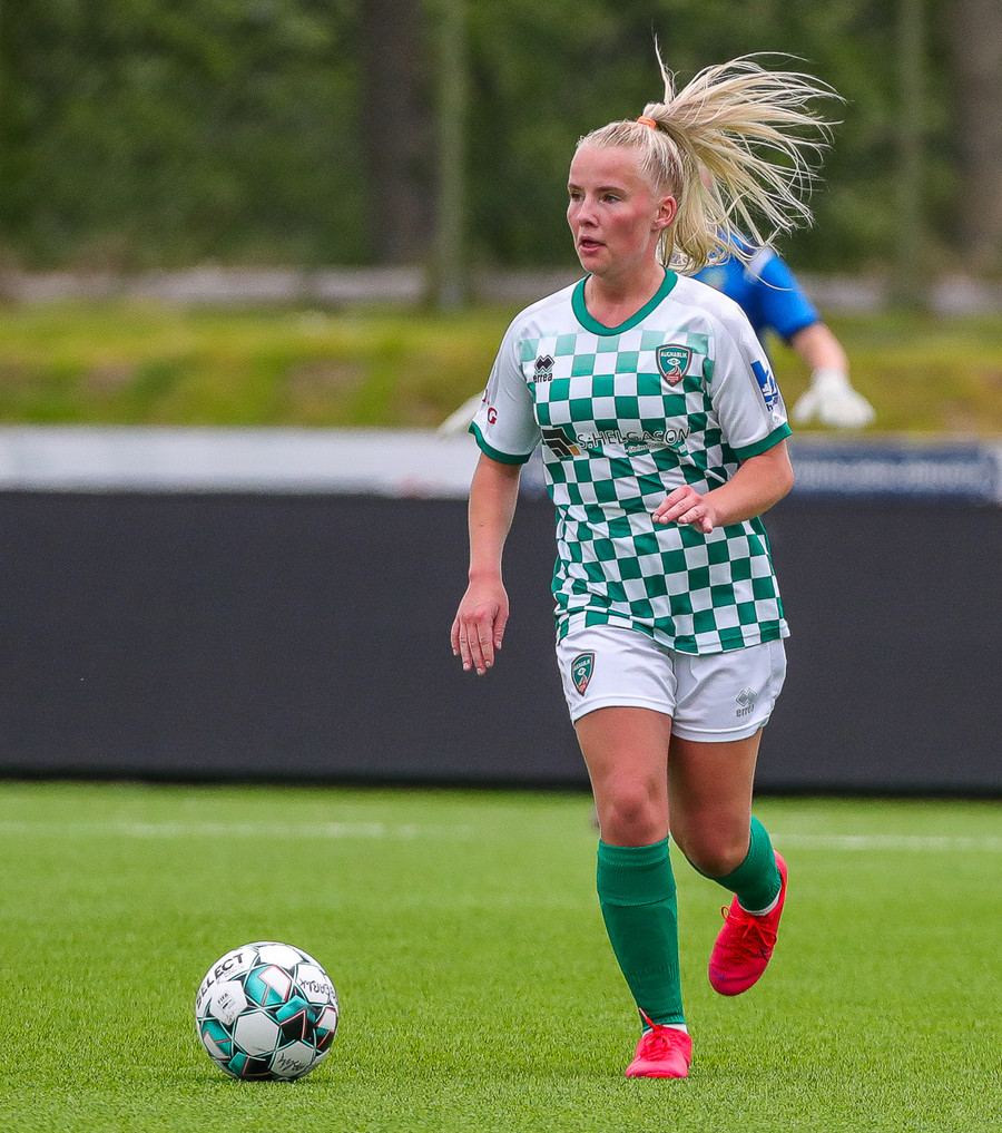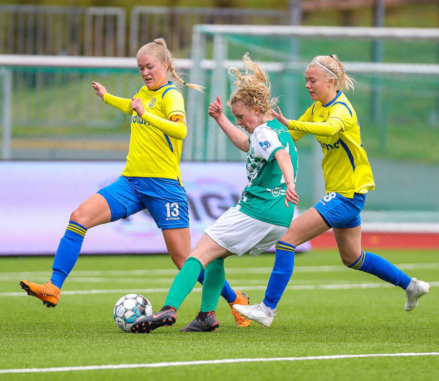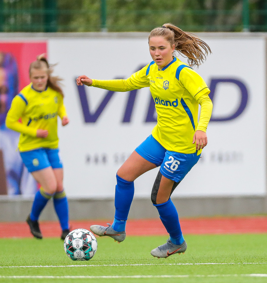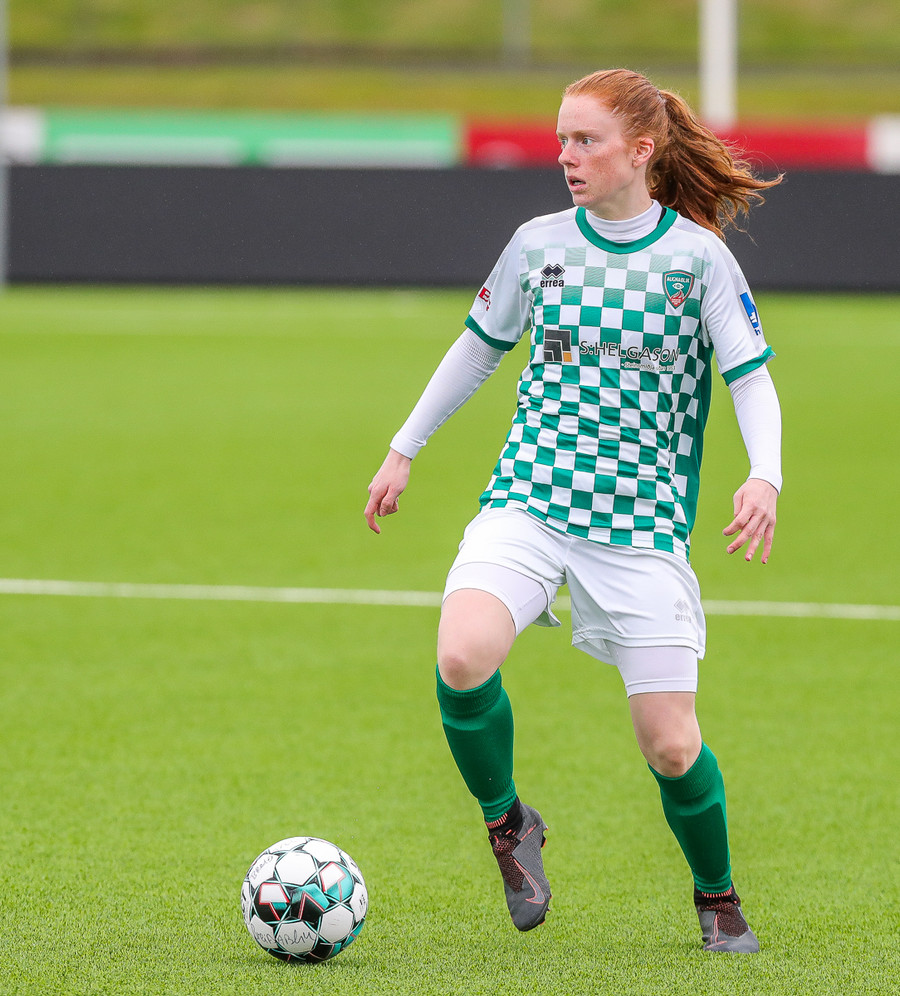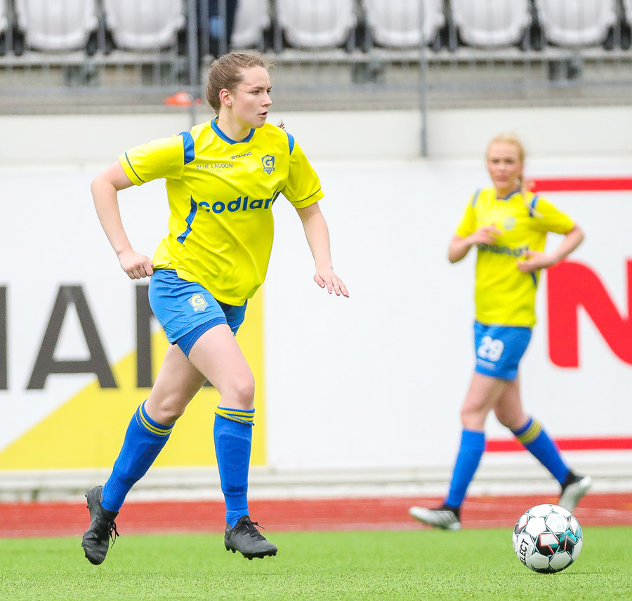 Vigdís fer illa með tvo varnarmenn en í staðinn fyrir að skjóta á markið reynir hún að senda til hliðar en samherji kemst ekki í boltann.