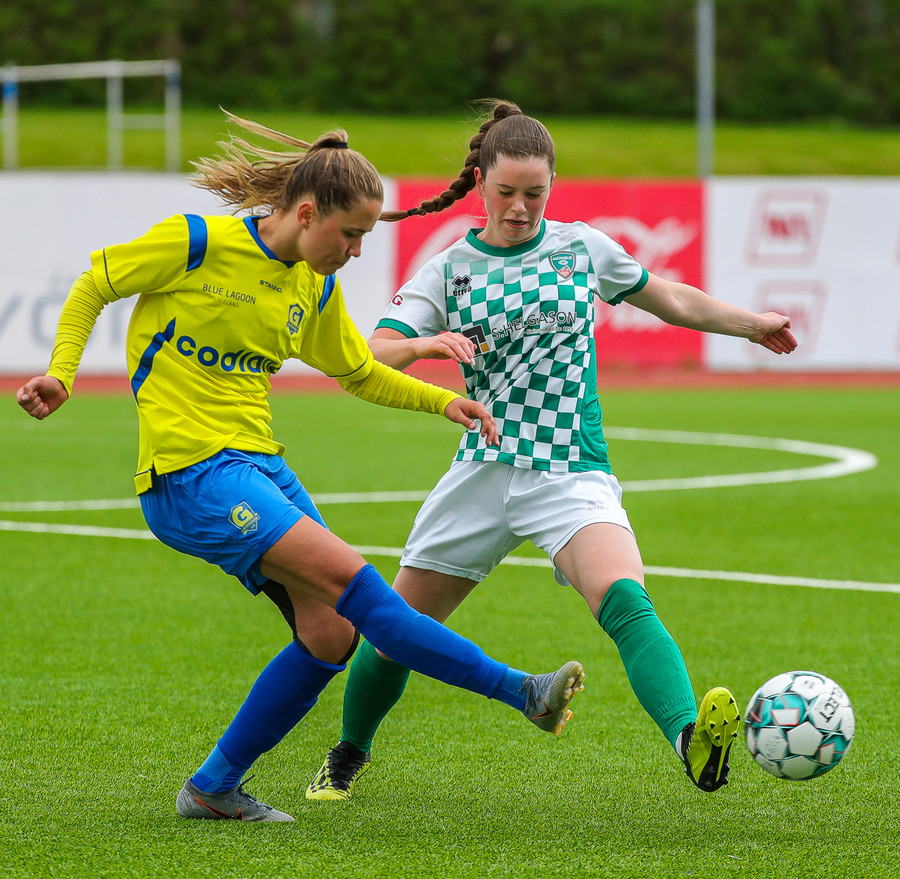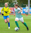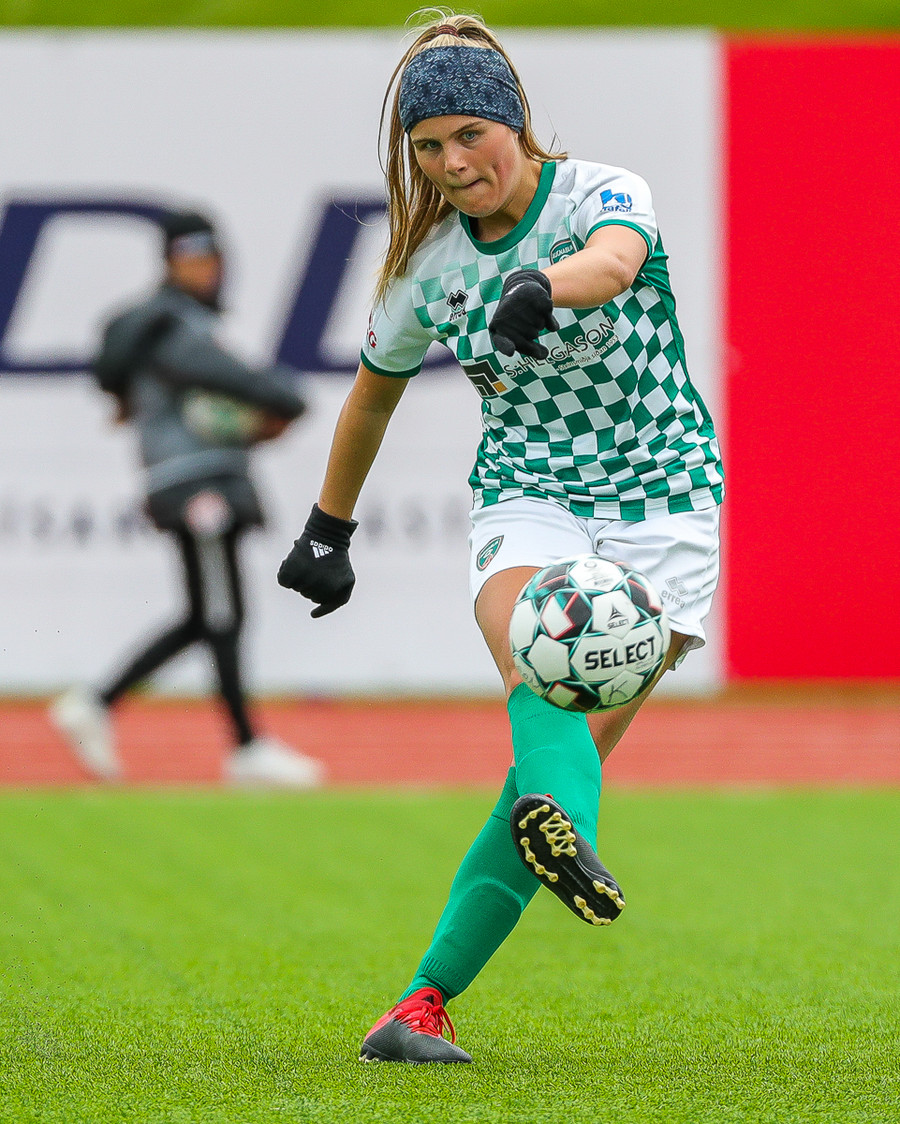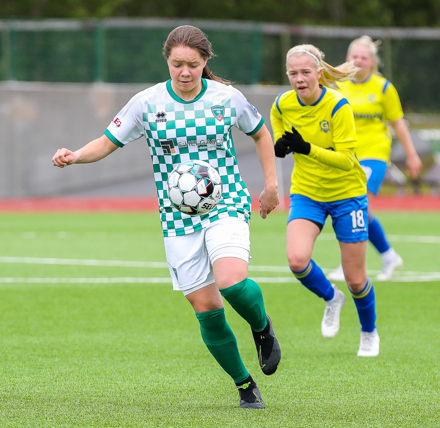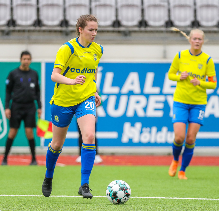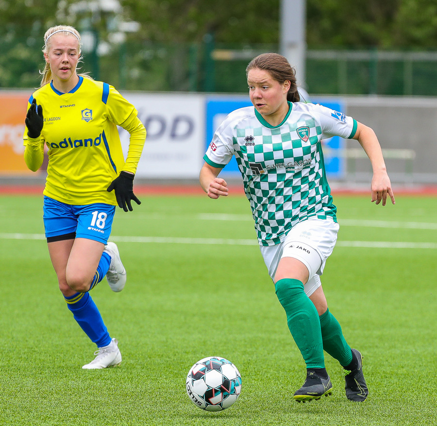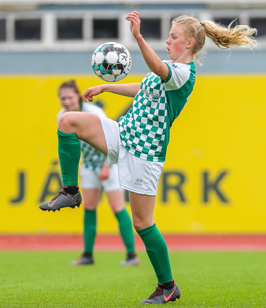 Vigdís fer illa með tvo varnarmenn en í staðinn fyrir að skjóta á markið reynir hún að senda til hliðar en samherji kemst ekki í boltann.