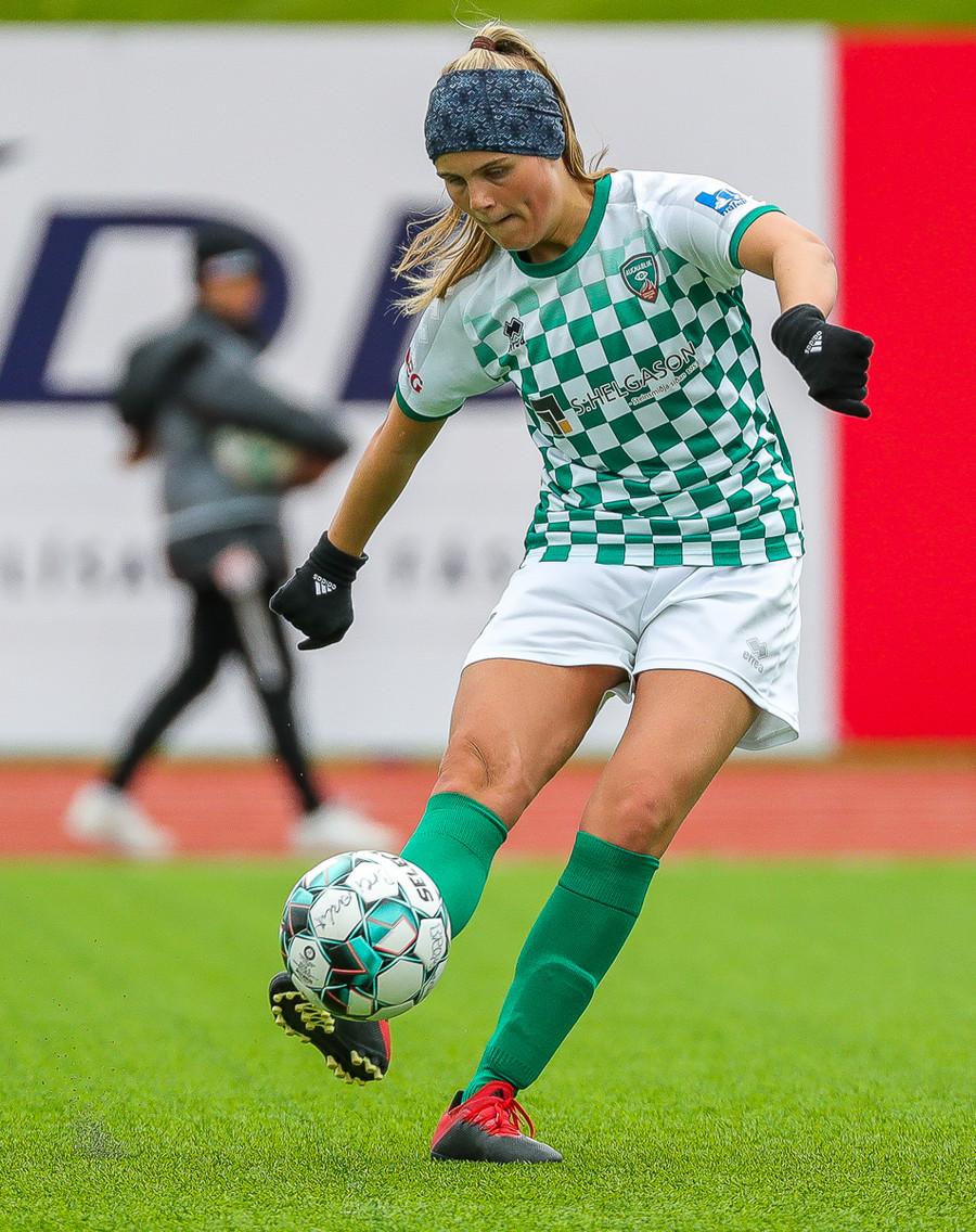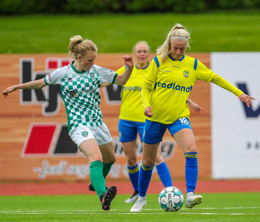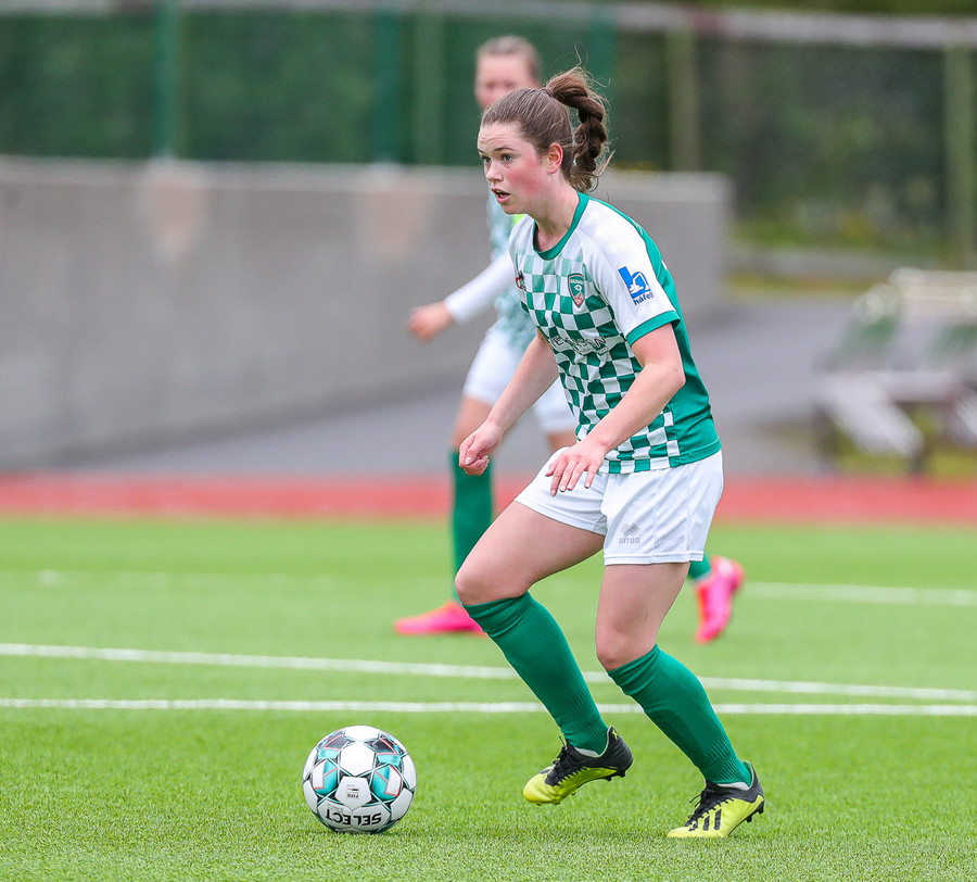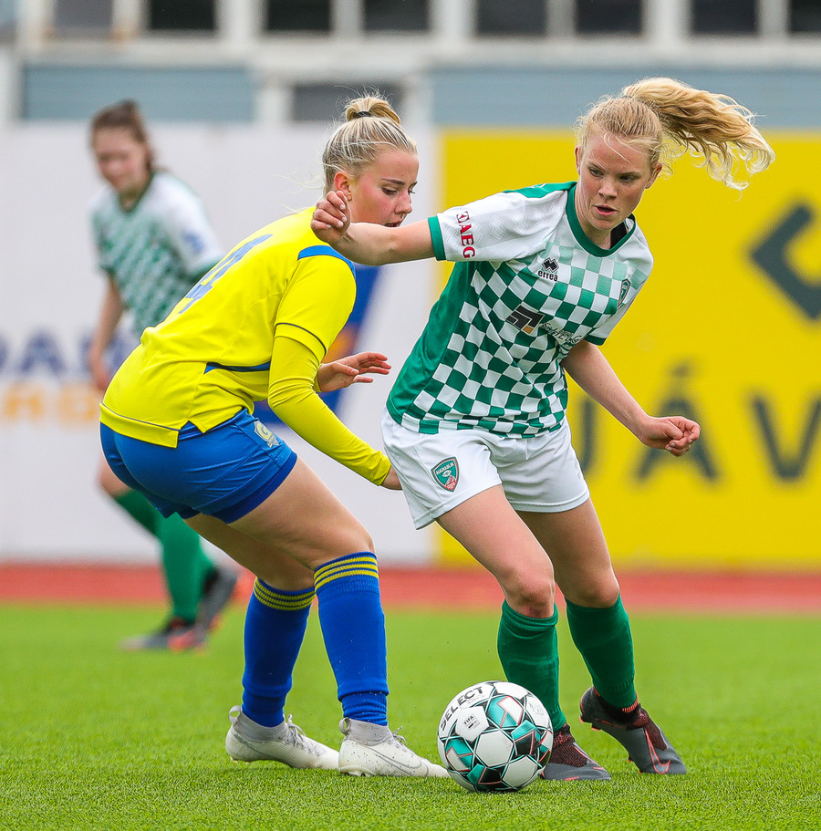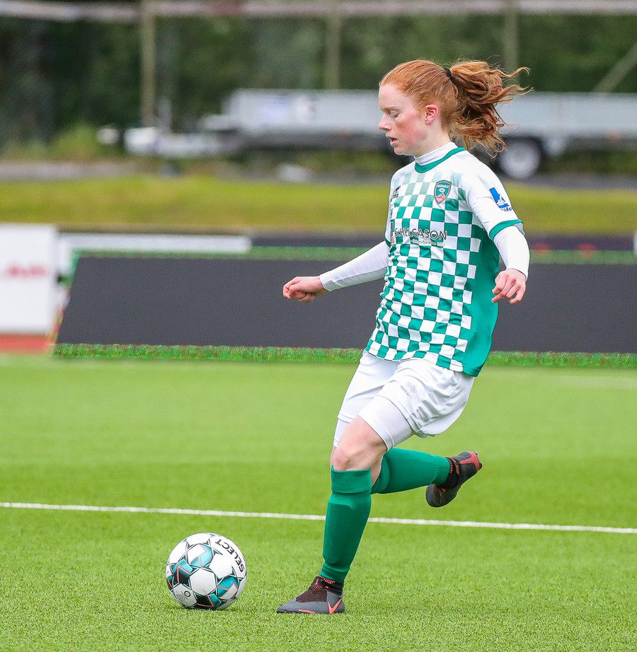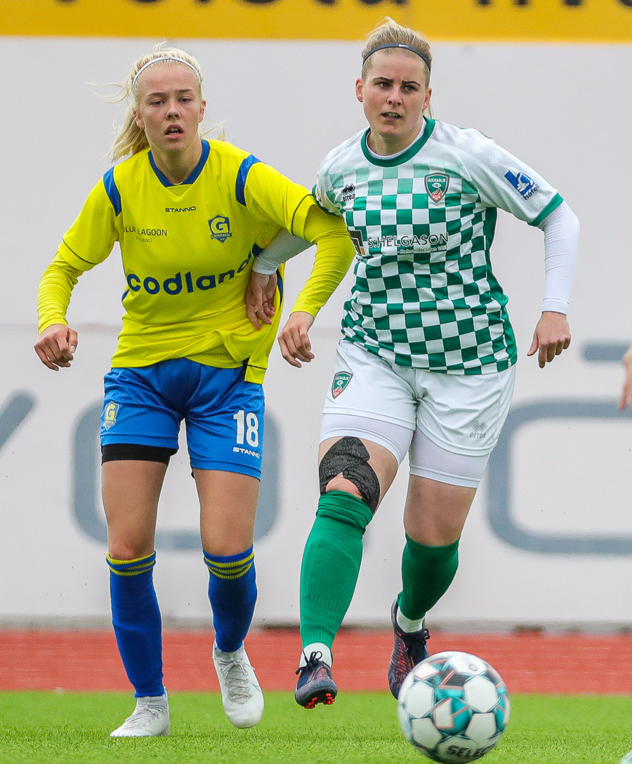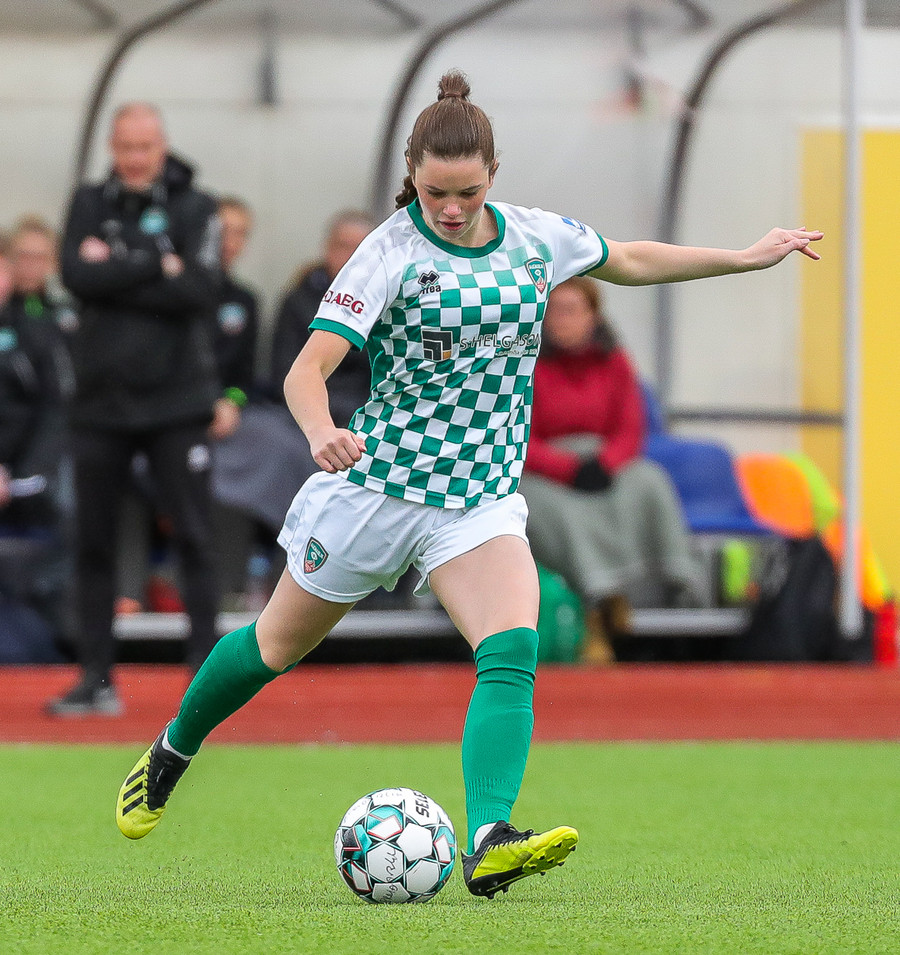 Vigdís fer illa með tvo varnarmenn en í staðinn fyrir að skjóta á markið reynir hún að senda til hliðar en samherji kemst ekki í boltann.