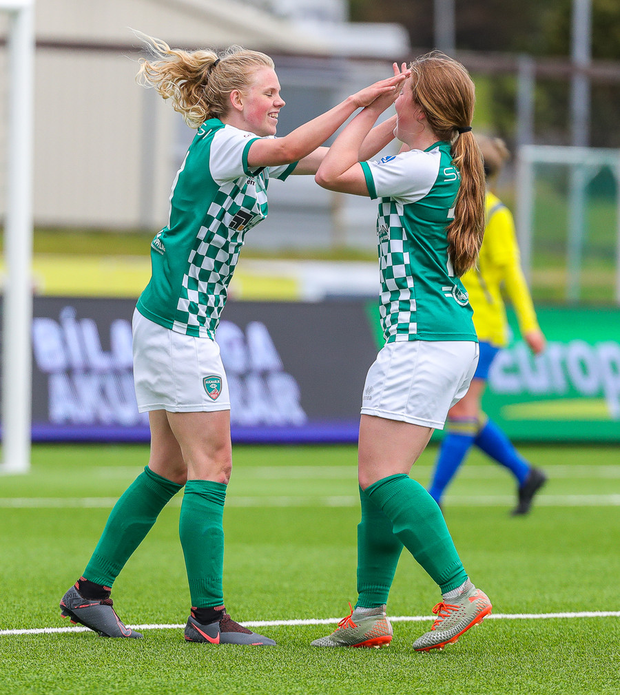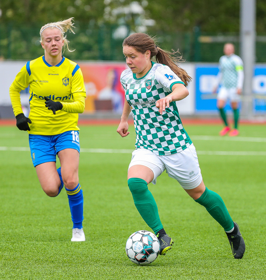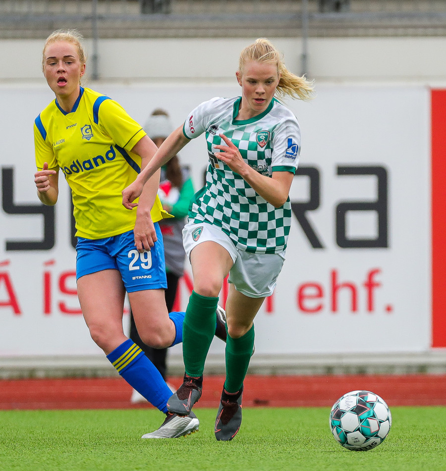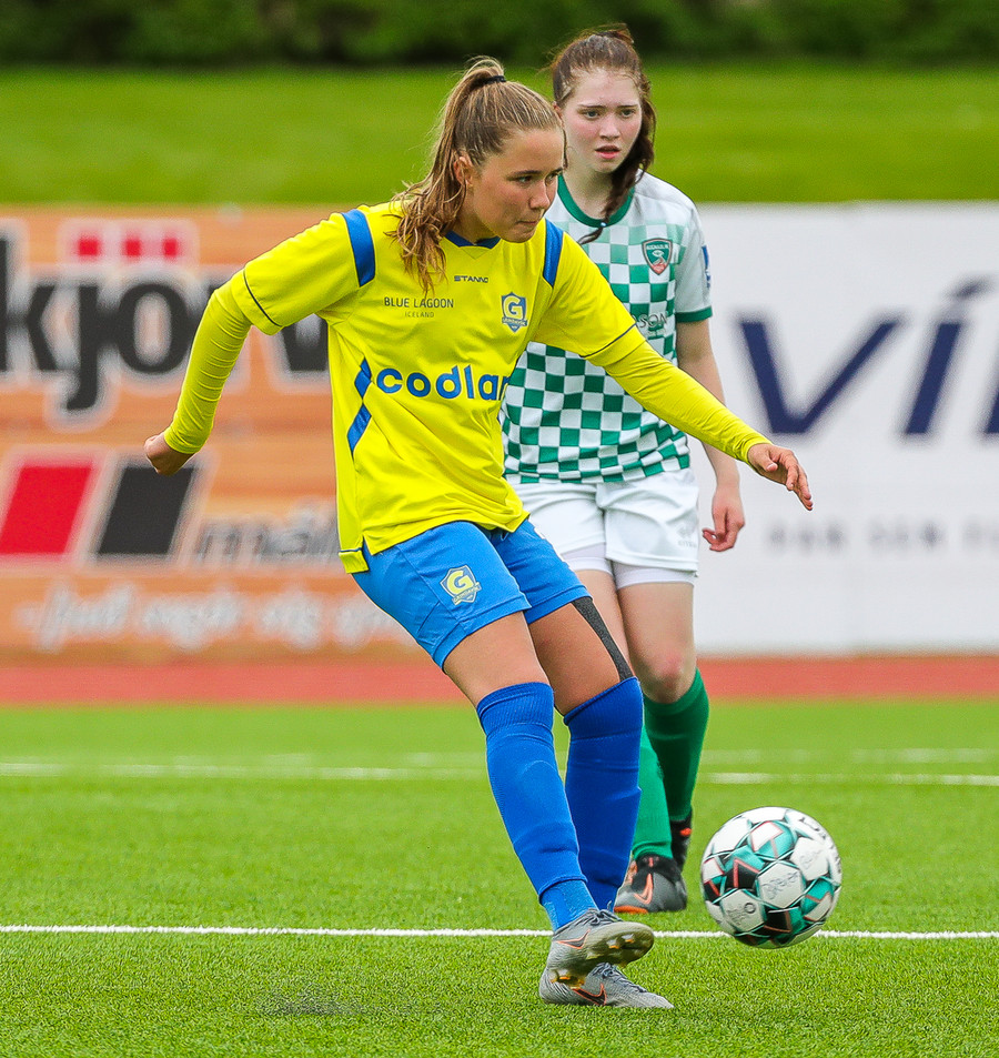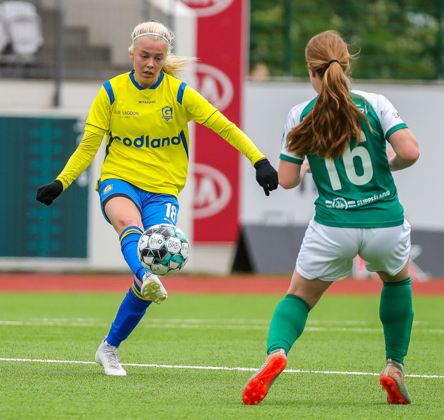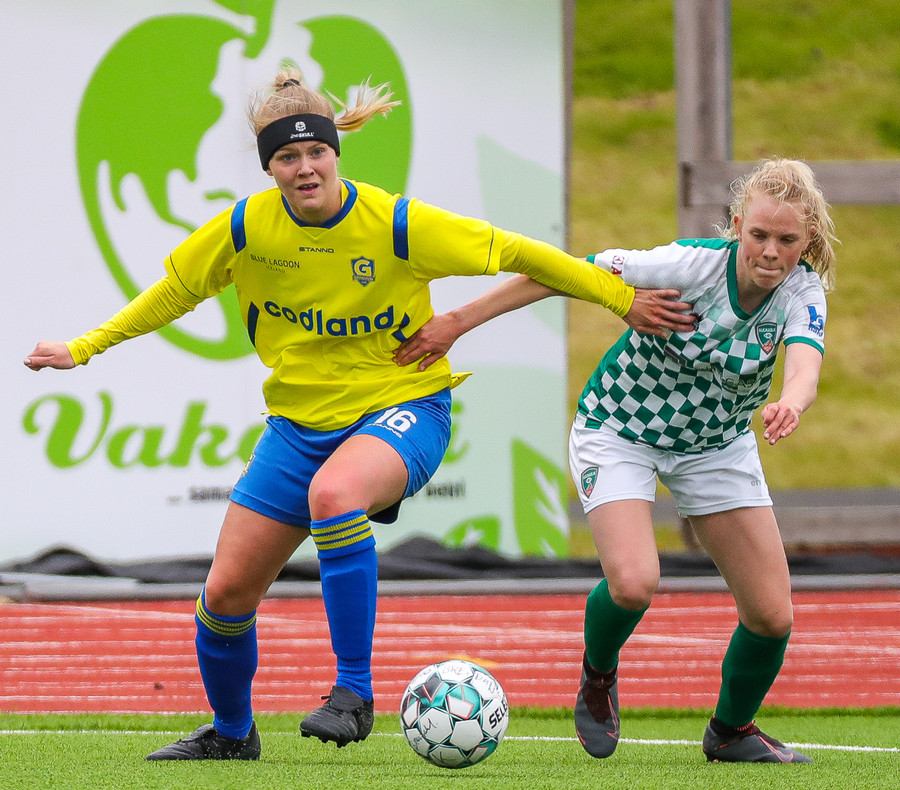 Skemmtilegur samleikur hjá Þórdísi og Björk sem endar með skoti Þórdísar fyrir utan teig en beint á markið.