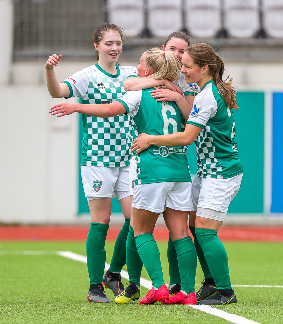 Ísafold tók hornspyrnu frá vinstri beint á hausinn á Hugrúnu Helgadóttur sem skallaði hann í hornið.