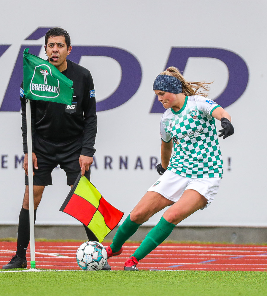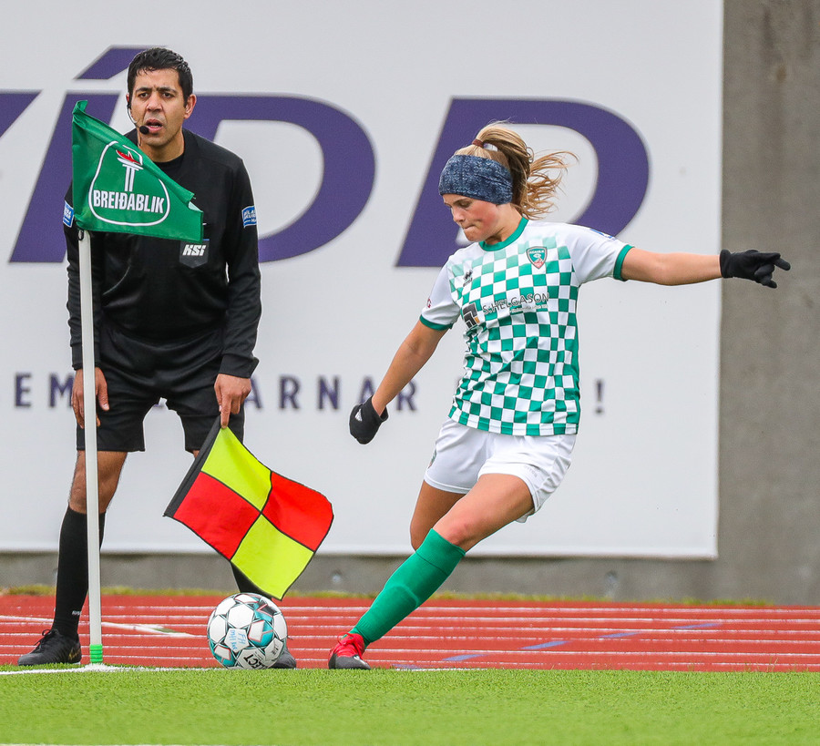 Aftur kemur hornspyrnan frá vinstri frá Ísafold. Aftur berst boltinn til Hugrúnar en hún skýtur á lofti fram hjá.