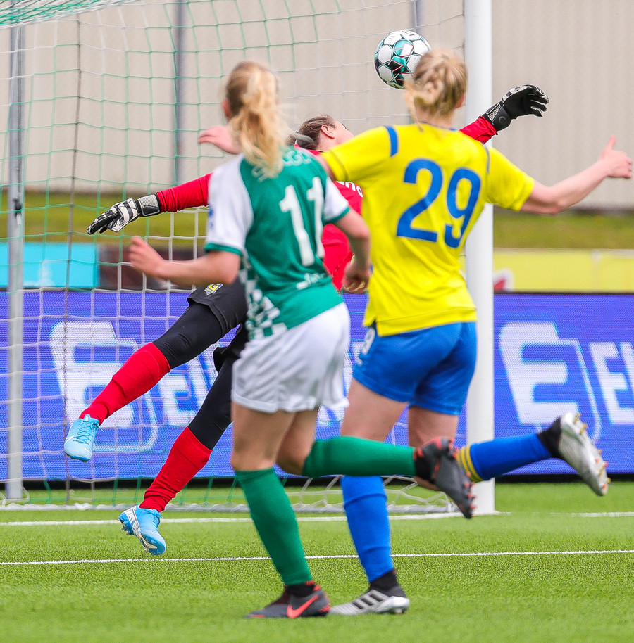 Hornspyrnan frá Ísafold ratar enn og aftur á samherja. Frábærar spyrnur. Elín skallar yfir.