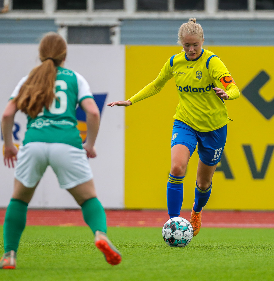 Þvílíkir yfirburðir í seinni hálfleik! Nú fær Vigdís boltann inn í teig, Veronica kemur á móti henni. Vigdís leggur boltann á Ísafold sem á skotið en Grindvíkingar bjarga á línu.