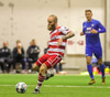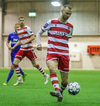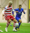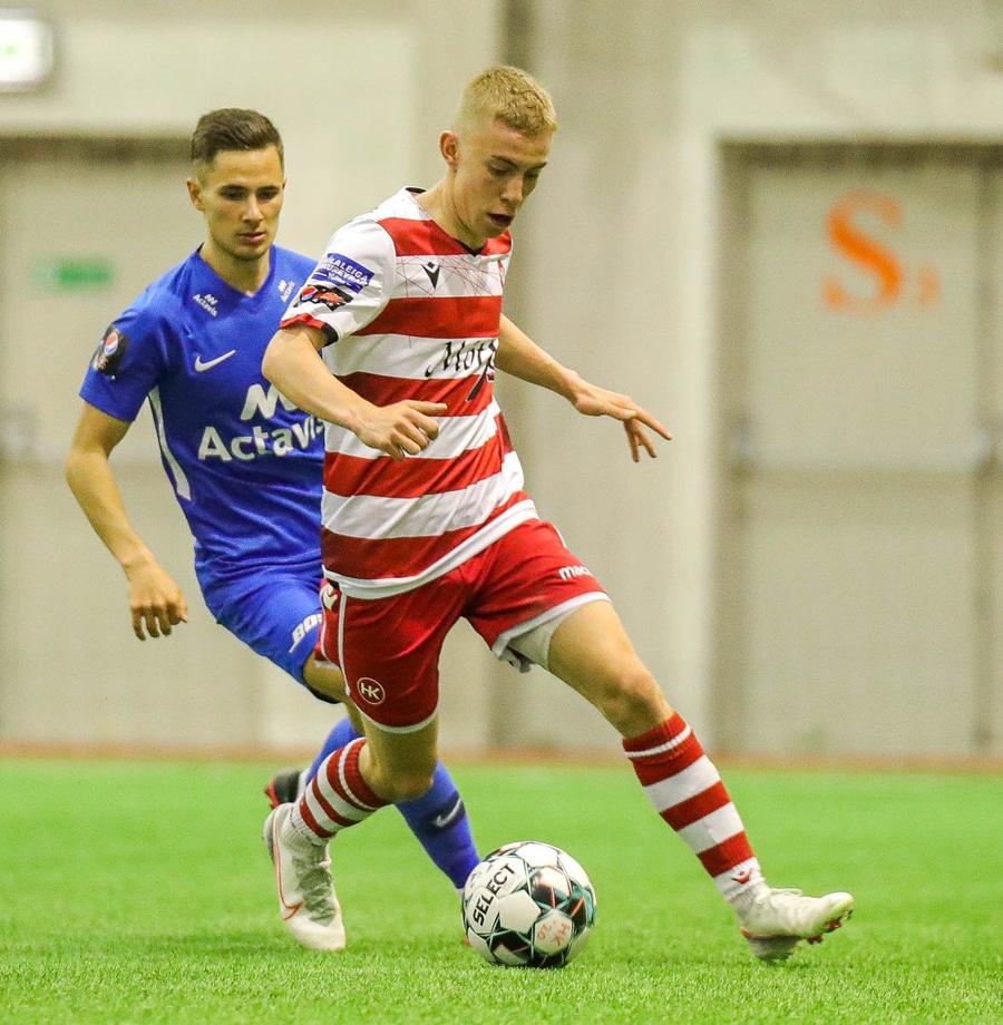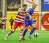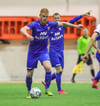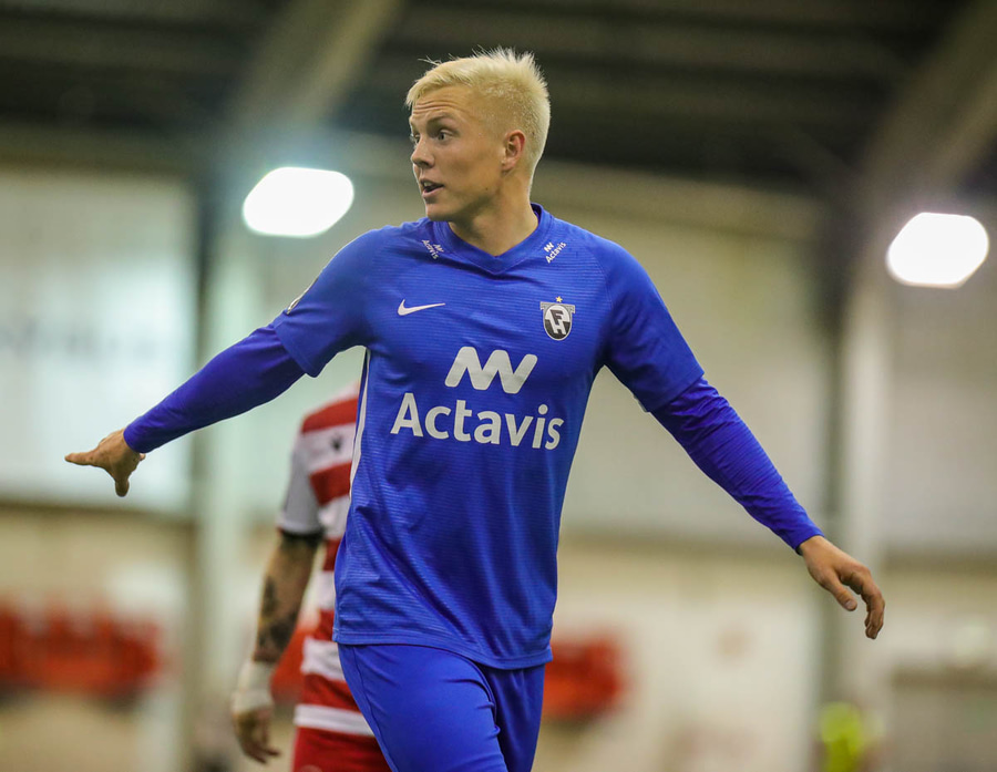 Atli Guðna með sendingu inn fyrir og Lennon stingur sér fram fyrir Alexander Frey og leggur hann með hægri í fjær...