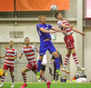 Ásgeir með hornspyrnu inn á teig en Gunnar gerir vel í markinu og handsamar knöttinn..
