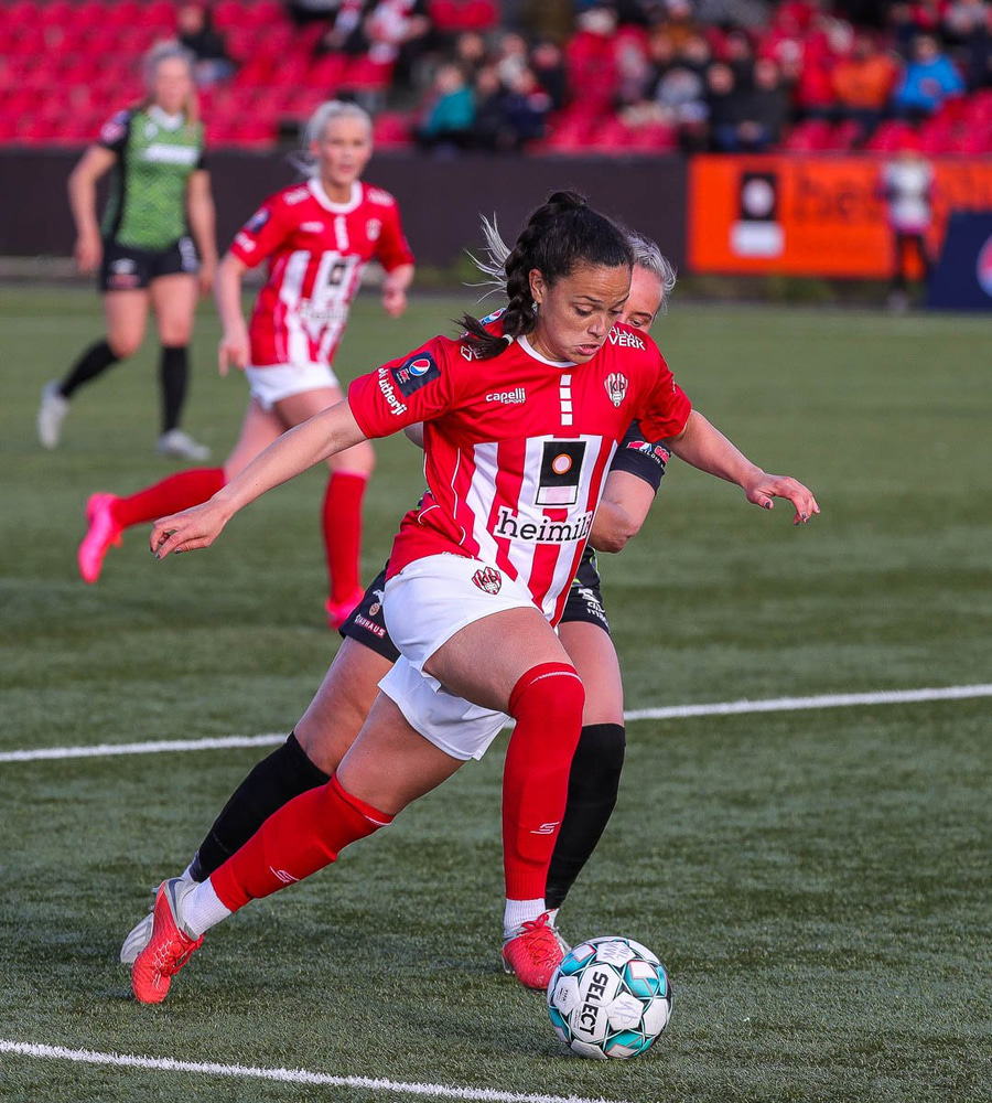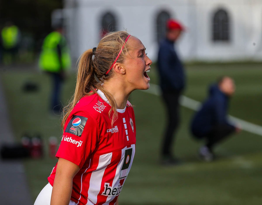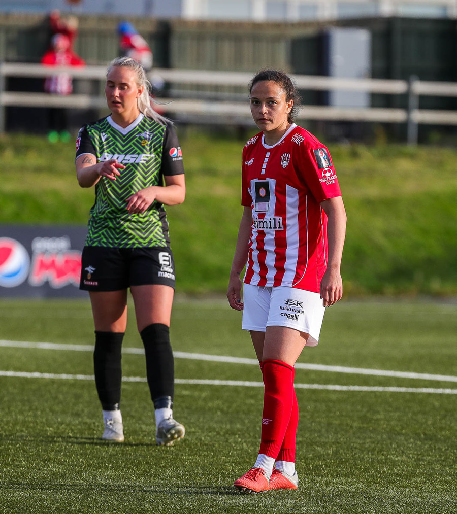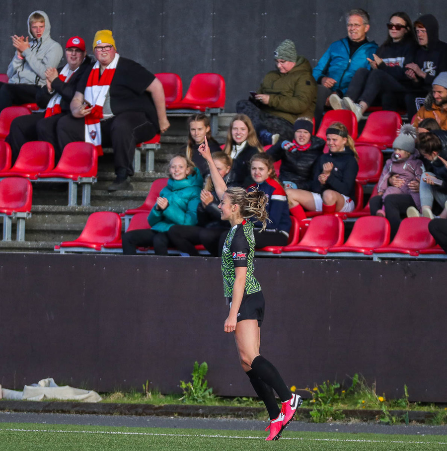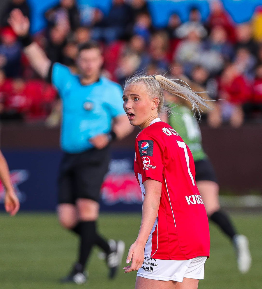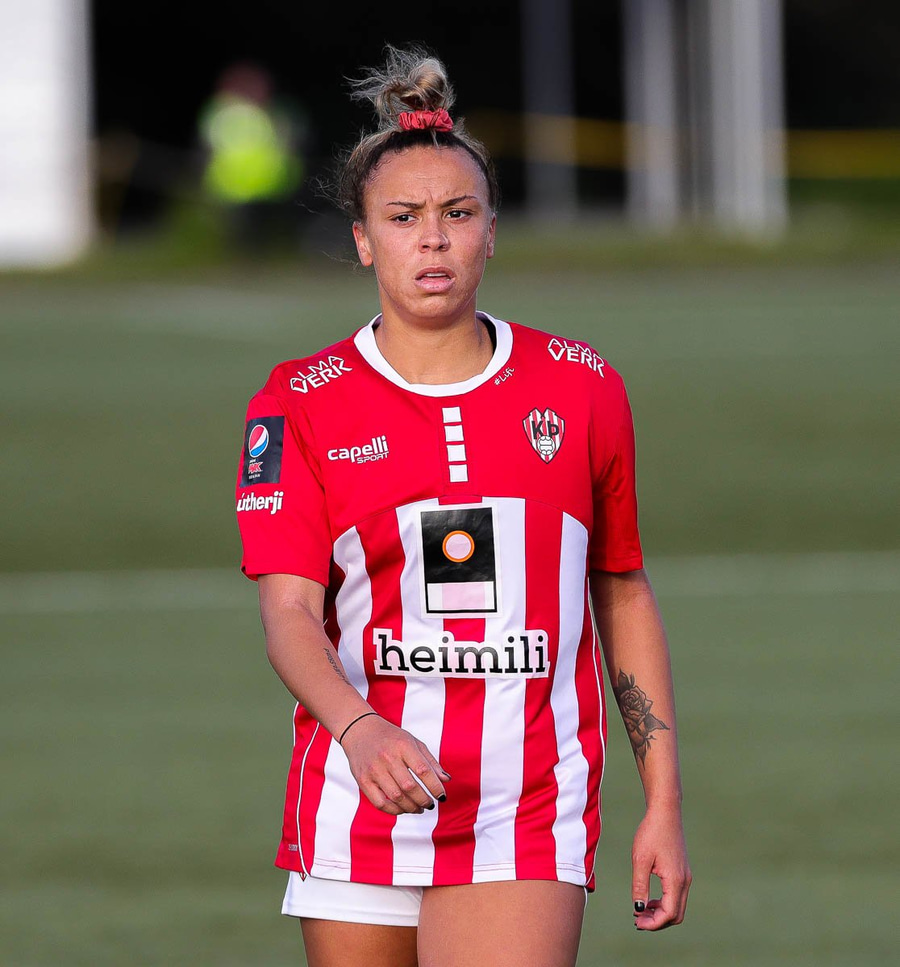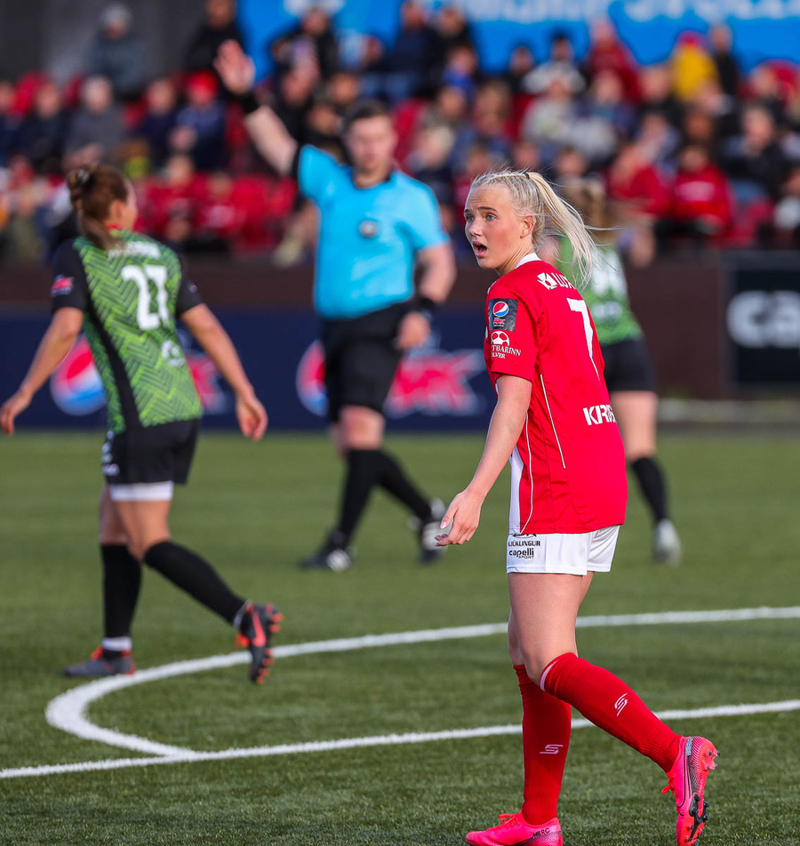 Nú fær Bergdís Fanney spjald. Brýtur úti við hliðarlínu.