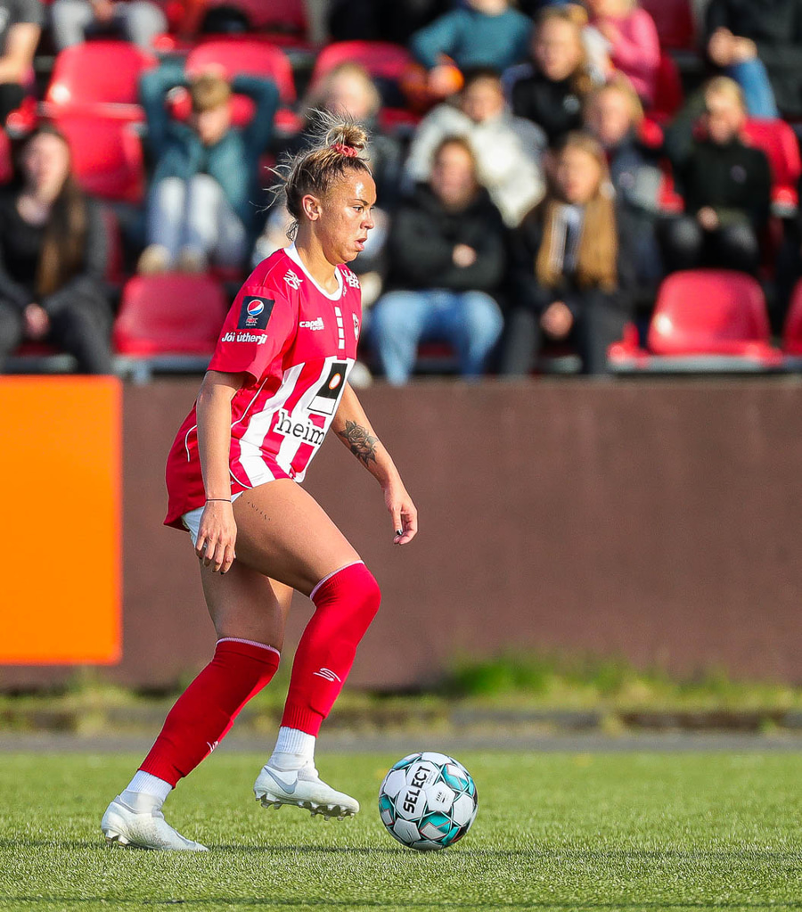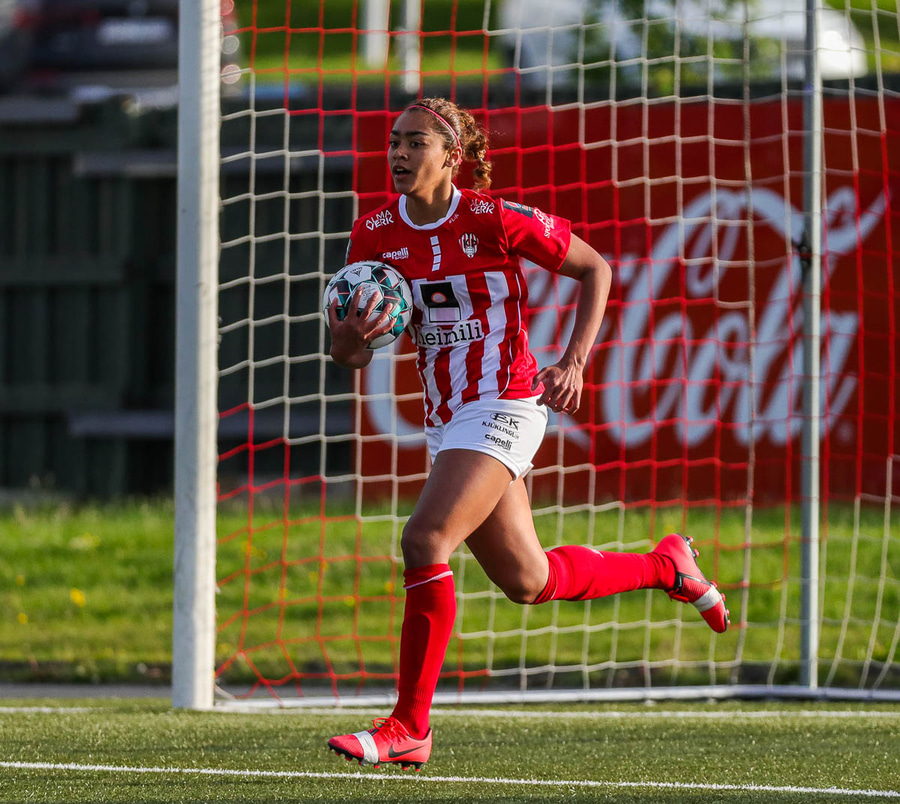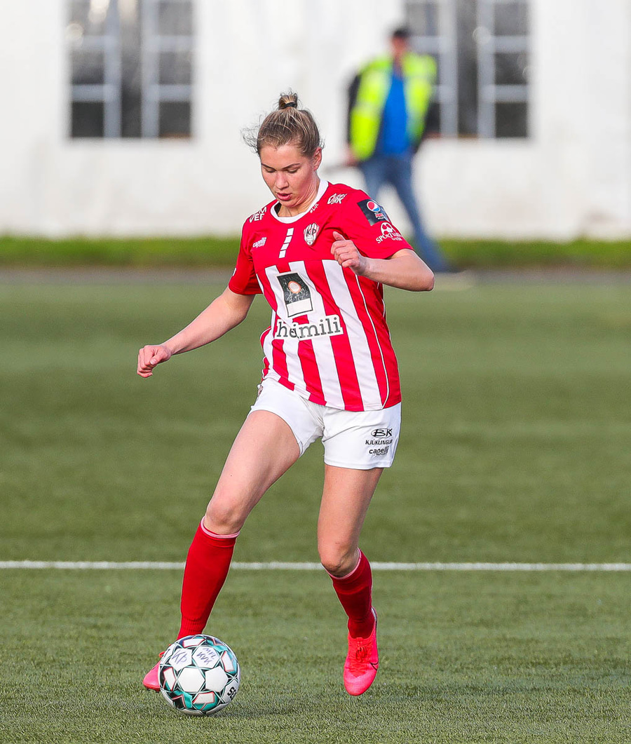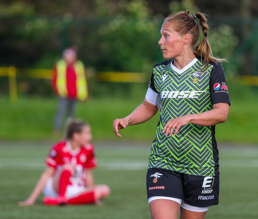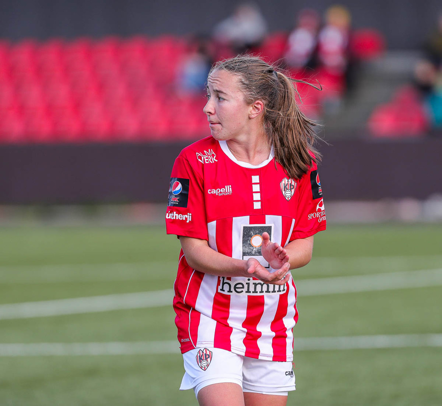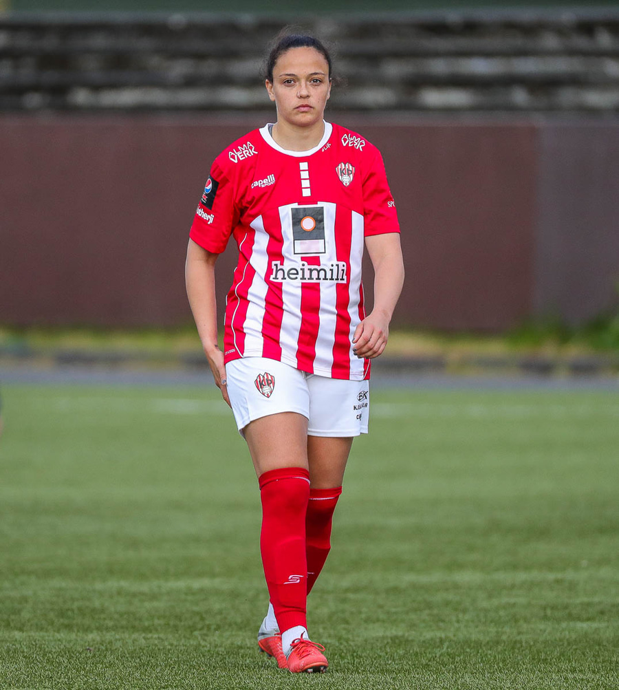 Nú fær Bergdís Fanney spjald. Brýtur úti við hliðarlínu.