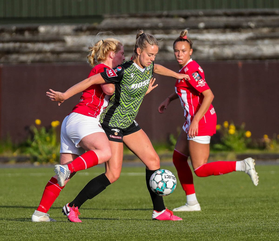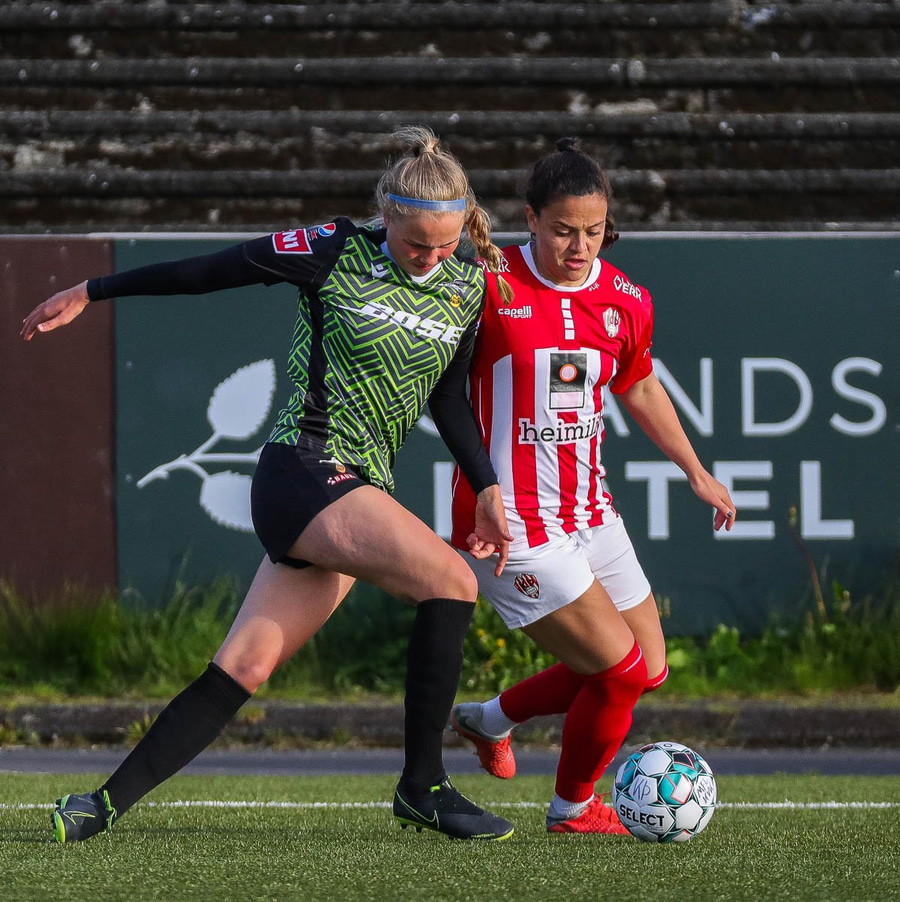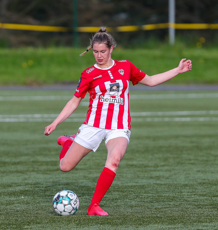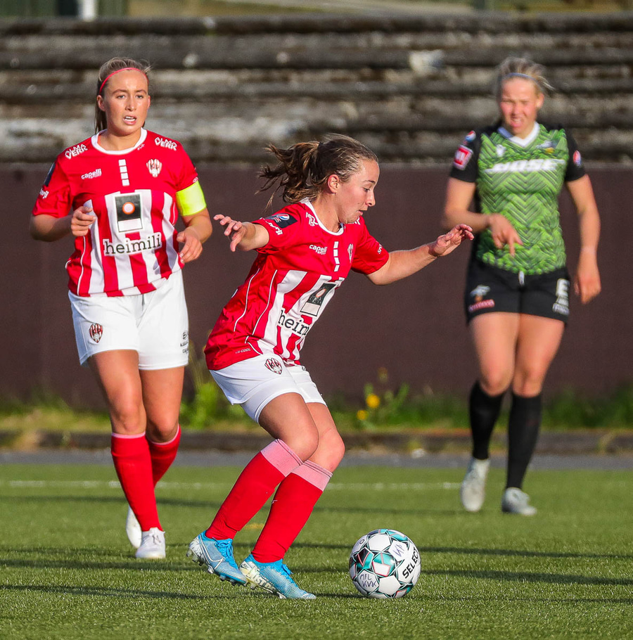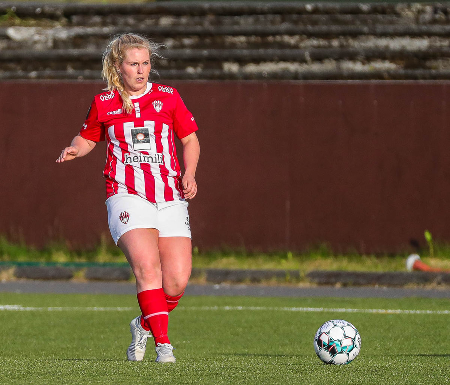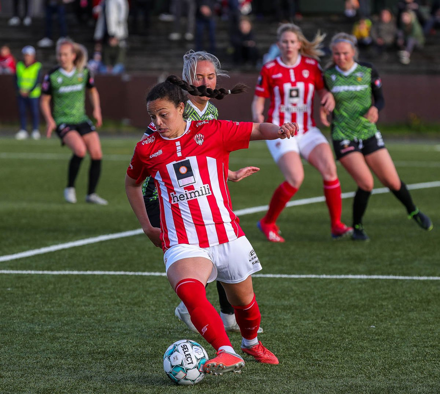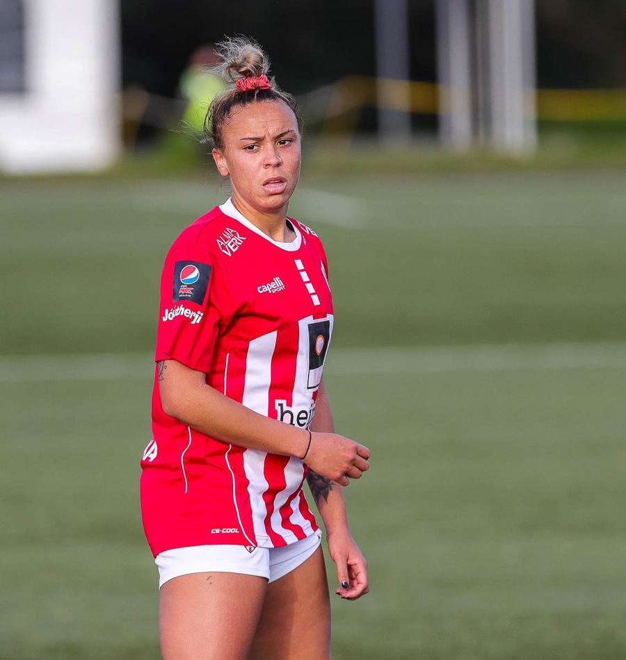 Nú fær Bergdís Fanney spjald. Brýtur úti við hliðarlínu.