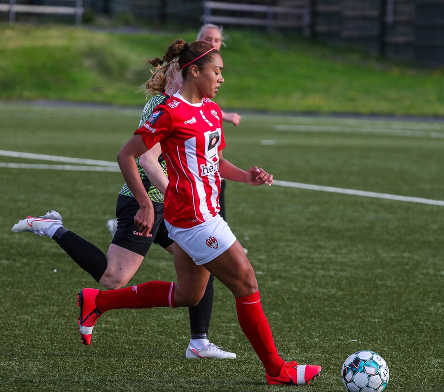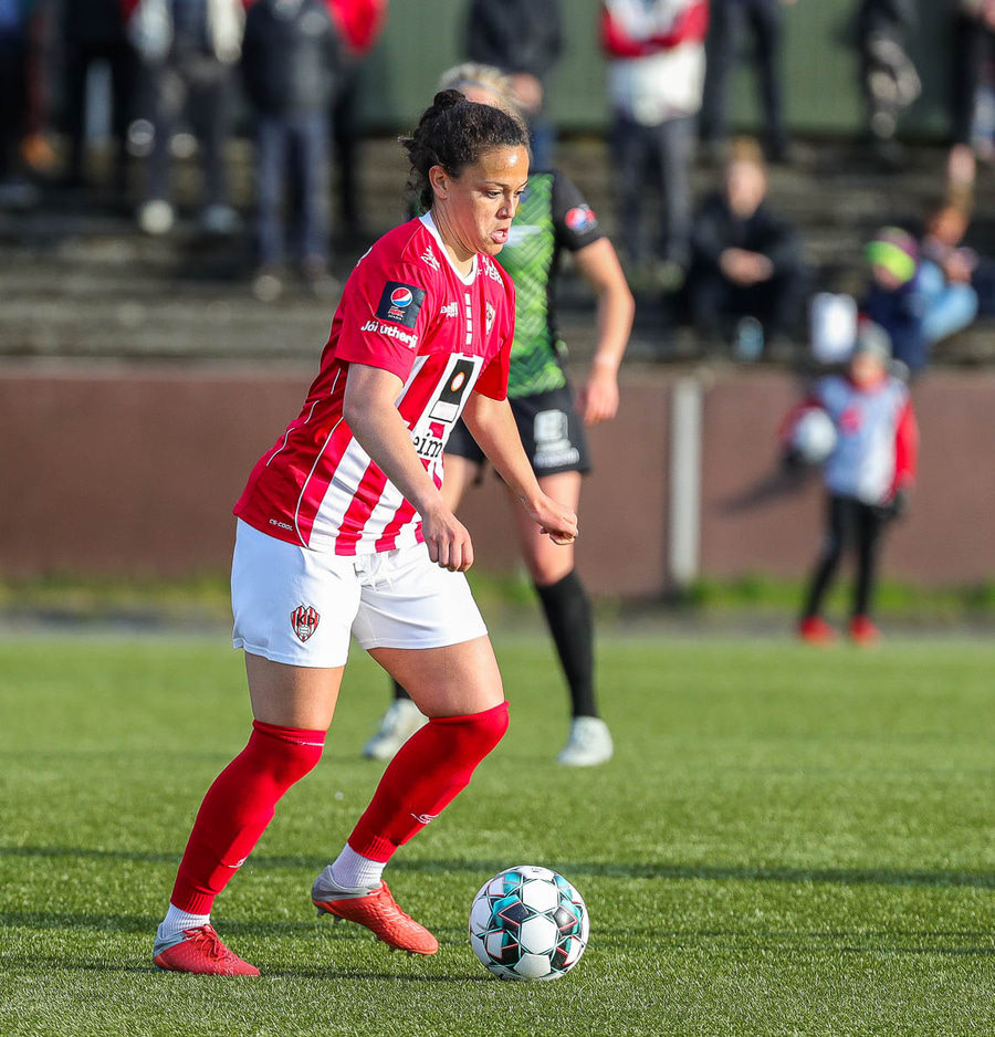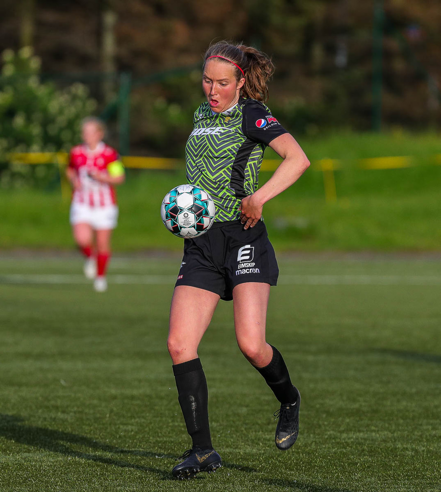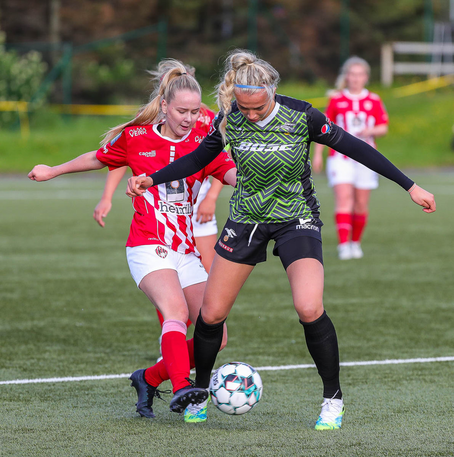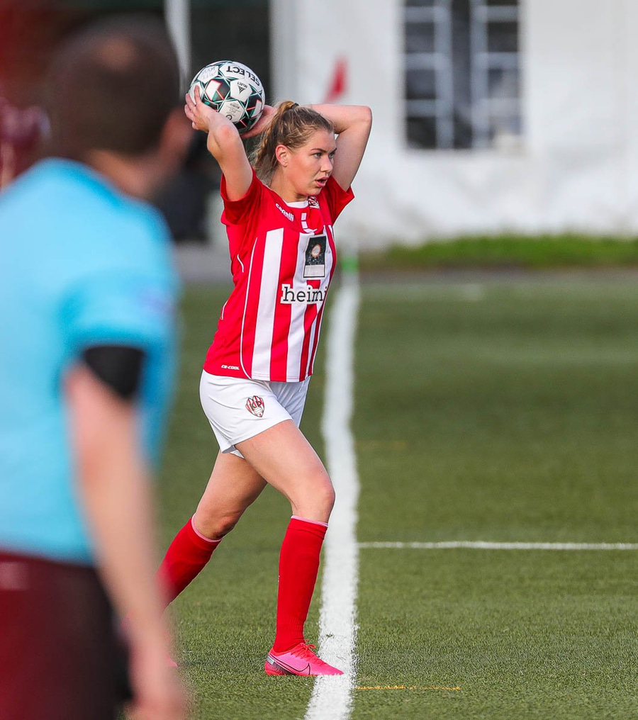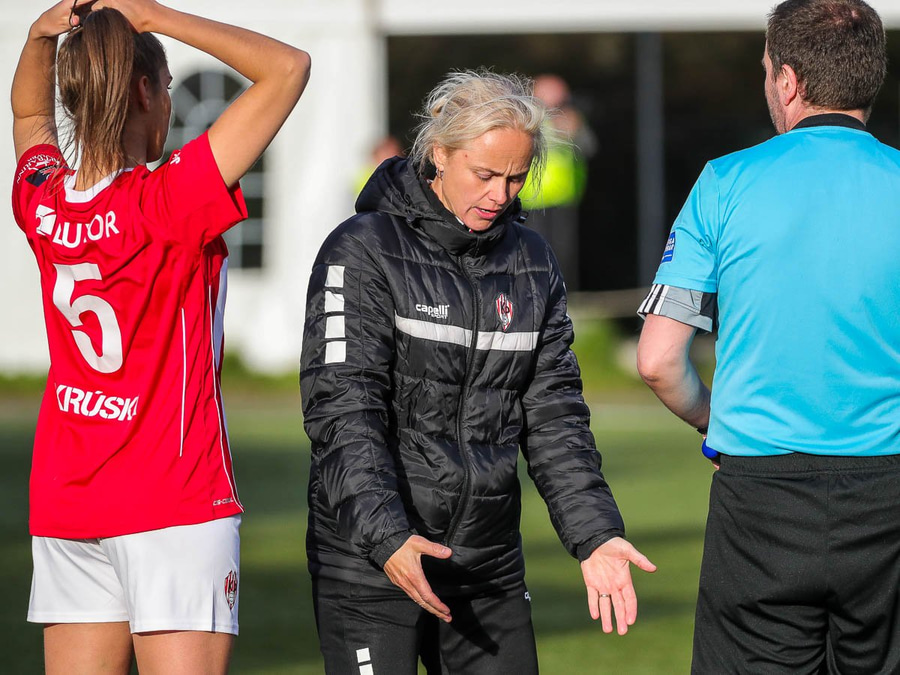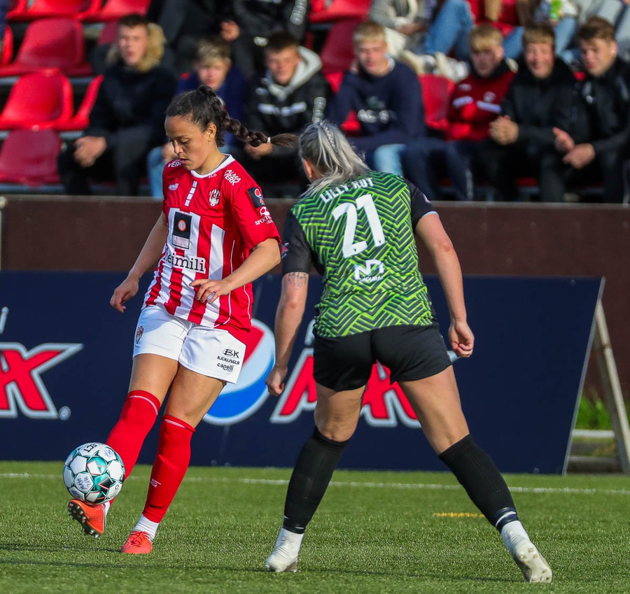 Nú fær Bergdís Fanney spjald. Brýtur úti við hliðarlínu.