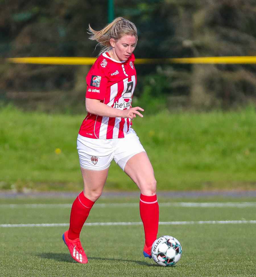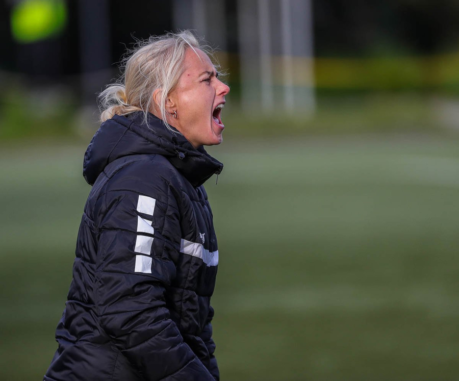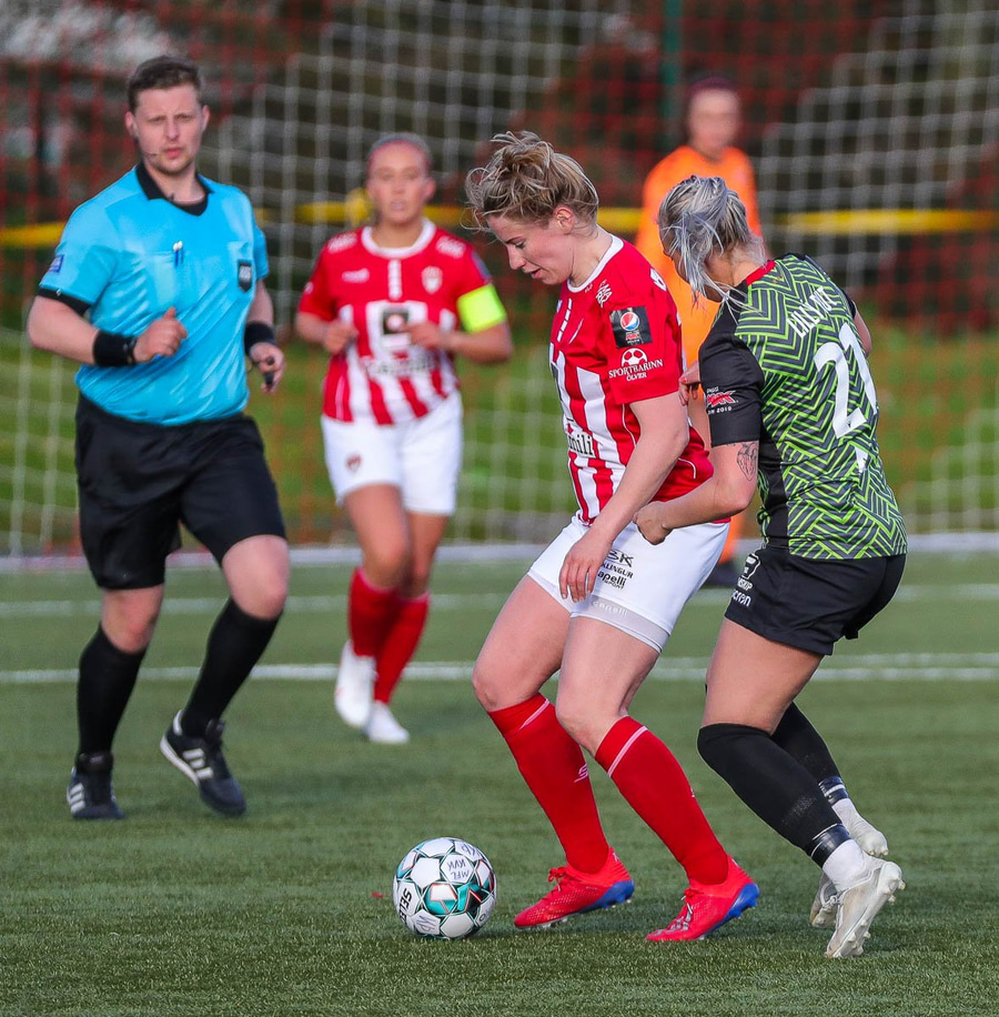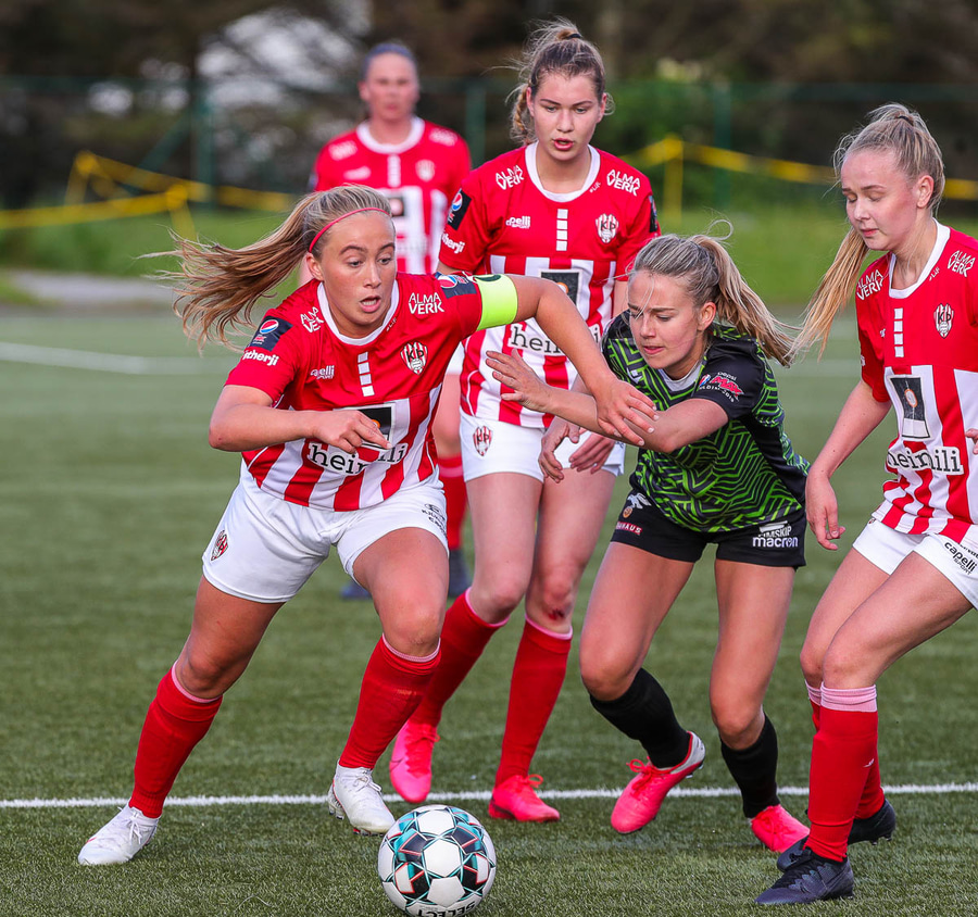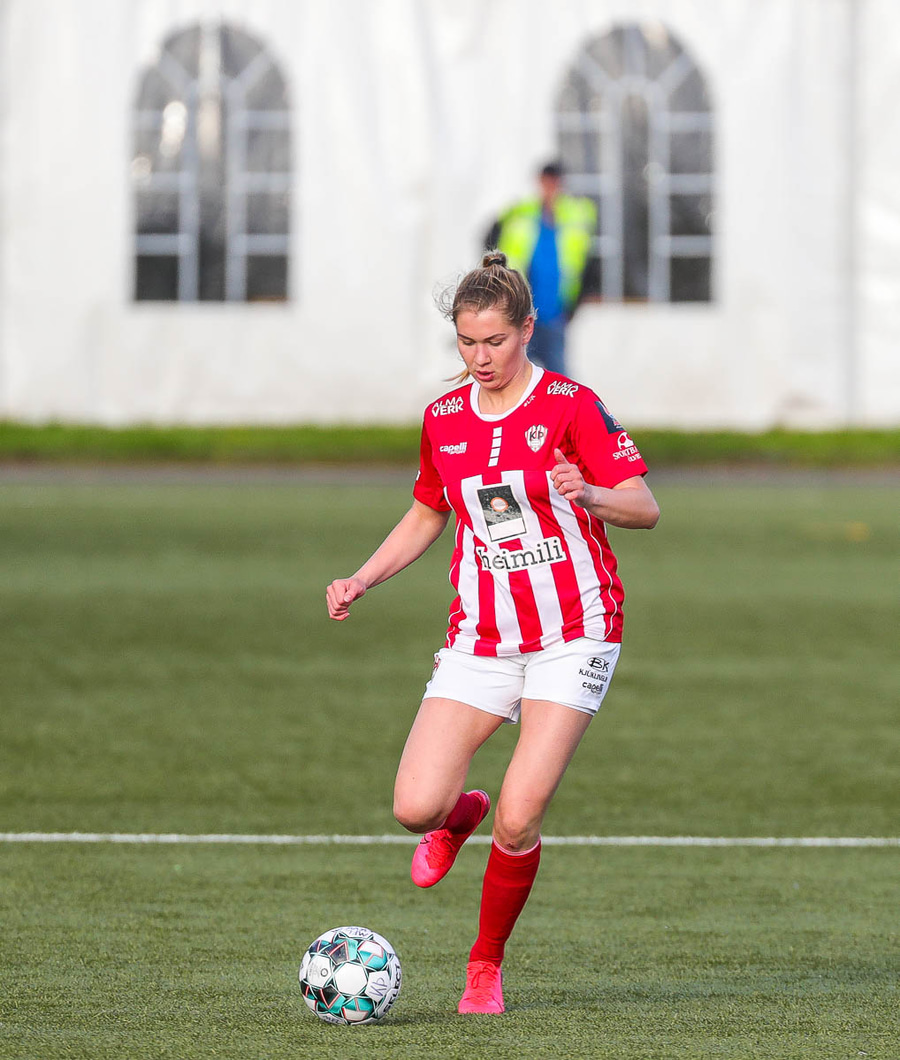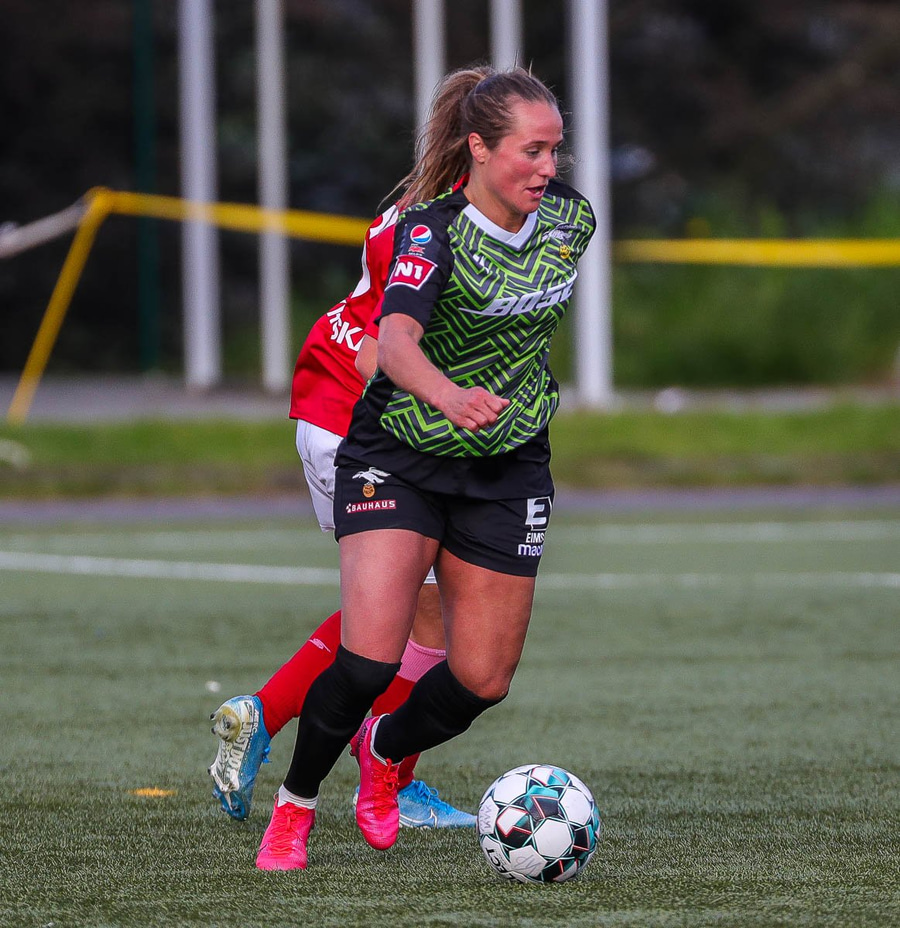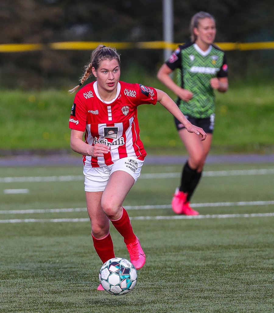 Nú fær Bergdís Fanney spjald. Brýtur úti við hliðarlínu.