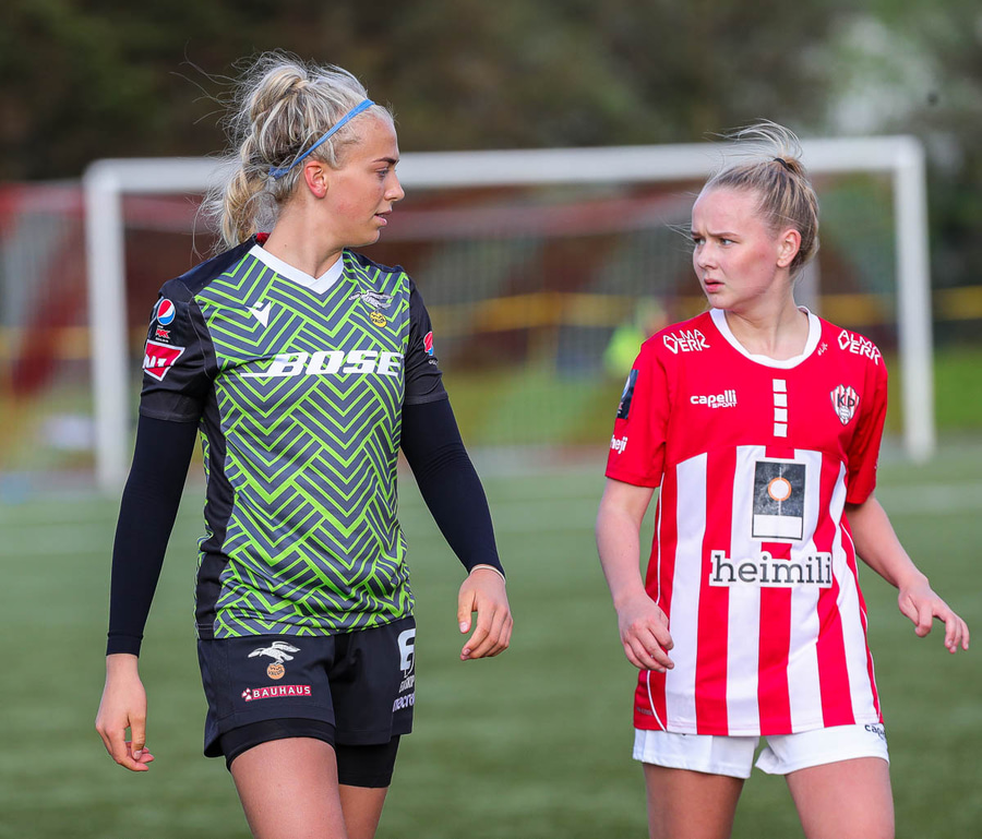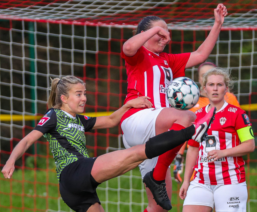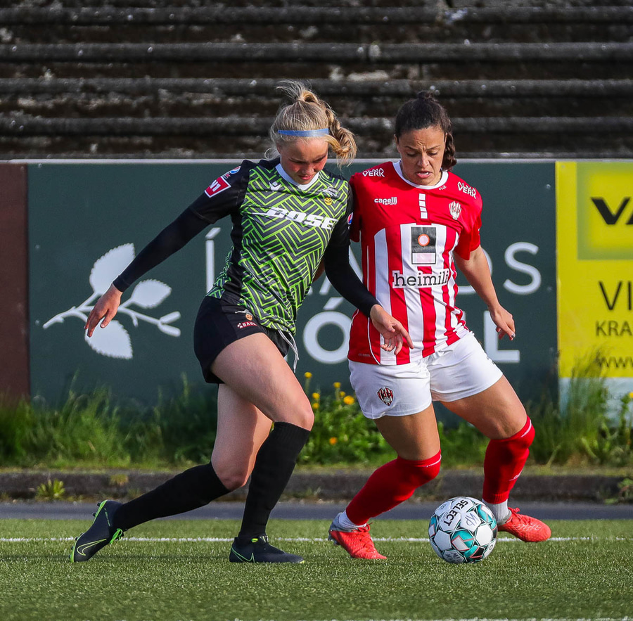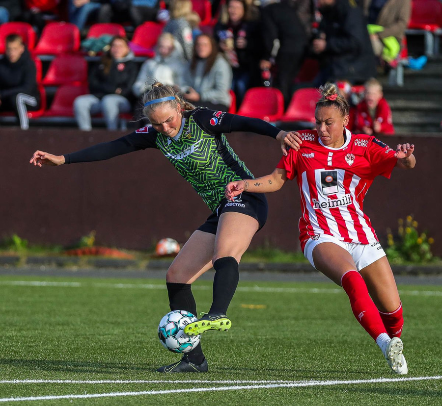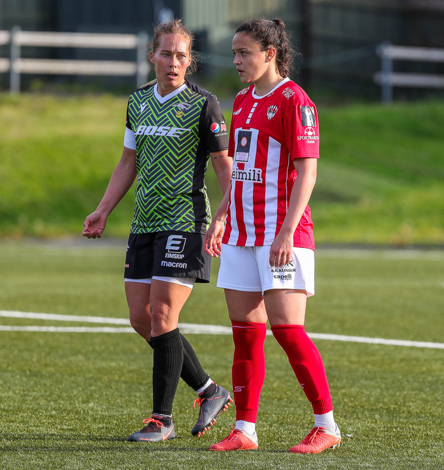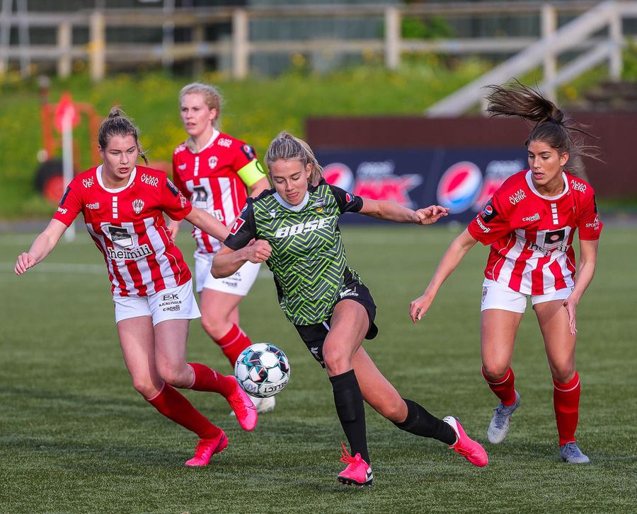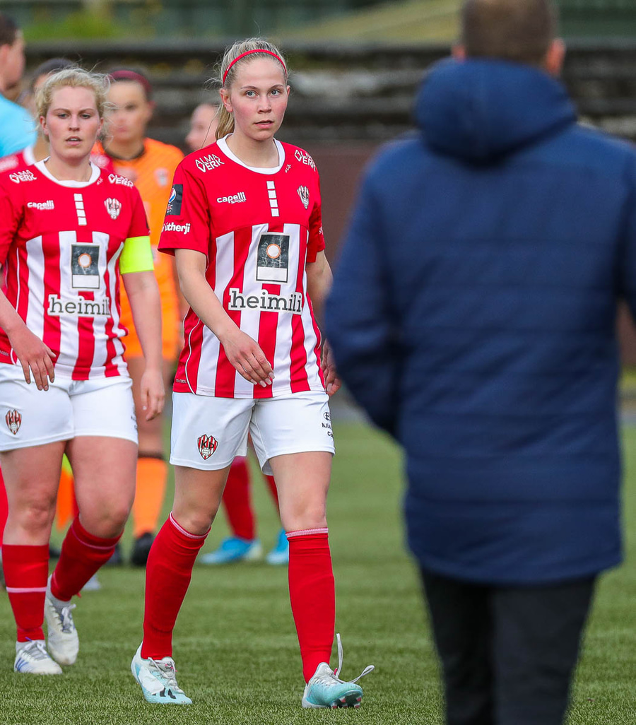 Bergdís Fanney er of sein í tæklingu á Sóley en sleppur við spjald. Svo virðist sem Helgi ætli bara að spjalda fyrir tuð í kvöld.