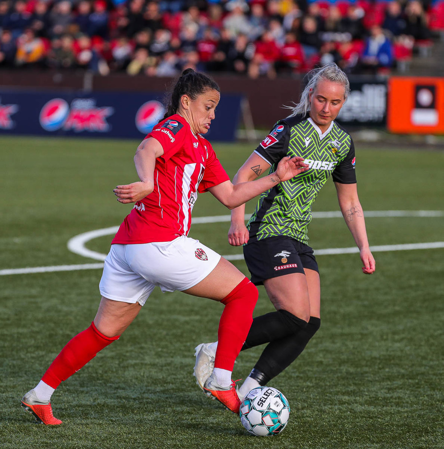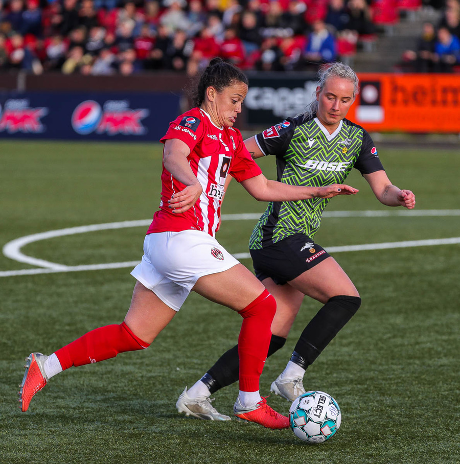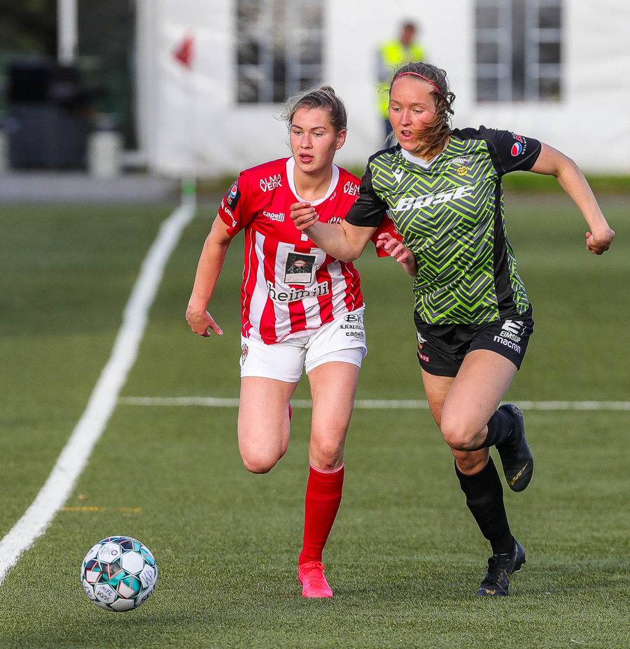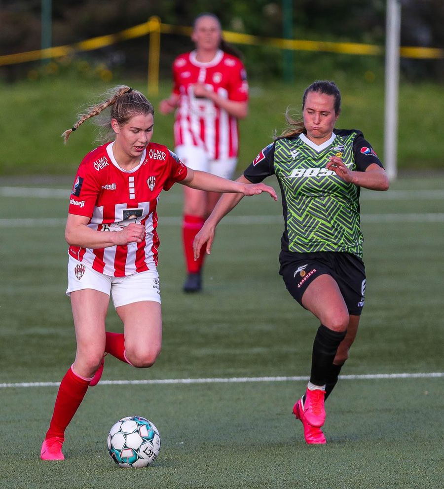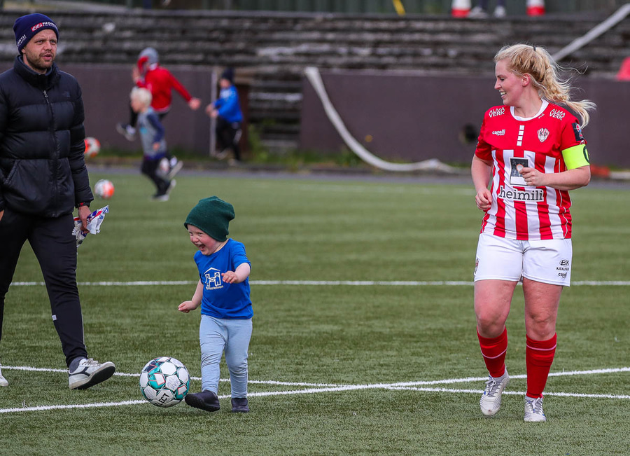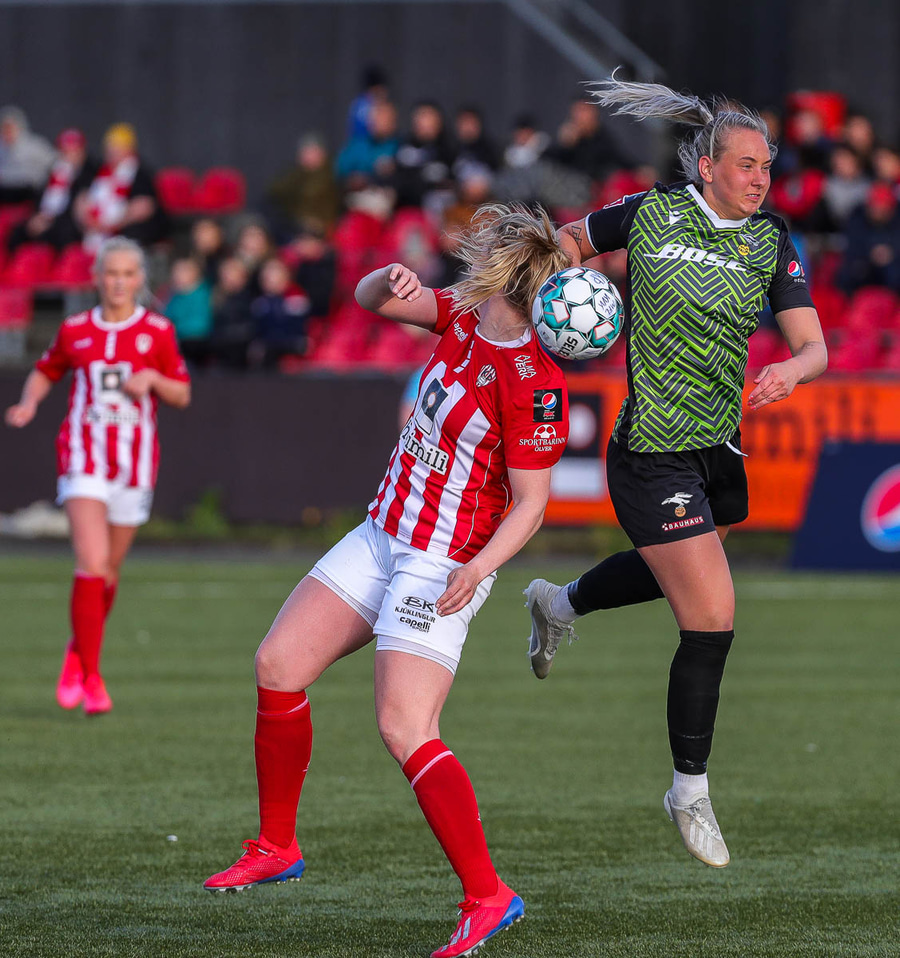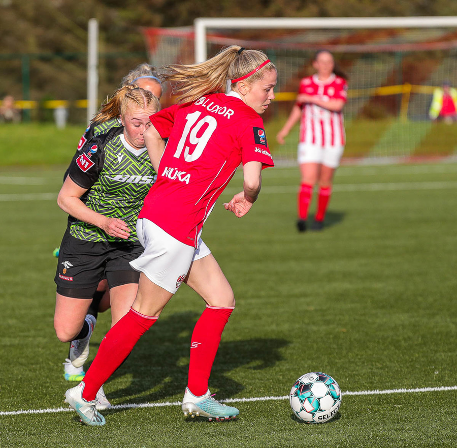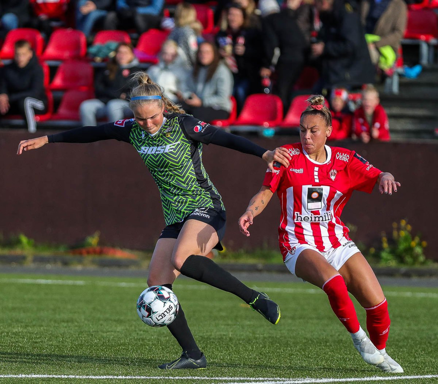 Bergdís Fanney er of sein í tæklingu á Sóley en sleppur við spjald. Svo virðist sem Helgi ætli bara að spjalda fyrir tuð í kvöld.