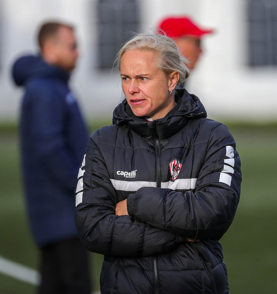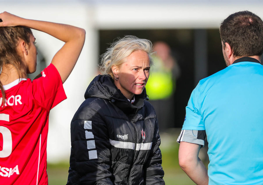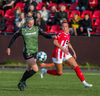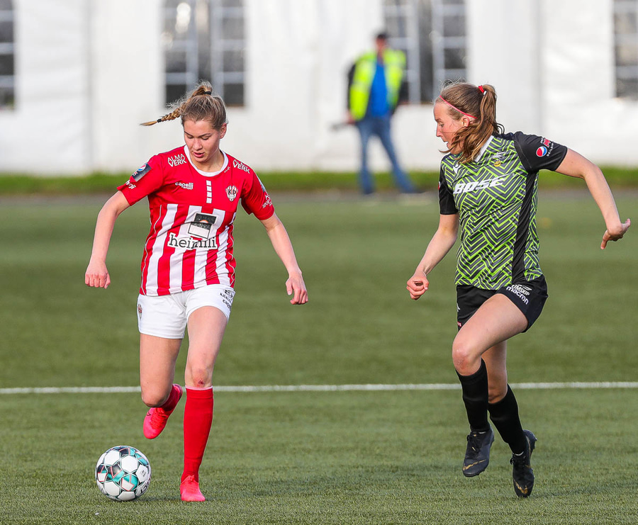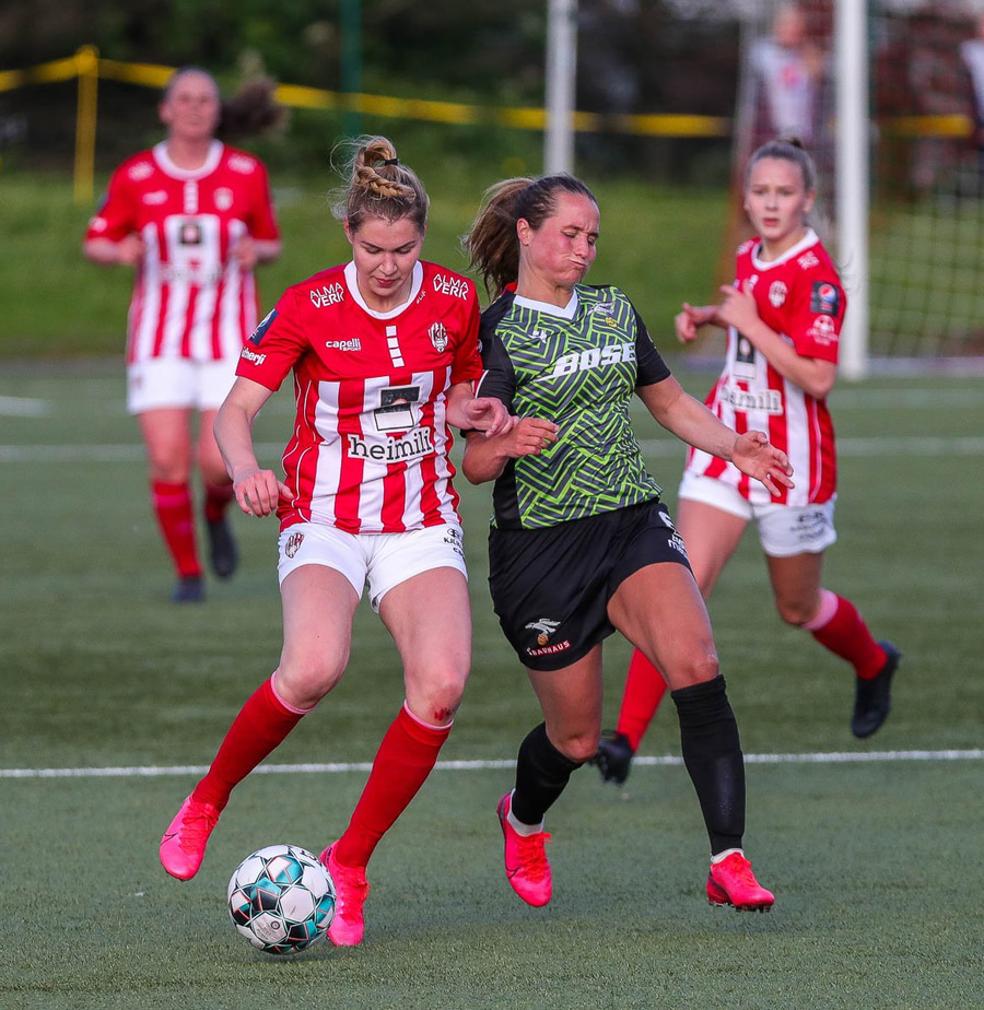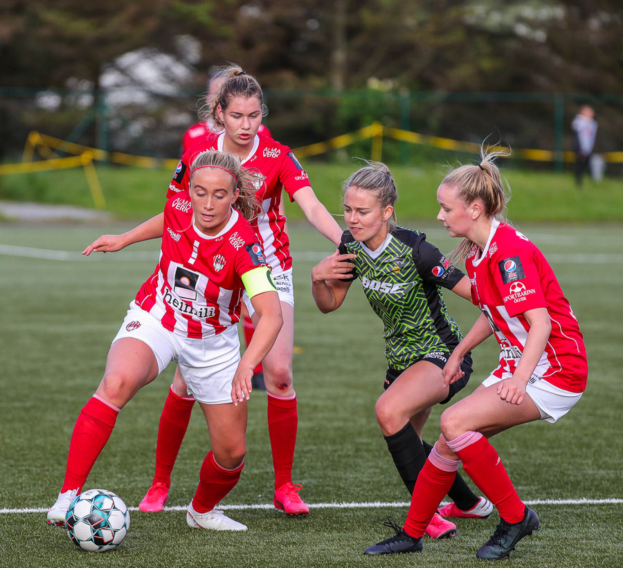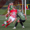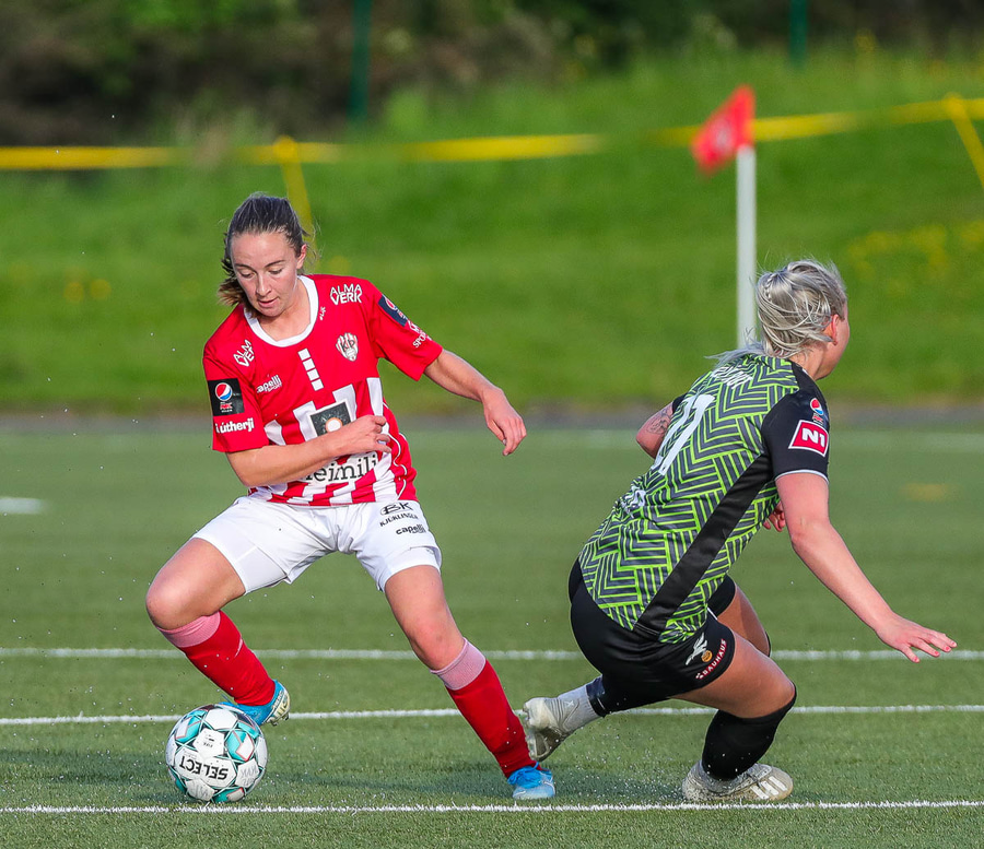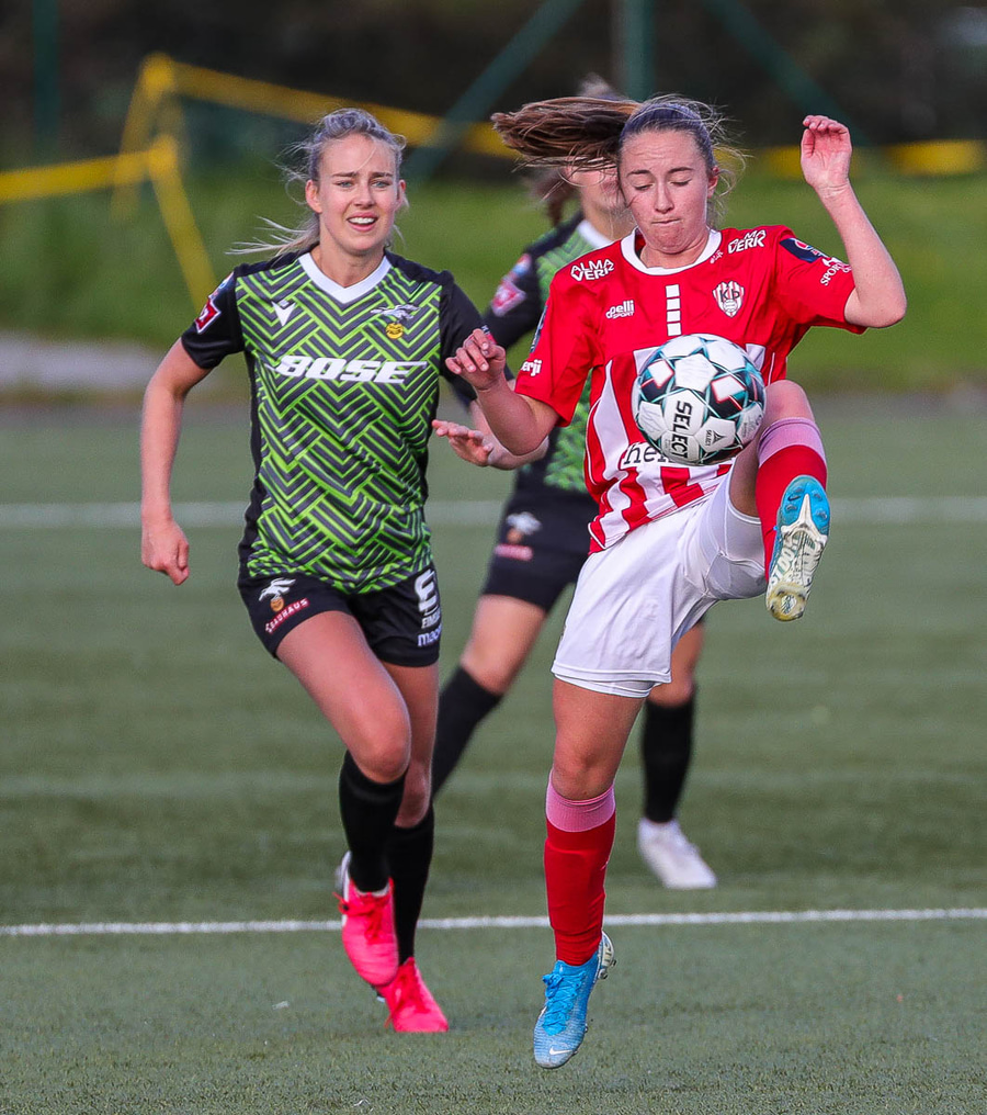 Bergdís Fanney er of sein í tæklingu á Sóley en sleppur við spjald. Svo virðist sem Helgi ætli bara að spjalda fyrir tuð í kvöld.