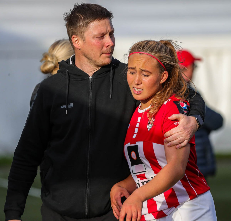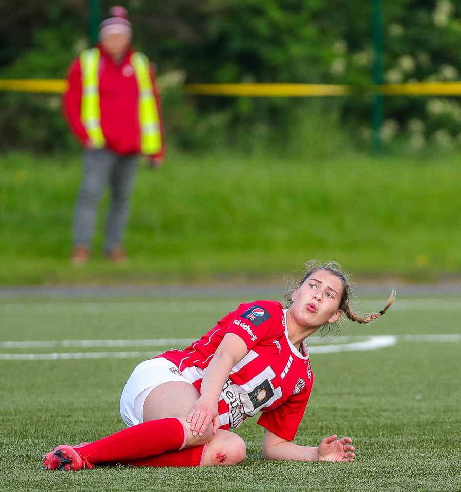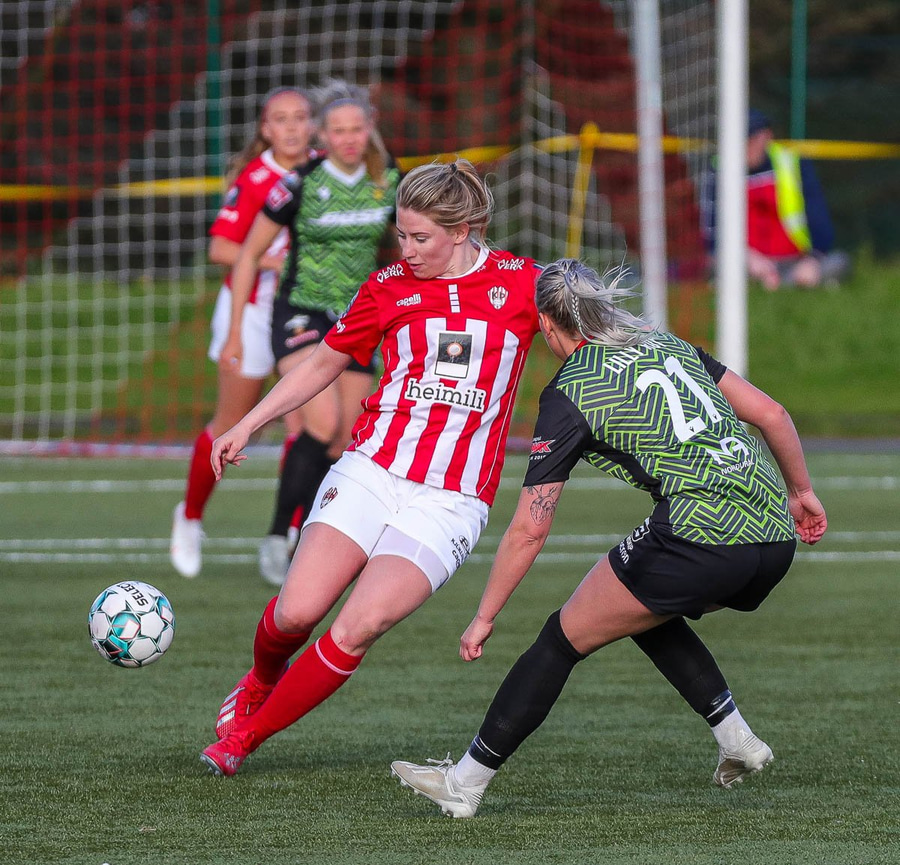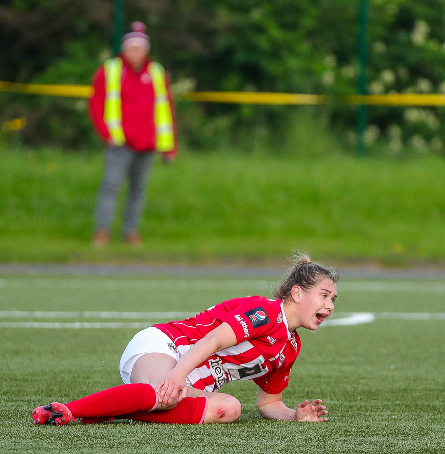 Þetta var fullharkalegt hjá Margréti. Keyrir Guðnýju niður í baráttu úti í vinstra horni. Guðný liggur eftir. Margrét sleppur við spjald.
