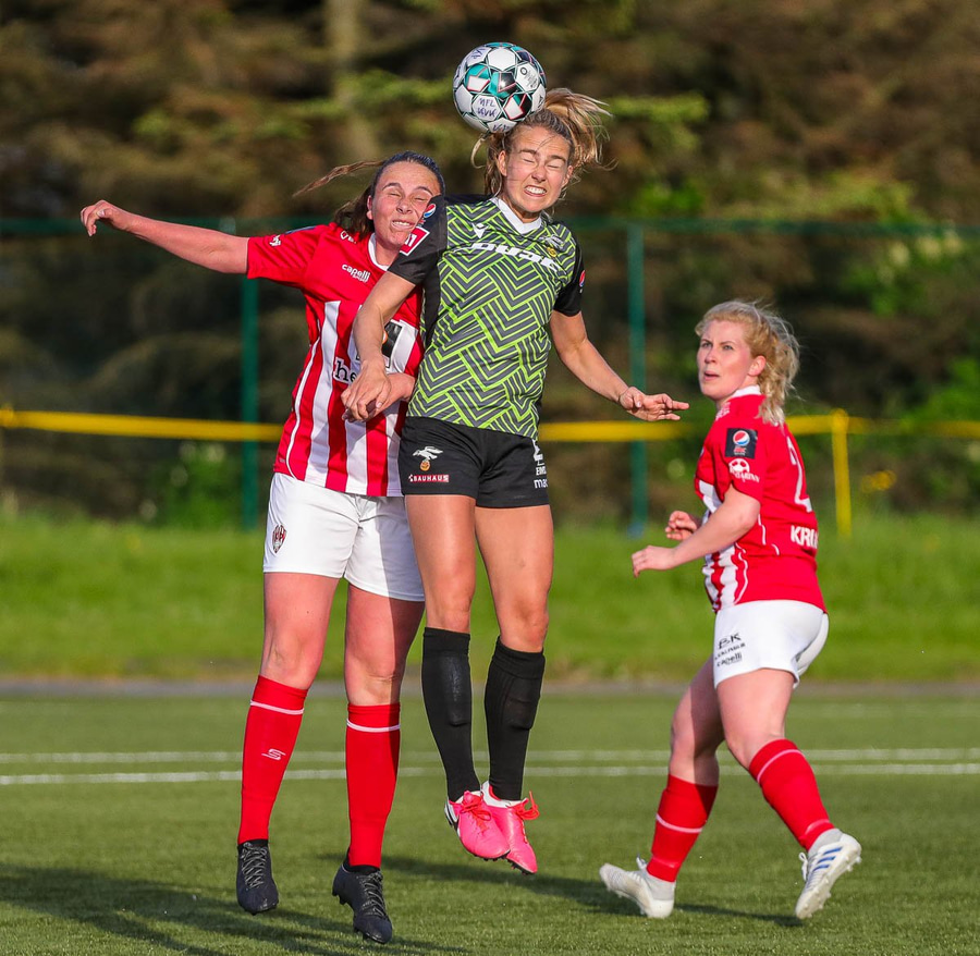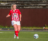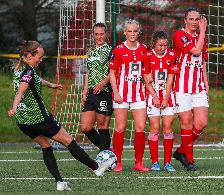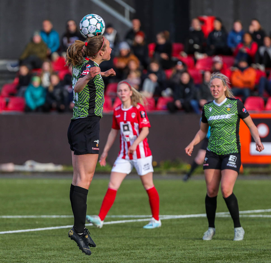Bergdís Fanney tekur aukaspyrnuna og setur háan bolta inn á teig en Andrea Magg skallar frá.
