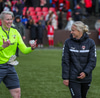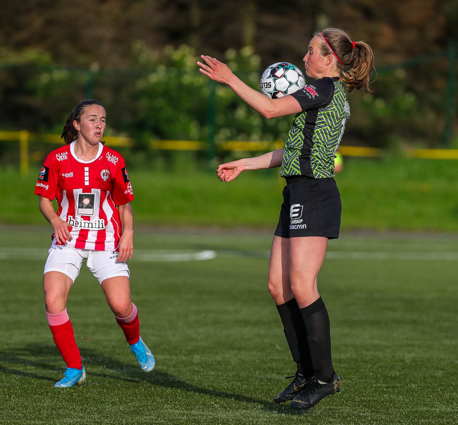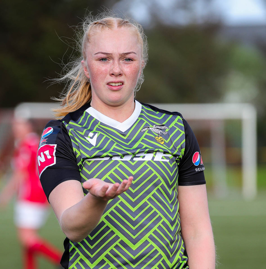 Þær Laura og Andrea Rut fá báðar gult fyrir mótmæli. Brjálaðar yfir að það hafi ekki verið dæmt mark.