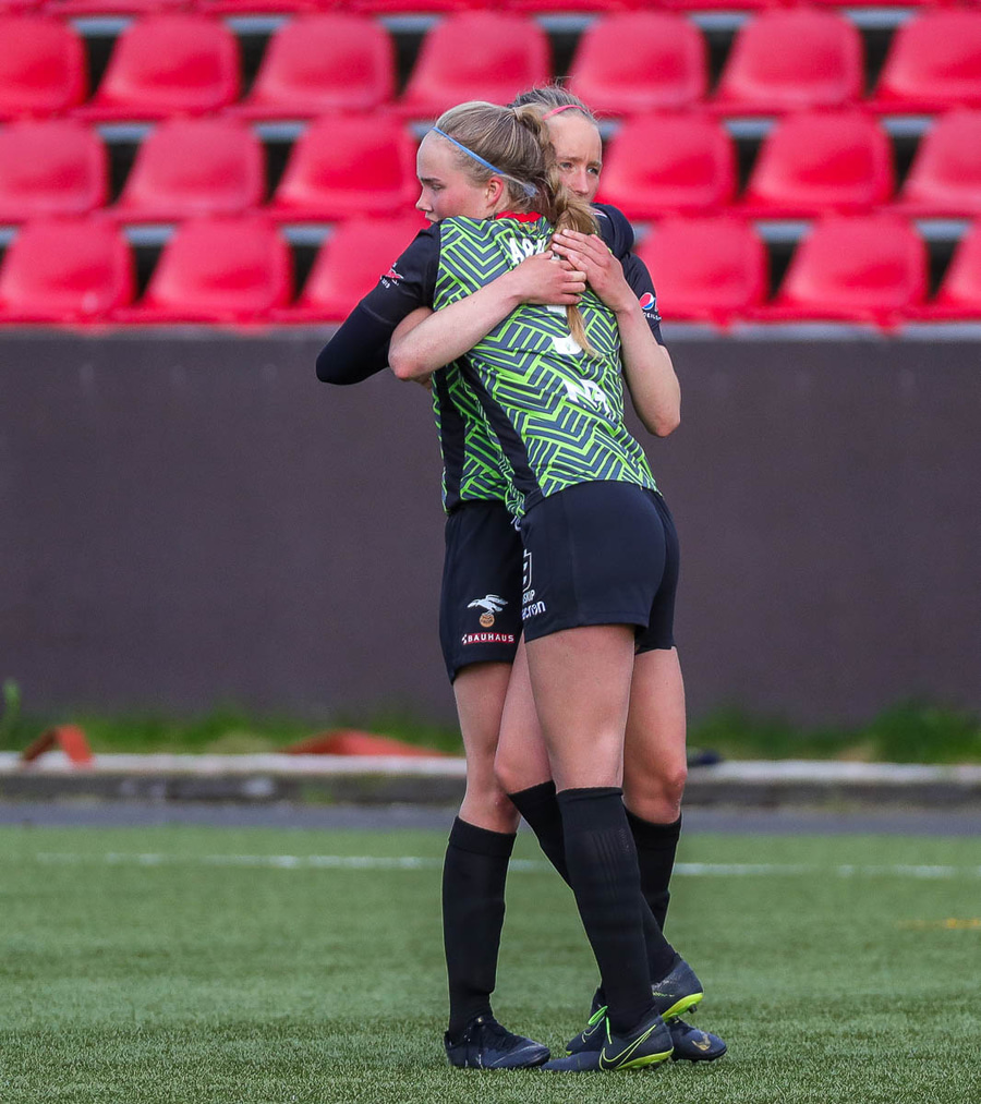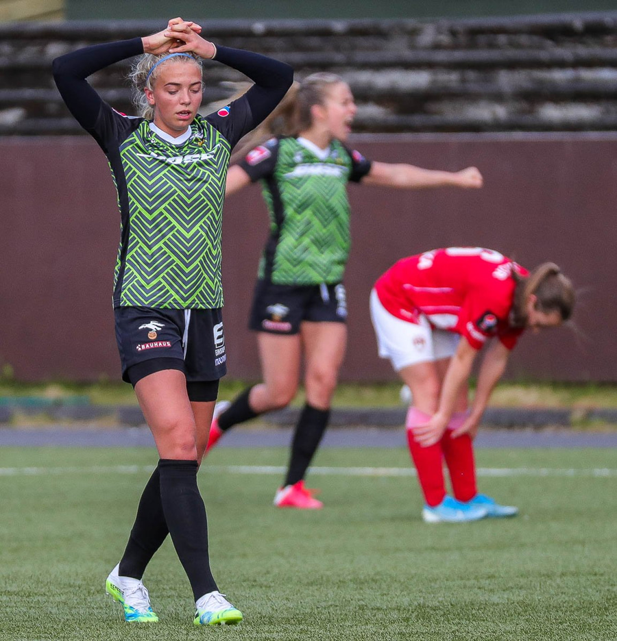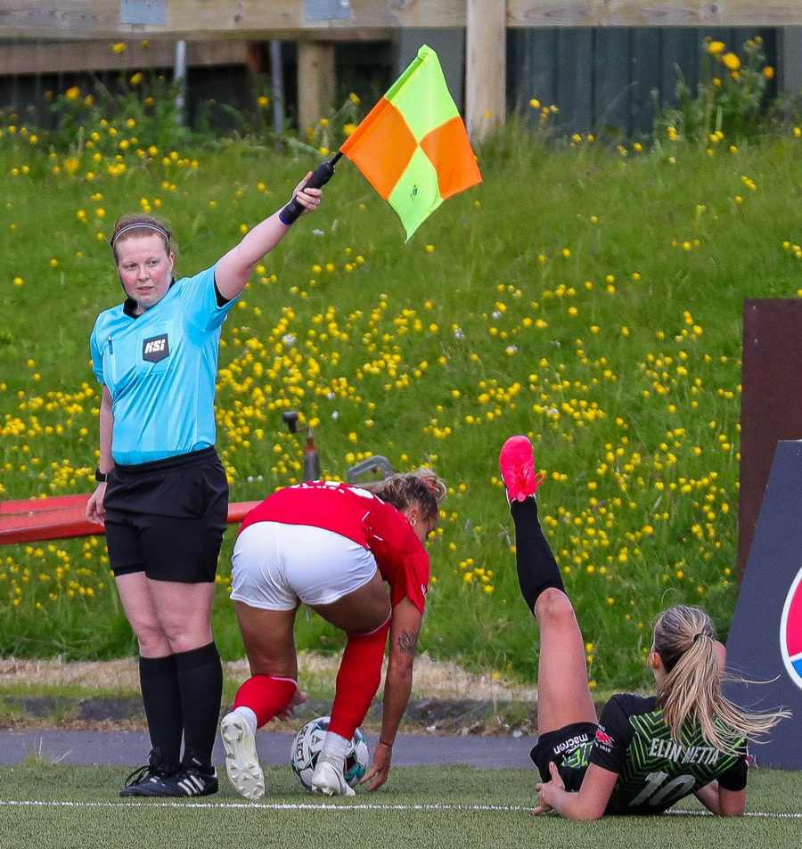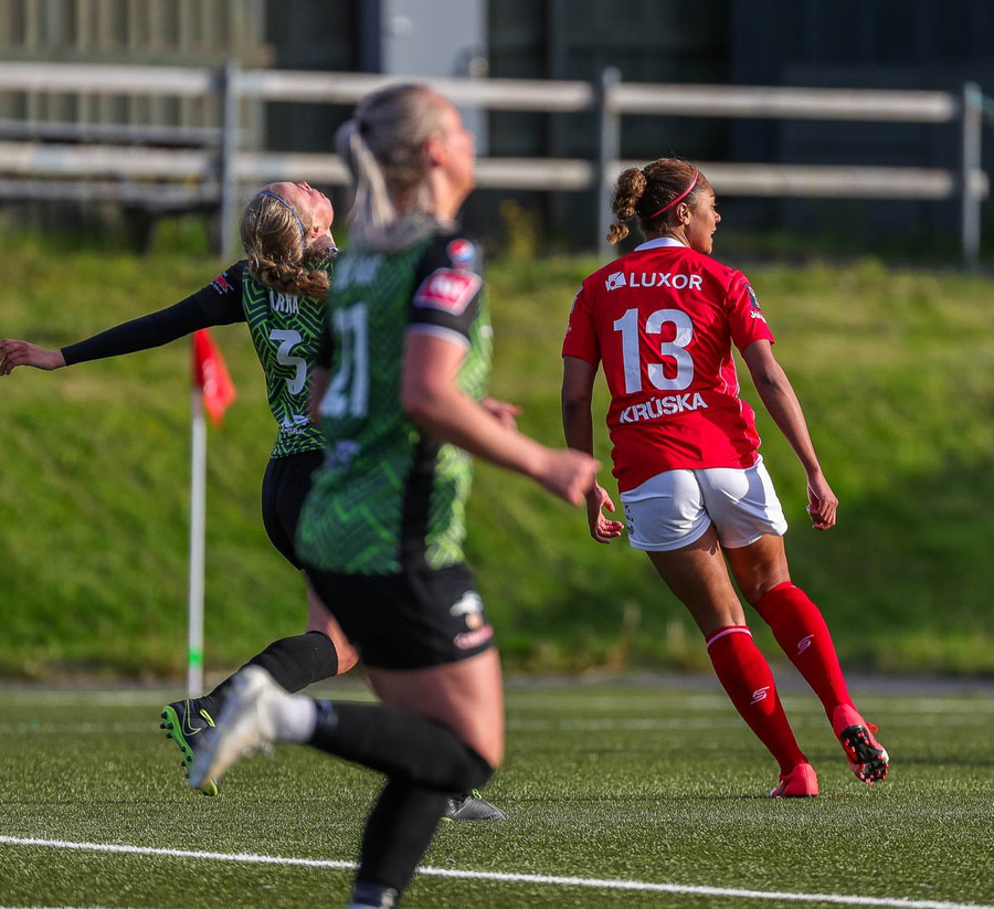 Þróttarar fá horn og það myndast stórhætta áður en Álfhildur er flögguð rangstæð.