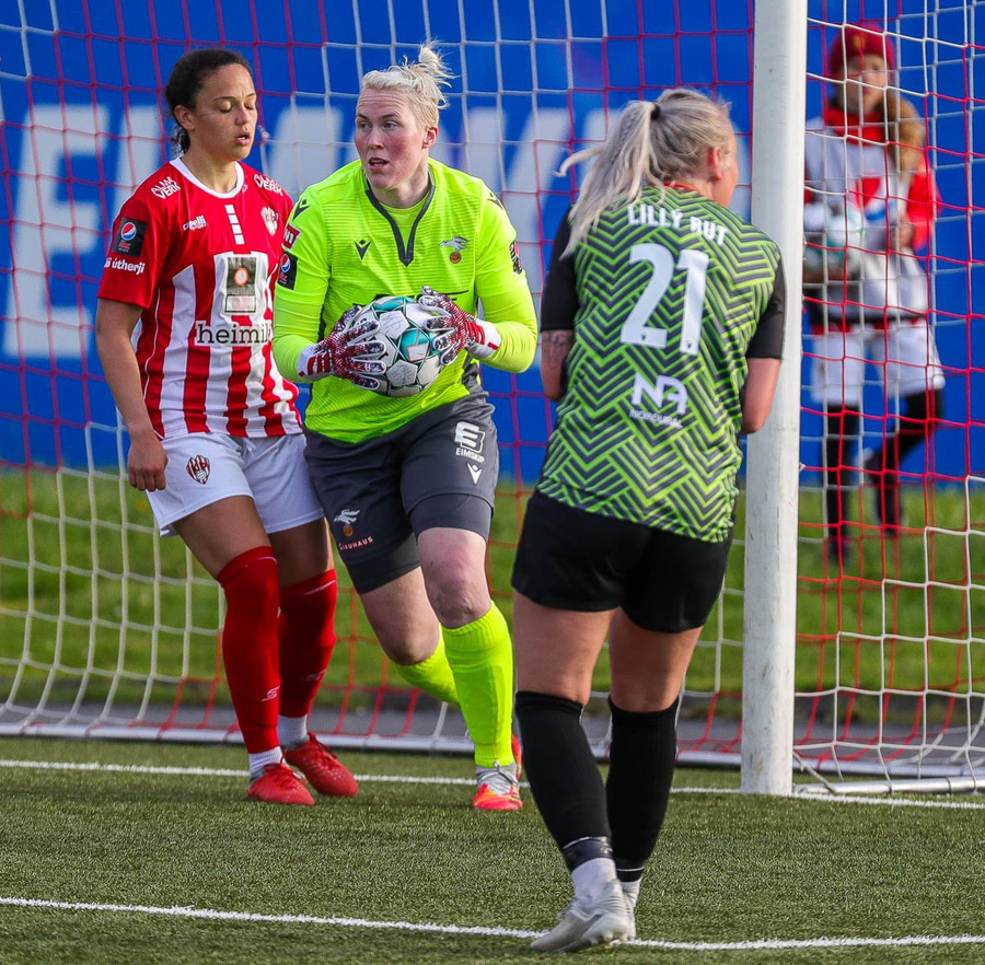 Margrét Sveins hefur betur í baráttunni við varnarmenn Vals OG Söndru og nær að koma boltanum að marki. Boltinn virðist vera kominn yfir marklínuna þegar Lillý mætir og sópar honum út/af línunni?