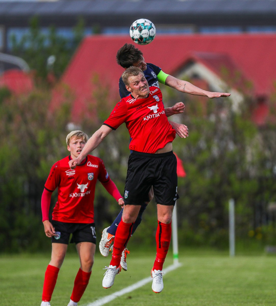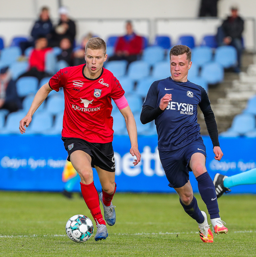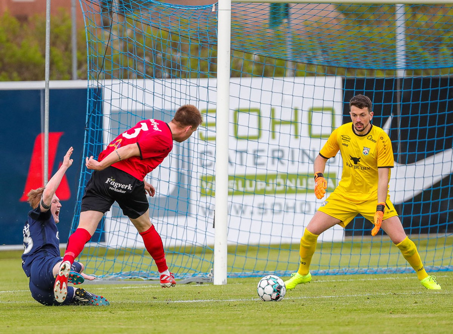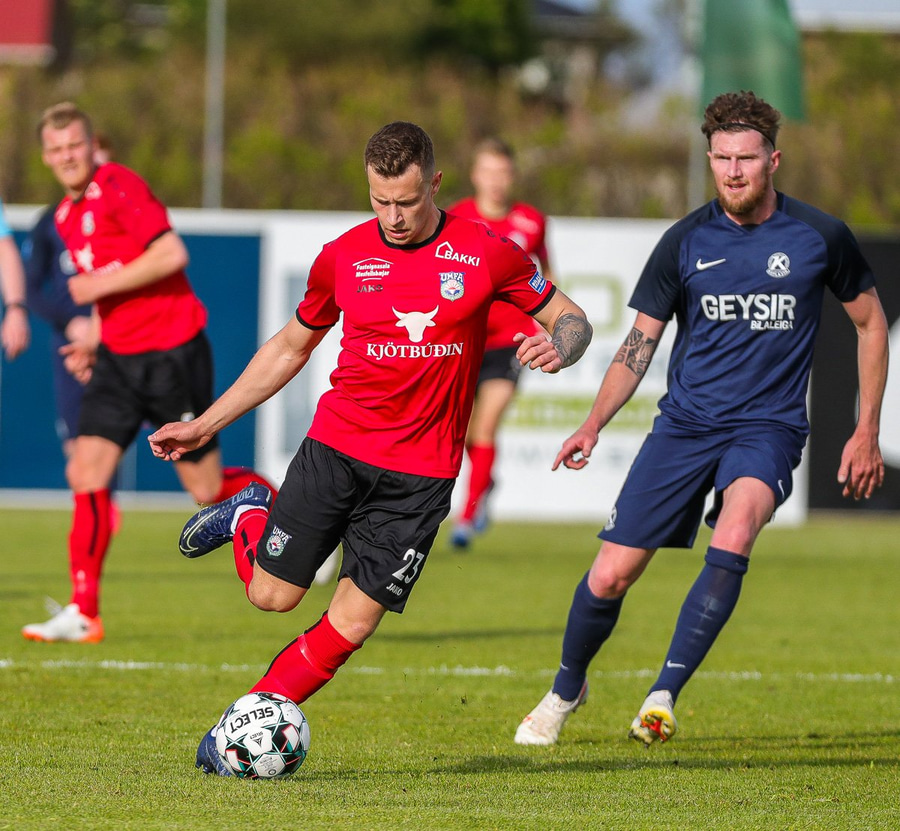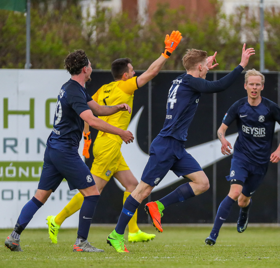 Sindri Þór dansar með boltann í teignum eftir flottan undirbúning Jóhanns Þórs. Missir boltann þó frá sér fyrir fætur Helga sem mokar boltanum yfir línunna af stuttu færi.