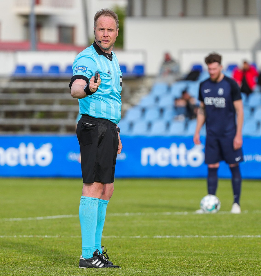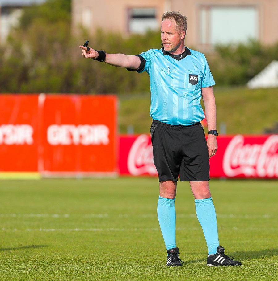 Brýtur af sér og tuðar eitthvað yfir því. Engin húmor fyrir því hjá Arnari sem bara spjaldar hann fyrir.