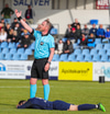 Jason í grasið á vítateigslínunni. Arnar stöðvar leikinn og gefur honum spjald fyrir dýfu. Jason mótmælir ekki einu sinni. Vel dæmt.