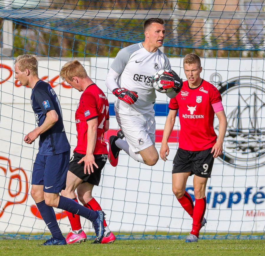 Gestirnir að vakna. Fá tvö skotfæri á nokkrum sekúndum. Það fyrra ver Sindri vel en hið síðara endar í utanverðri stönginni!! Sá ekki hverjir voru að verki.