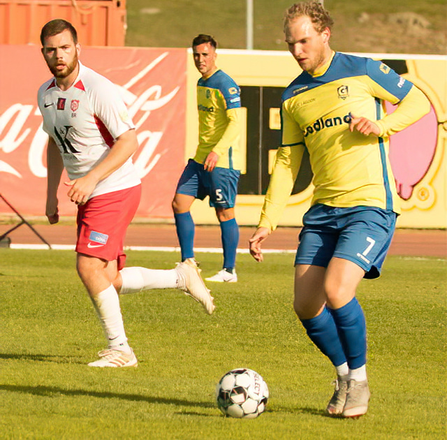 Grindvíkingar fá nú aukaspyrnu á góðum stað og Gunnar Þorsteinsson og Aron Jóhannsson standa yfir boltanum. Utarlega til hægri, hentar vinstri fæti Gunnars vel.
