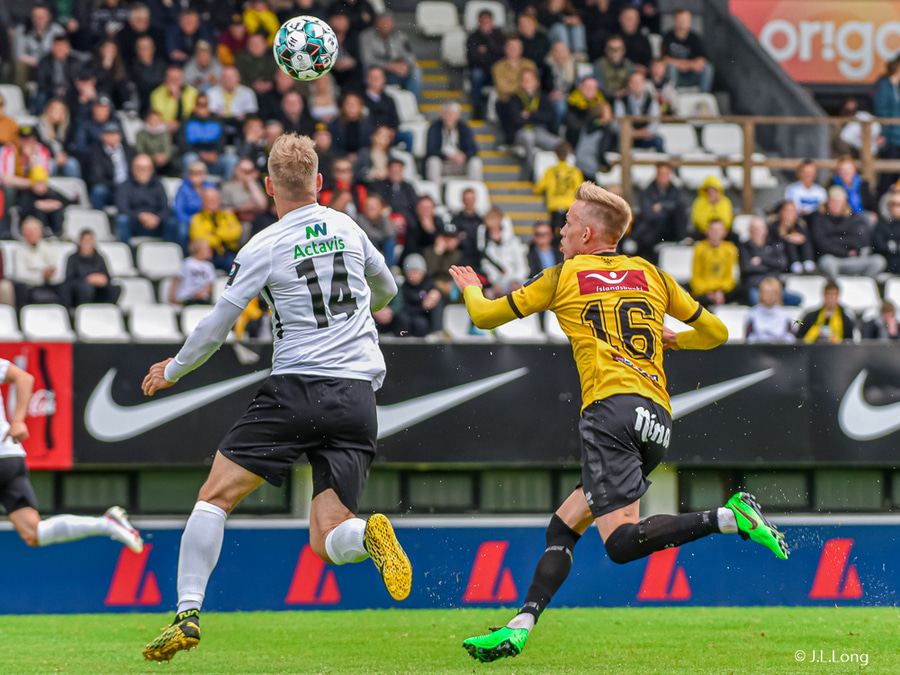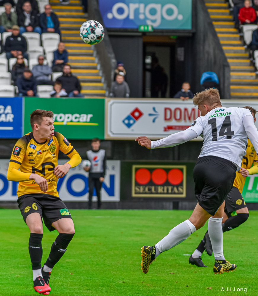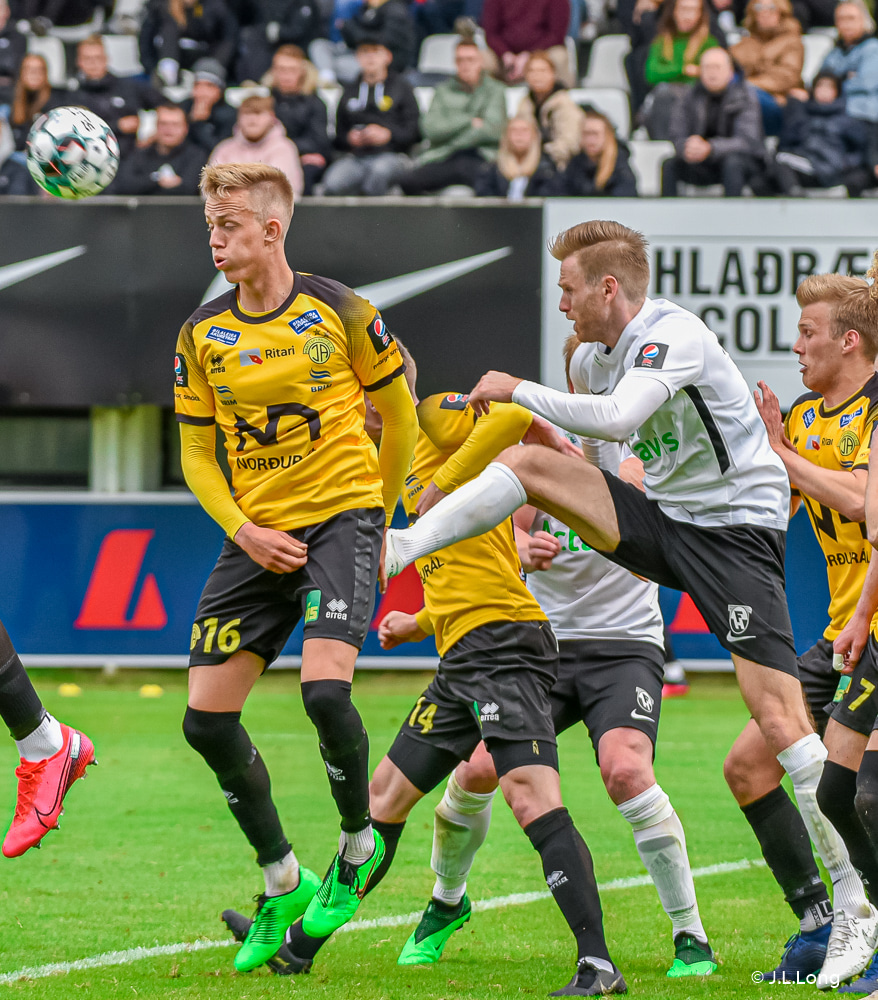 Hjörtur Logi með flotta fyrirgjöf á Morten Beck en skallinn tilturlega beint á Árna.
