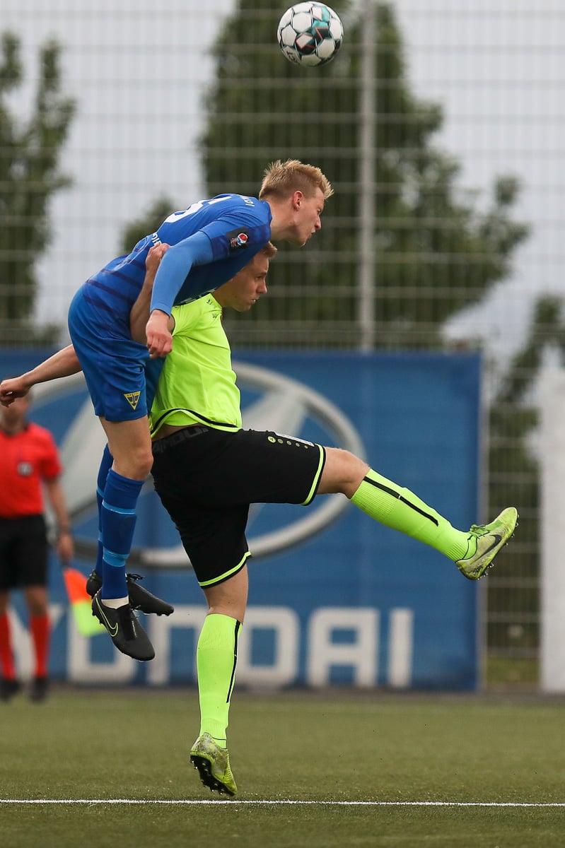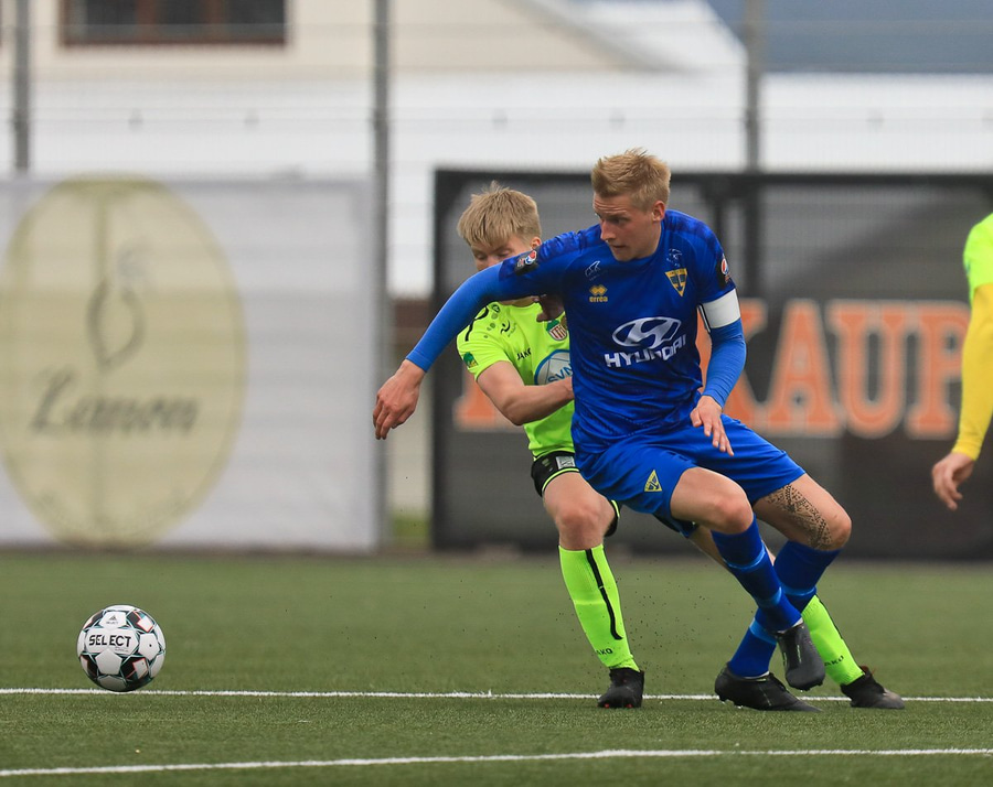 Brynjar Þorri neglir Ástbjörn niður á miðjunni sem var að spóla framhjá þeim nokkrum í Hött/Huginn.