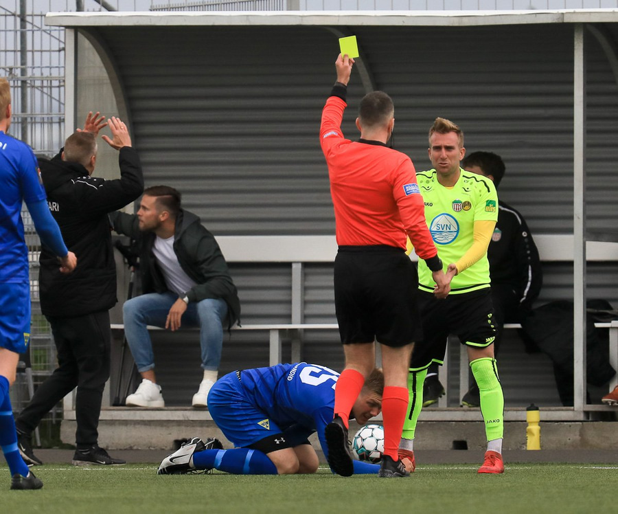 Eiki fer harkalega í Óskar Jóns sem var að senda boltann frá sér og fær gult að launum.