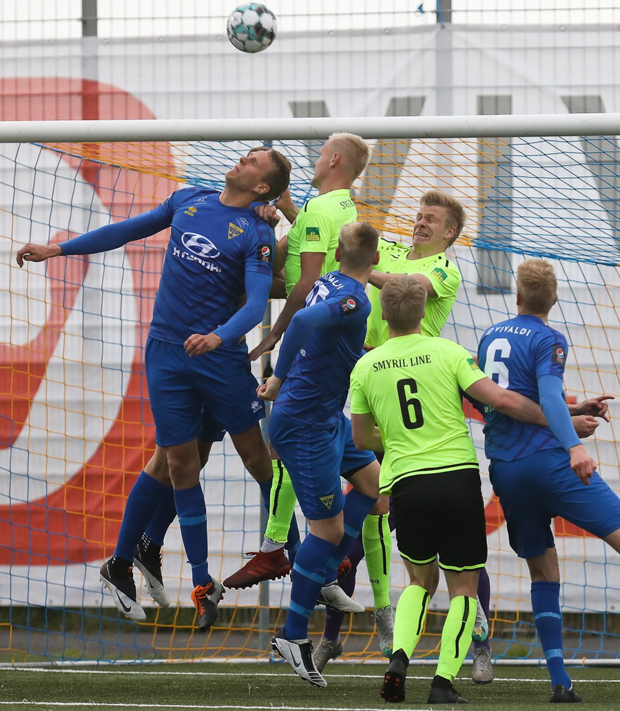 Boltinn er svolítið að falla fyrir austanmenn inná teignum eftir langar aukaspyrnur.