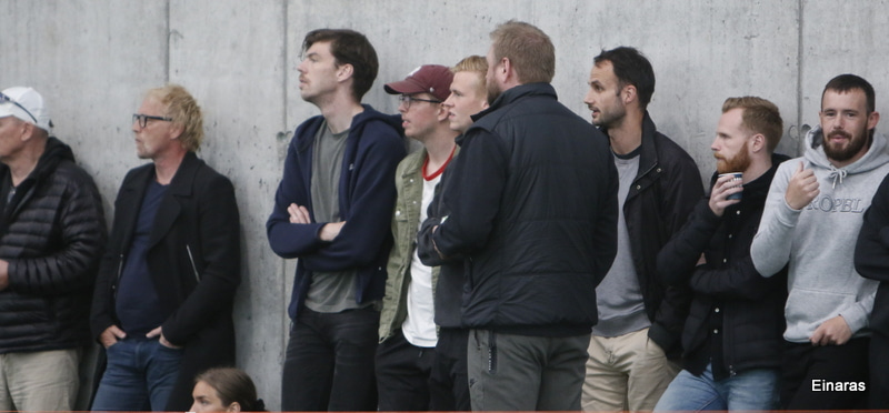 Sprellimark í Skessunni. Arnór Borg stillir sér upp til að taka hornspyrnuna. Stúkumegin. Hann hættir ekki tilhlaupinu fyrr en hann hefur bakkað á eitthvað og dettur aftur fyrir sig. Stúkan hlær.