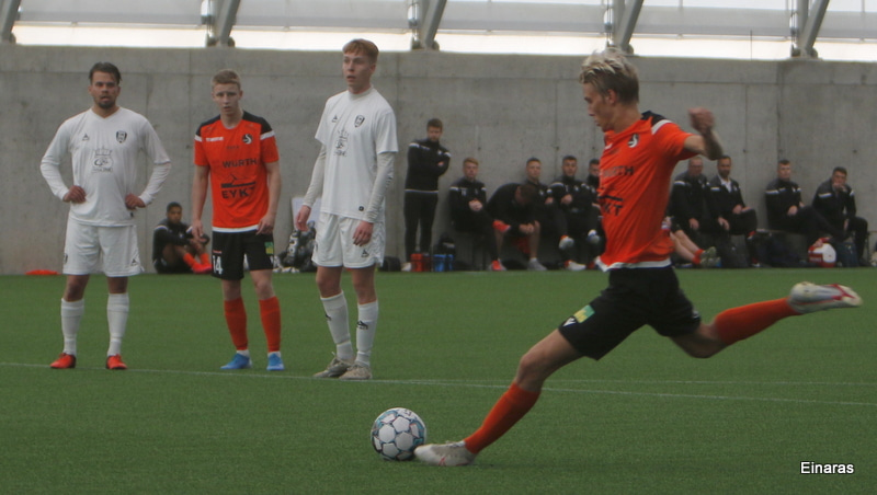 Arnór Gauti JÓNSSON næstum með sokk handa undirrituðum. Boltinn skoppar til hans úr horni. Hann tekur á móti honum og hamrar honum í stöngina.