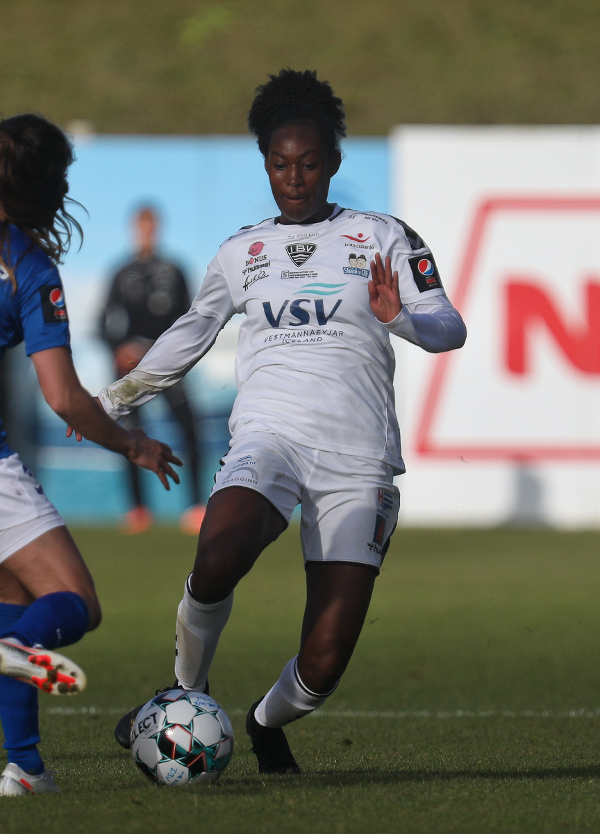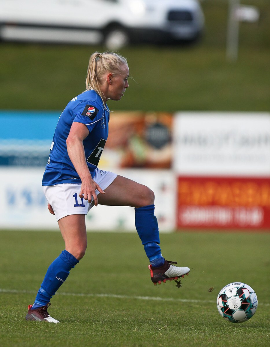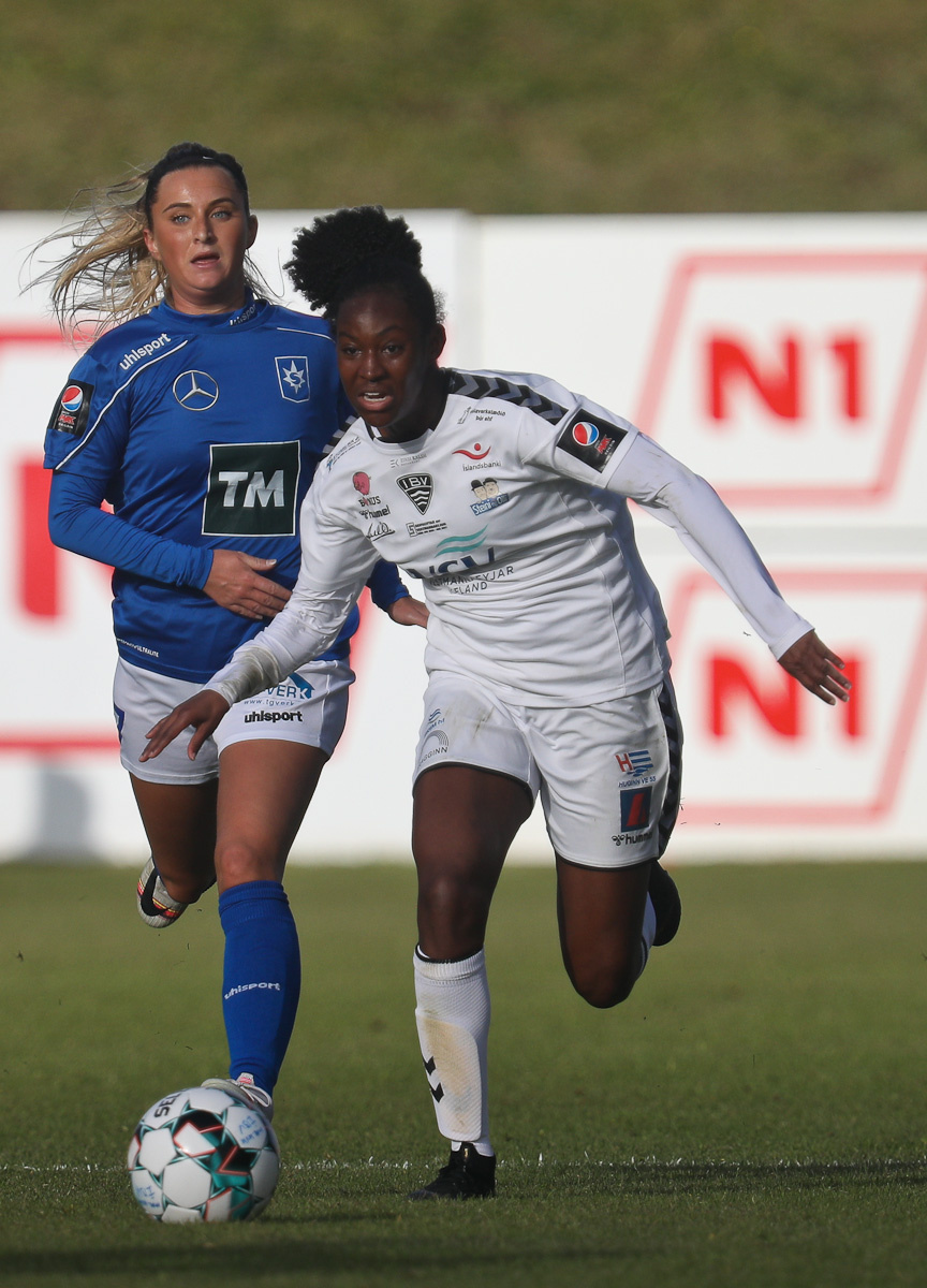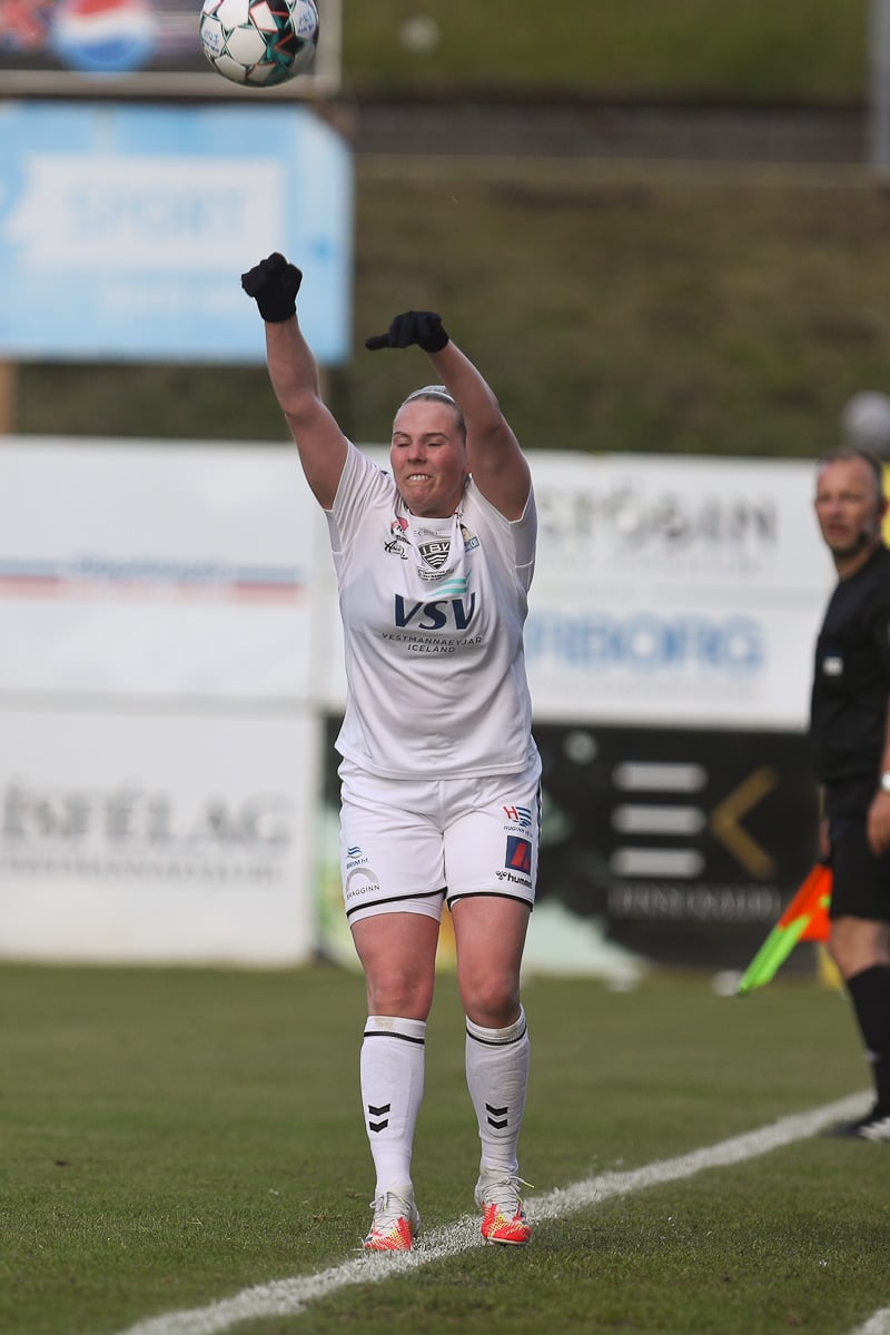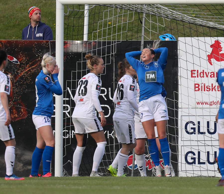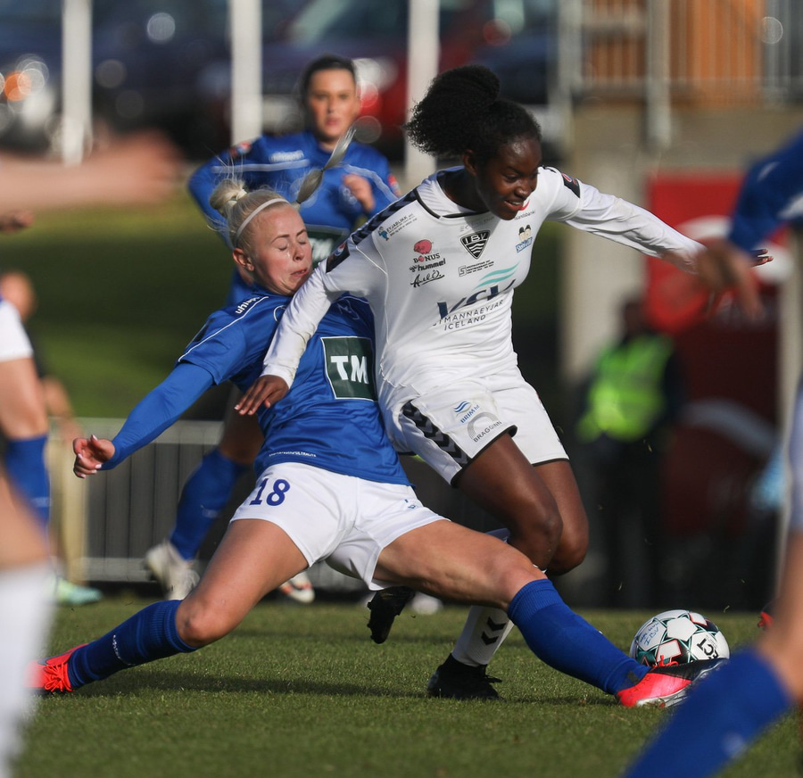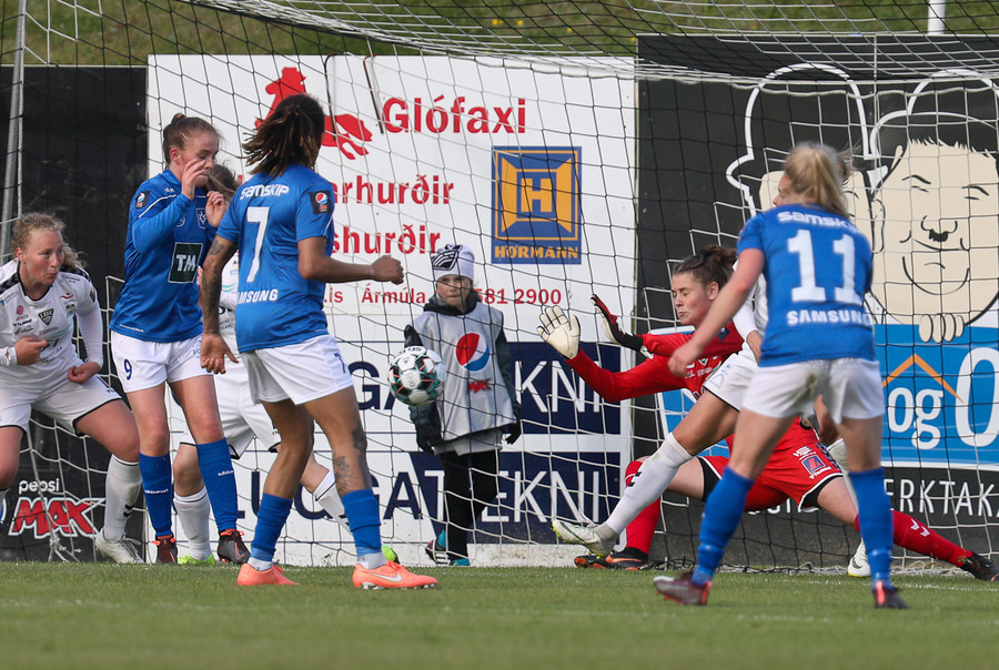 ÍBV fær aukaspyrnu rétt fyrir utan teig. Danielle og Fatma reyna eitthvað af æfingasvæðinu en það gekk ekki.