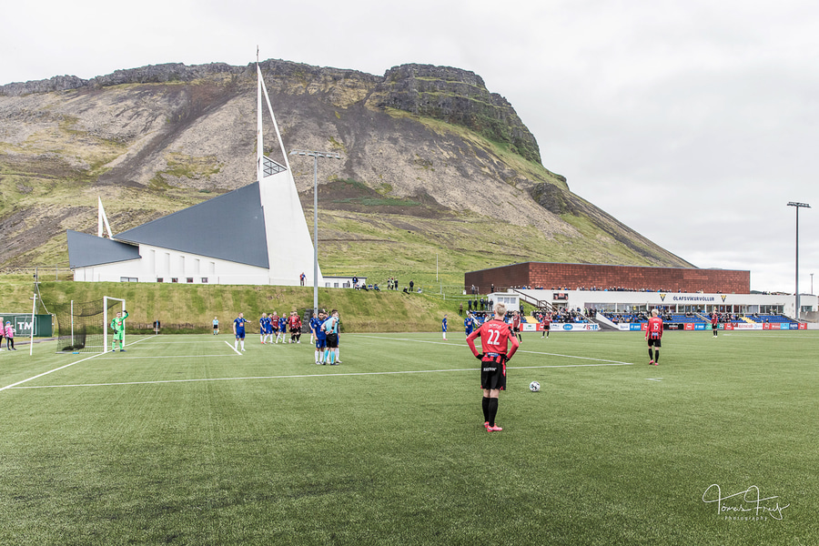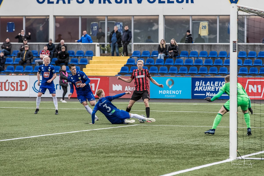 Daniel Snorri Guðlaugson leikmaður Ólsara með flotta gabbhreyfingu á miðjunni, losar sig við manninn sinn, sendir svo flotta djúpa stungusendingu, sem Gonzalo tekur glæsilega á móti með, léttri snertingu með höfðinu, sendir hann svo fyrir, en enginn samherji er inni boxi