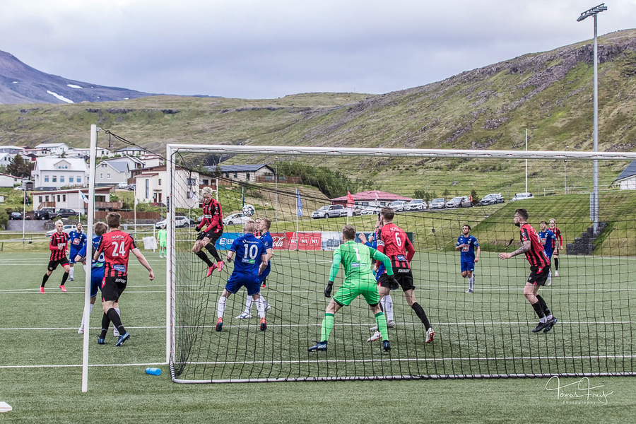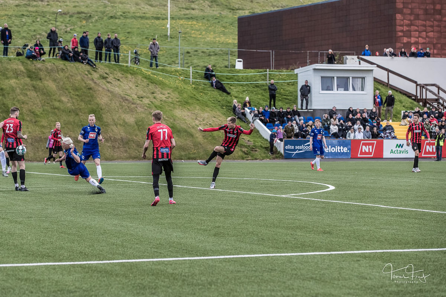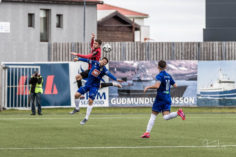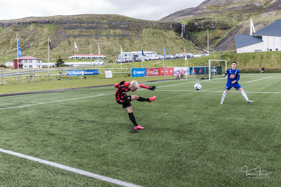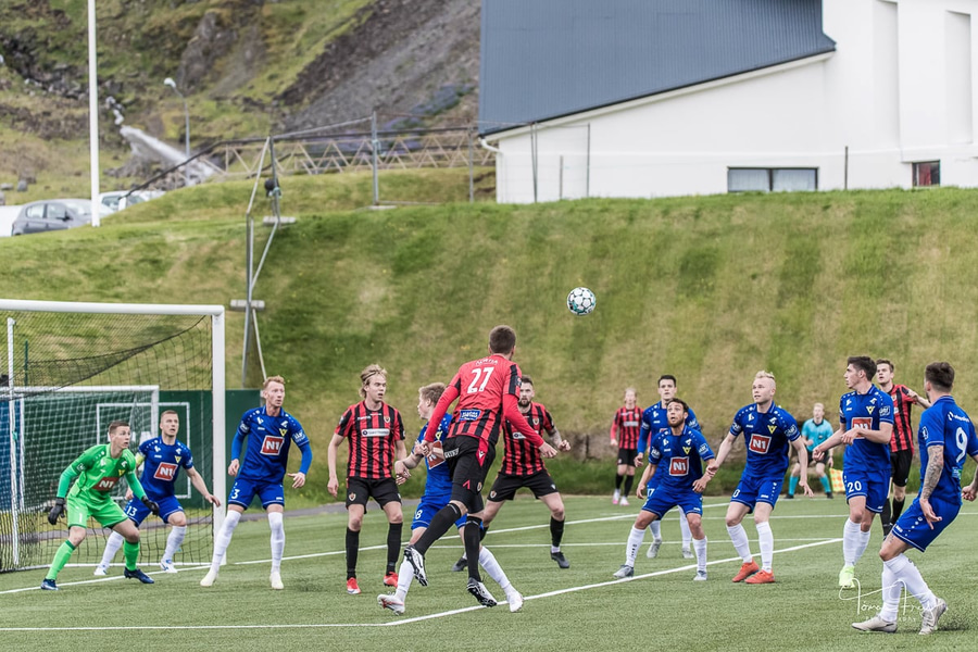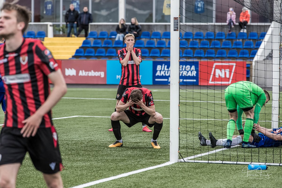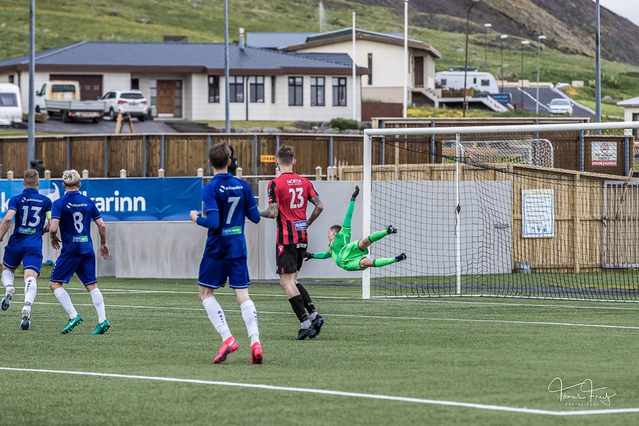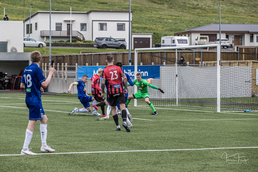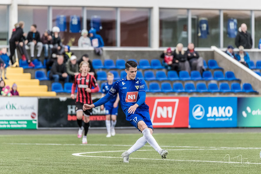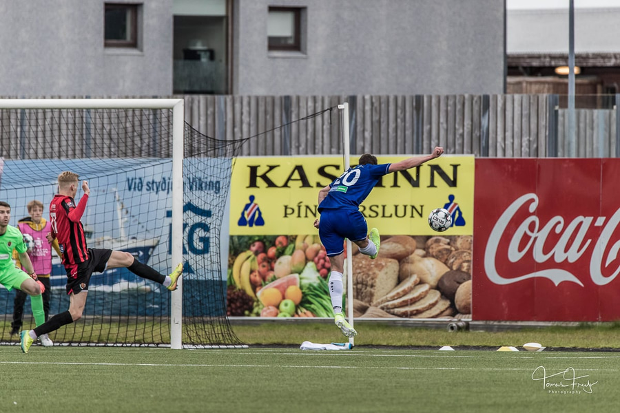 Sendingin kemur á fjær og Vitor Viera Thomas tekur háfklippu en hittir boltann illa og fer vel framhjá