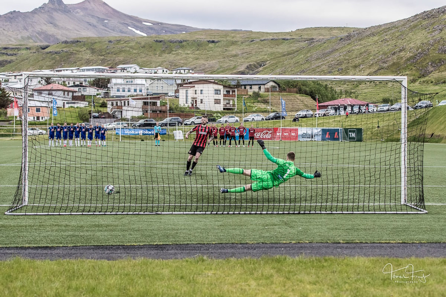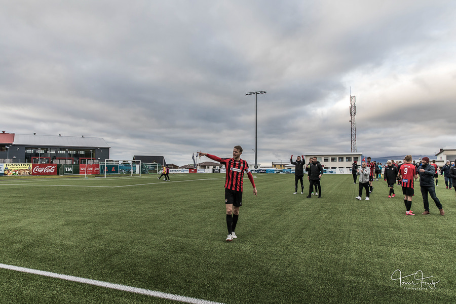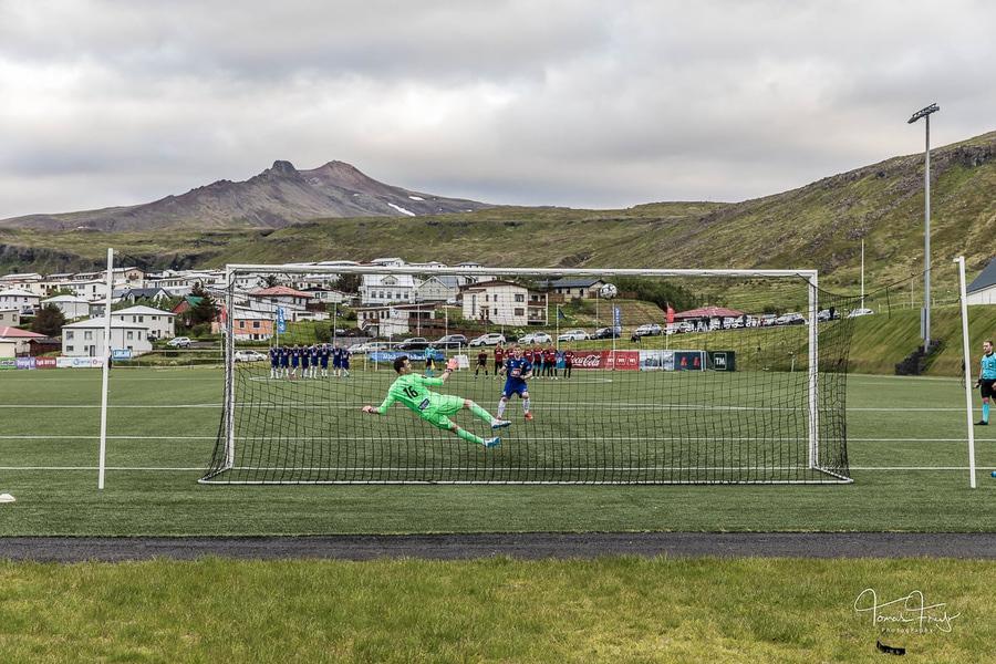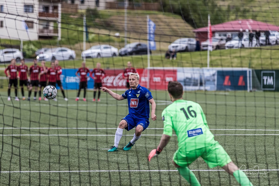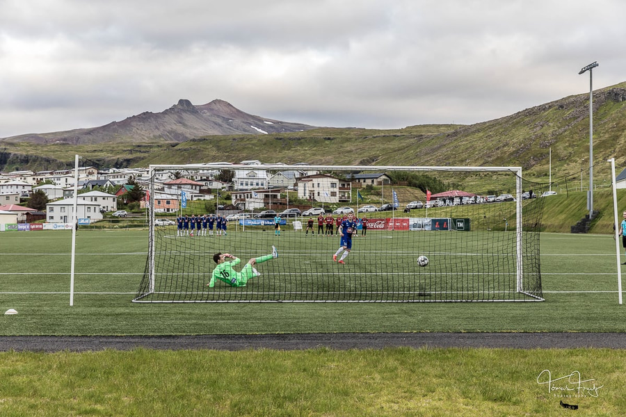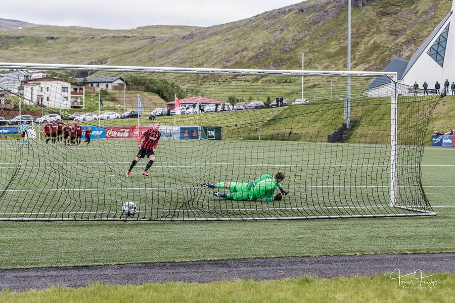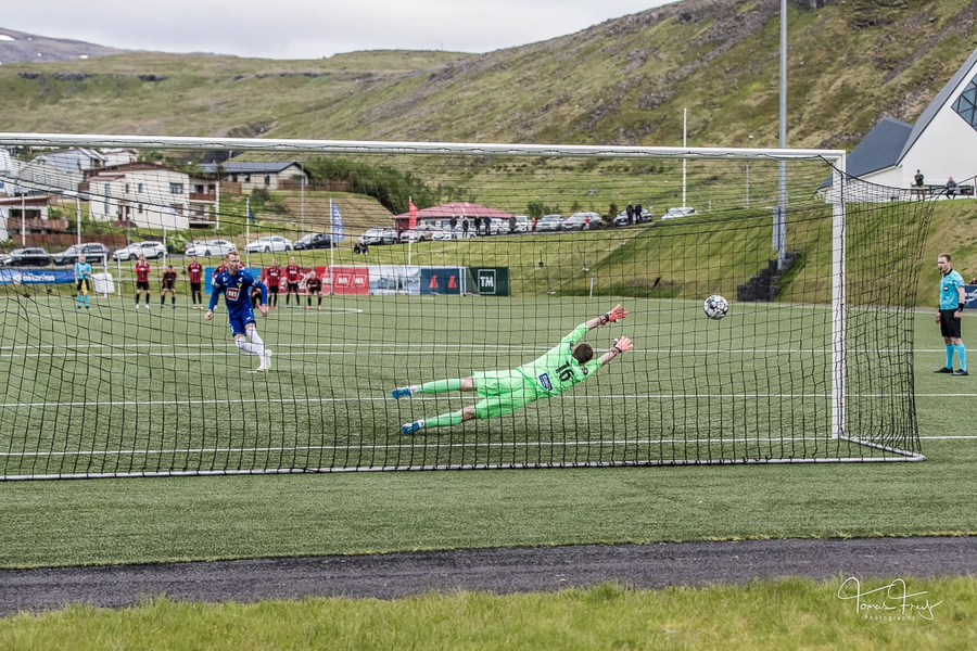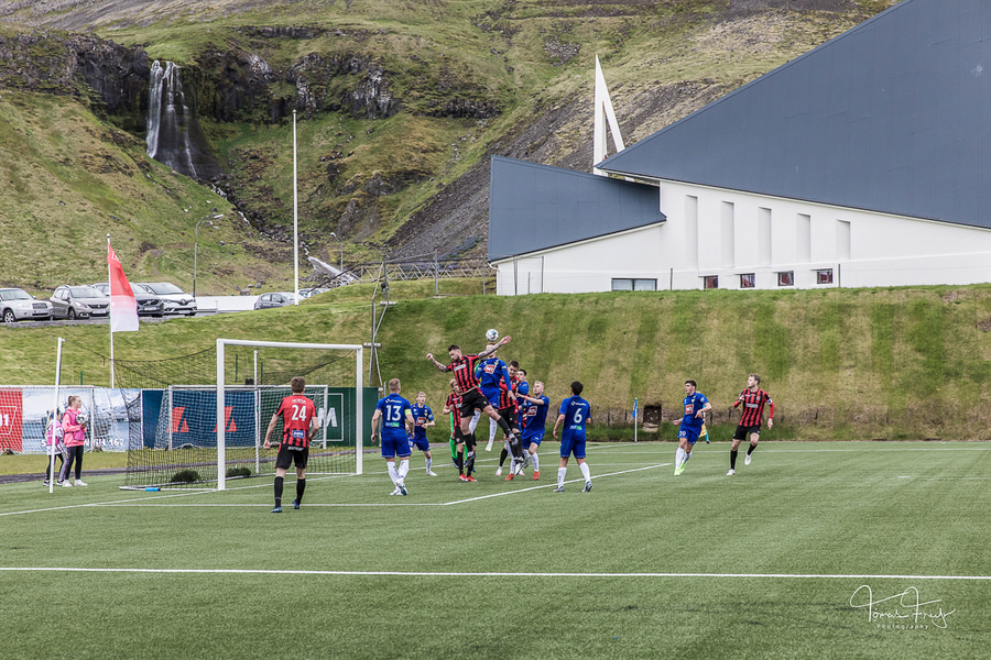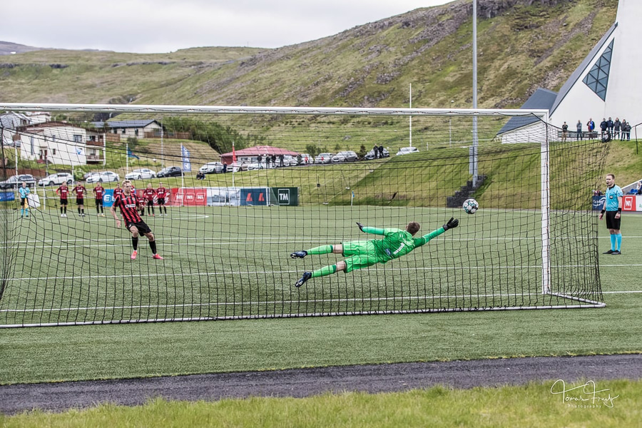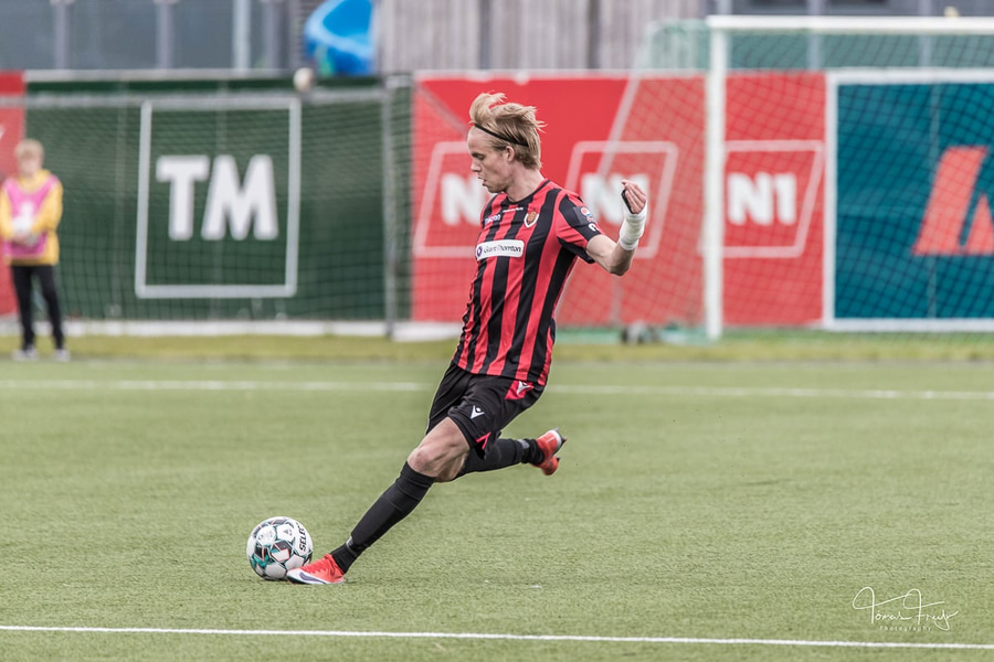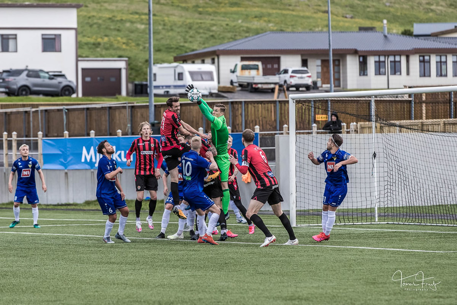 Sendingin kemur á fjær og Vitor Viera Thomas tekur háfklippu en hittir boltann illa og fer vel framhjá