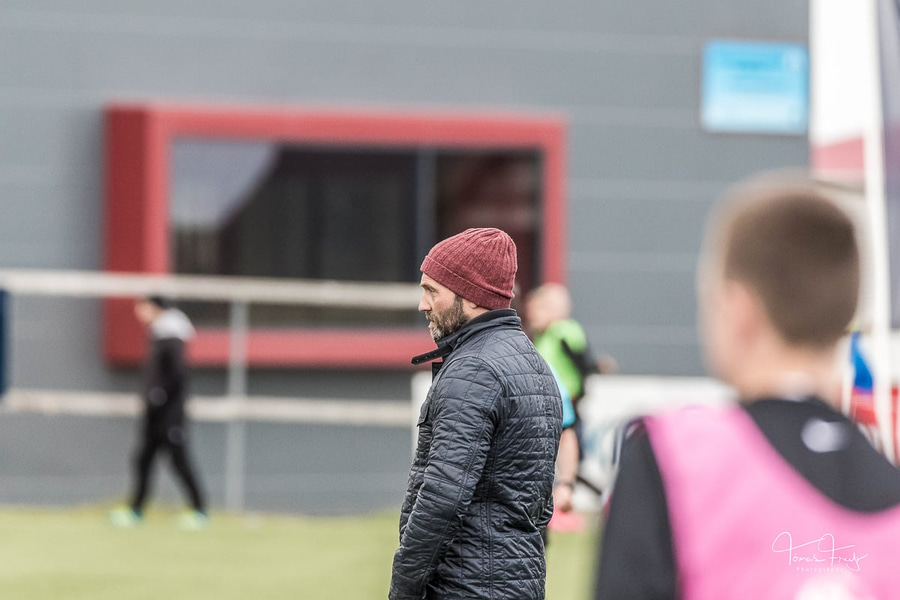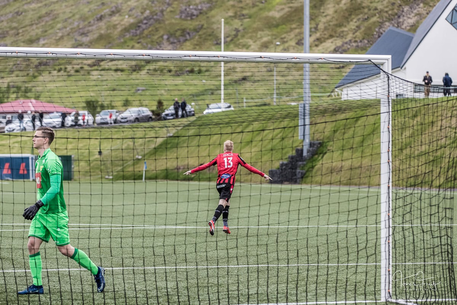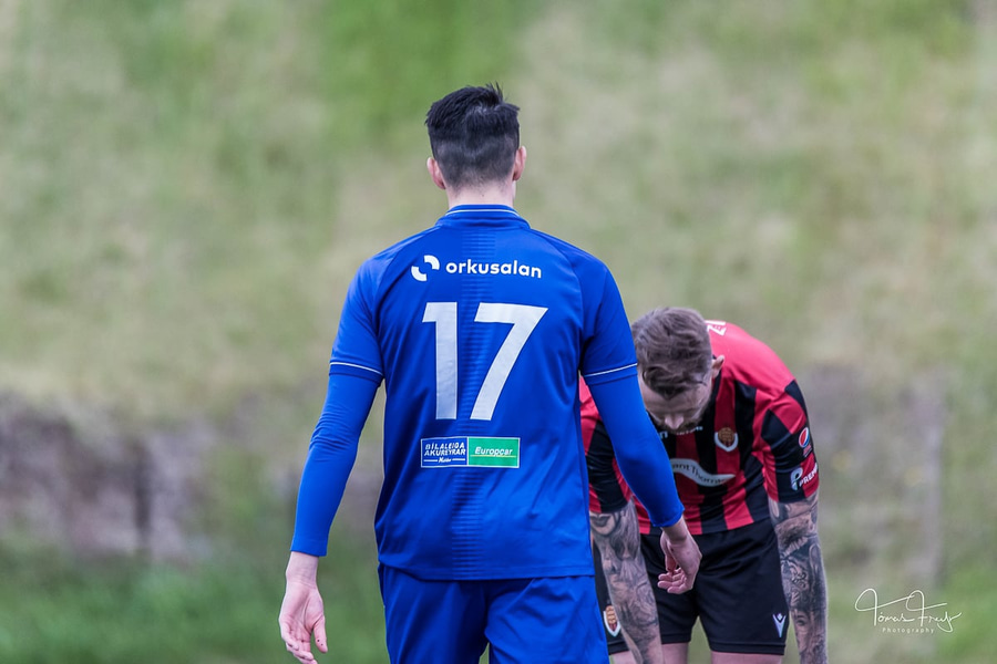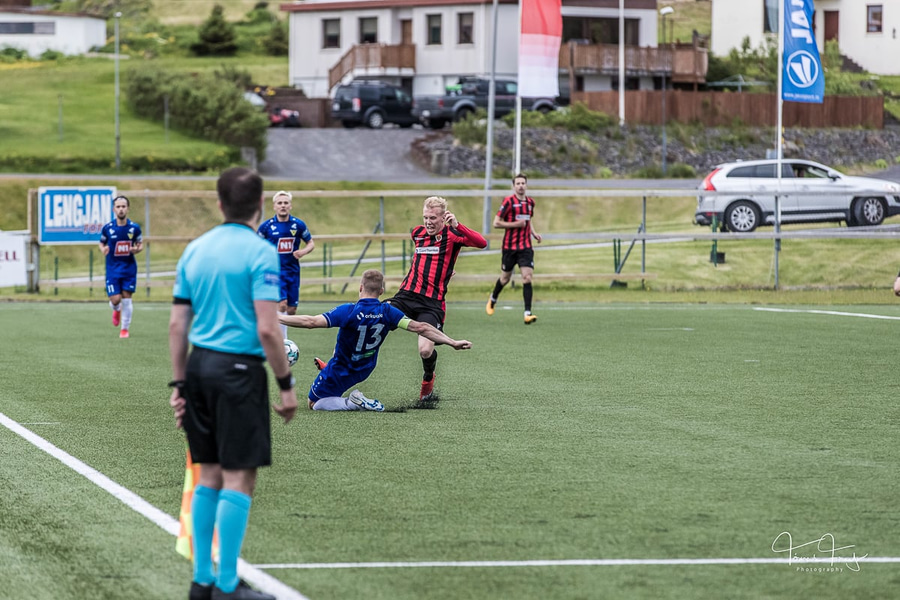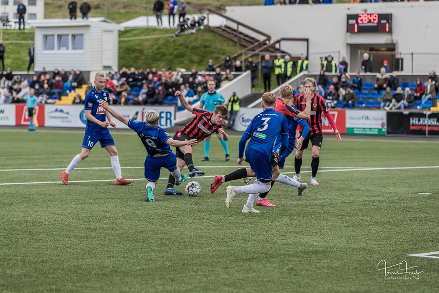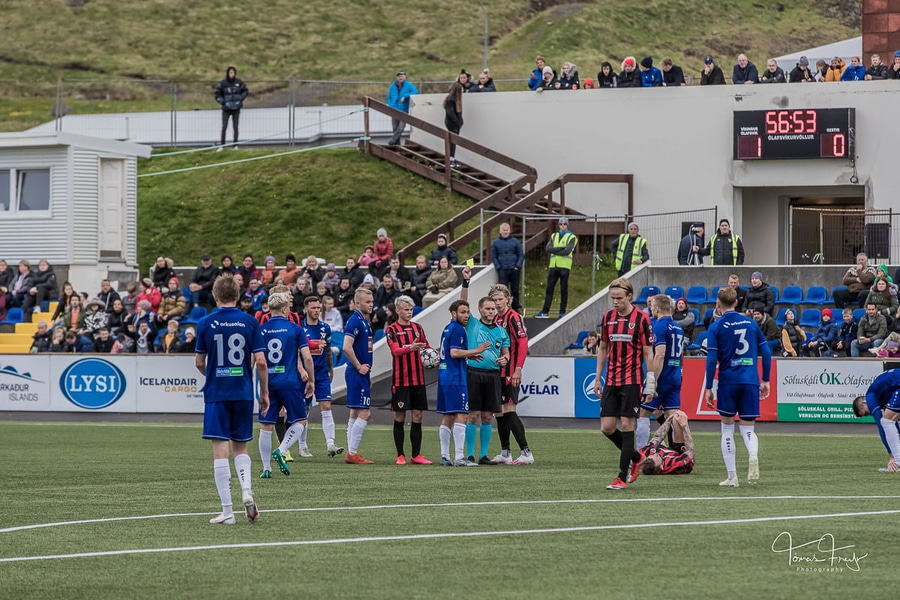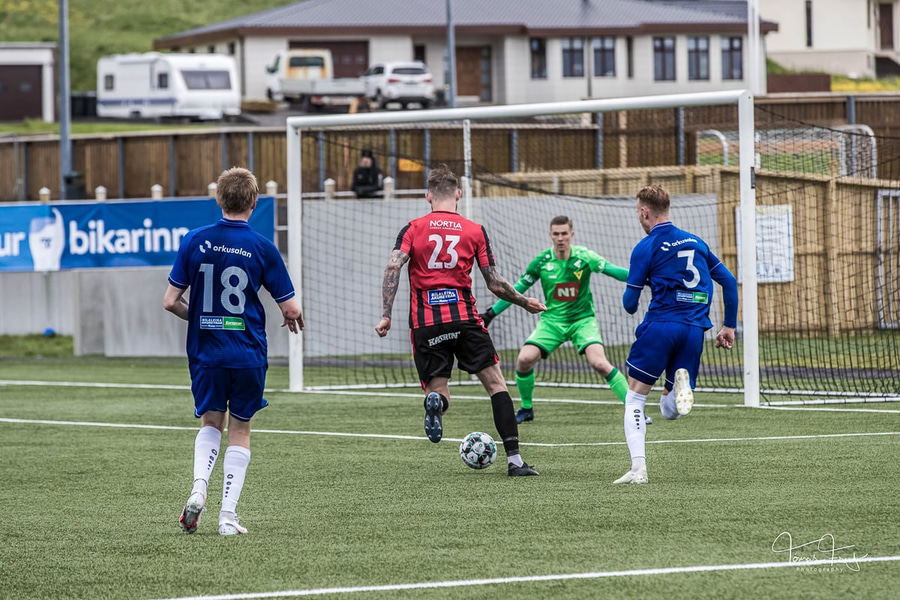 Gonzalo Zamarano Leon hjá Ólsurum fær boltann á vinstri kantinum dribblar alveg að hliðarlínu reynir að sóla 3 varnarmenn en missir boltan