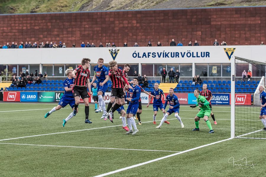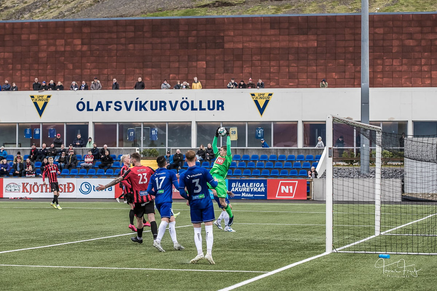 Víkingur R. halda bolta vel, og áttu fínan háan bolta inní teig frá aftustu línu, en Brynjar Atli í marki Ólsara las sendinguna vel og kom út úr markinu á réttum tíma