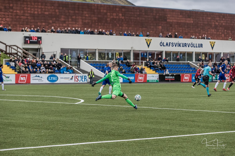 Víkingur Ó með langan bolta fram á Gonzalo sem tekur glæsilega á móti honum, tekur sprett að marki, fær enga hjálp þannig að hann tekur skot með vinstri sem er rétt framhjá