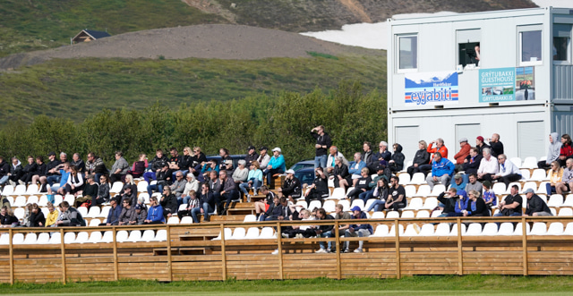 Það er frábært veður á Grenivík. 18 stiga hiti, sól og fylgir smá gola með sem kælir menn niður inn á vellinum. Völlurinn iðagræn. Toppaðstæður!
