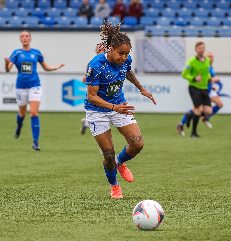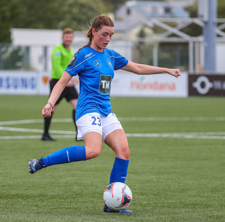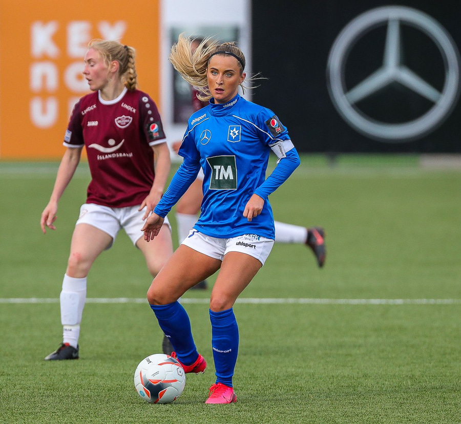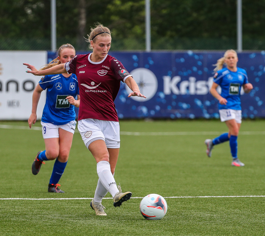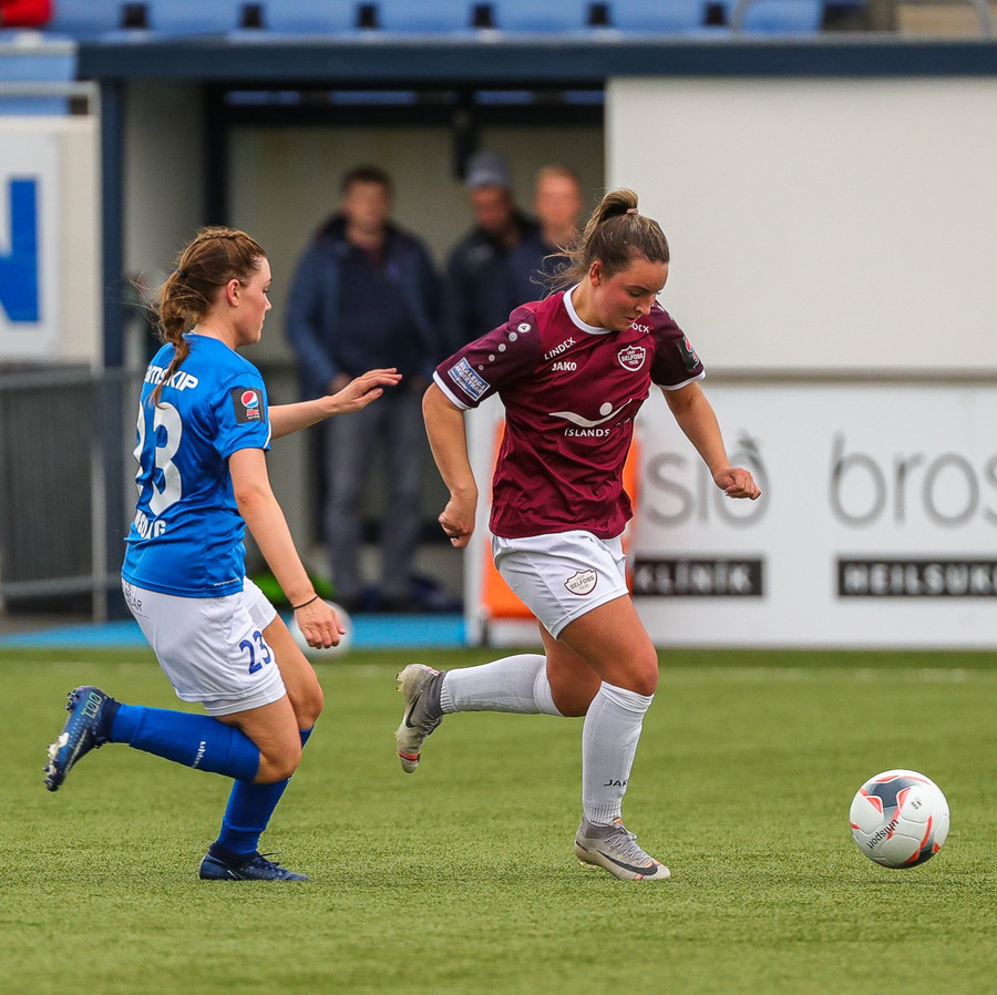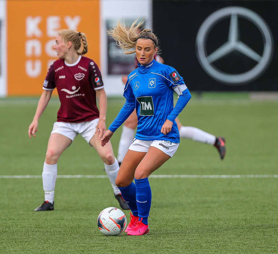 Jasmín Erla nær geggjuðu skoti vel fyrir utan teig. Maður hélt í fyrstu að skotið færi langt yfir en það var lúmskt og þurfti Kaylan að hafa vel fyrir því í markinu og rétt náði að nikka boltanum yfir. Heimakonur fá horn