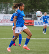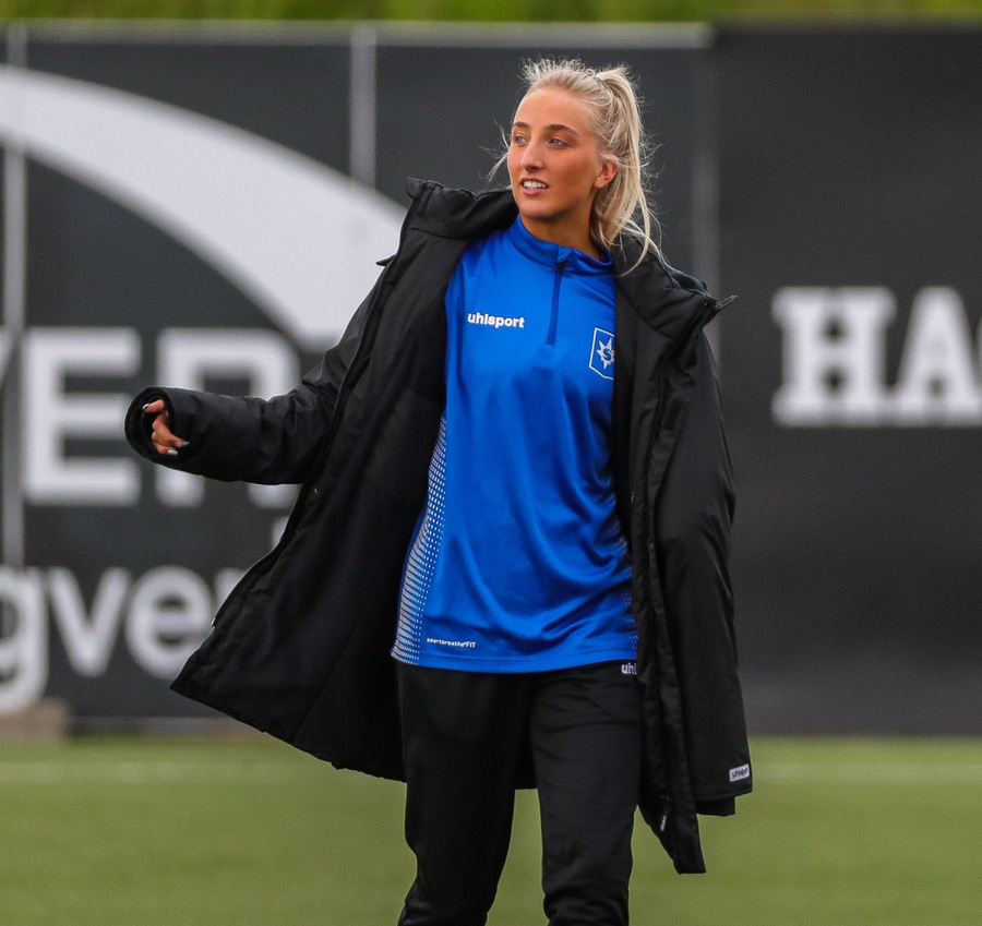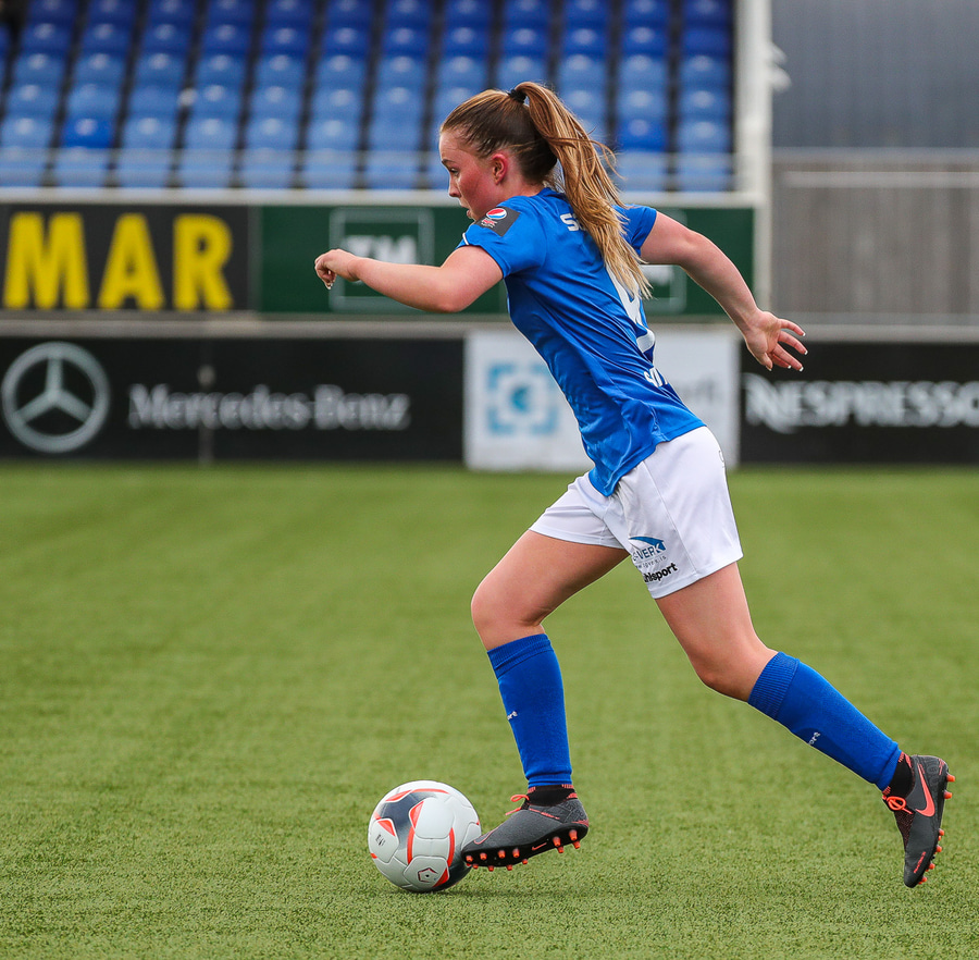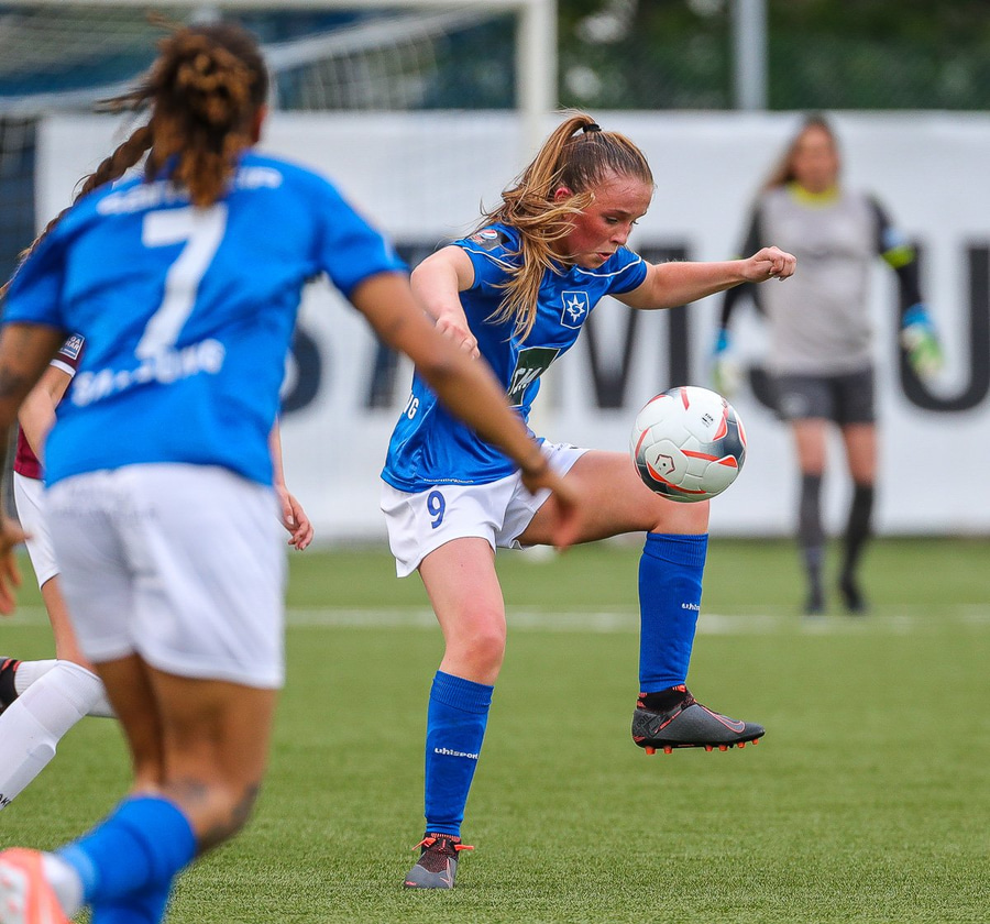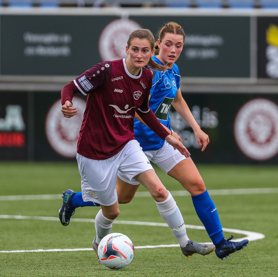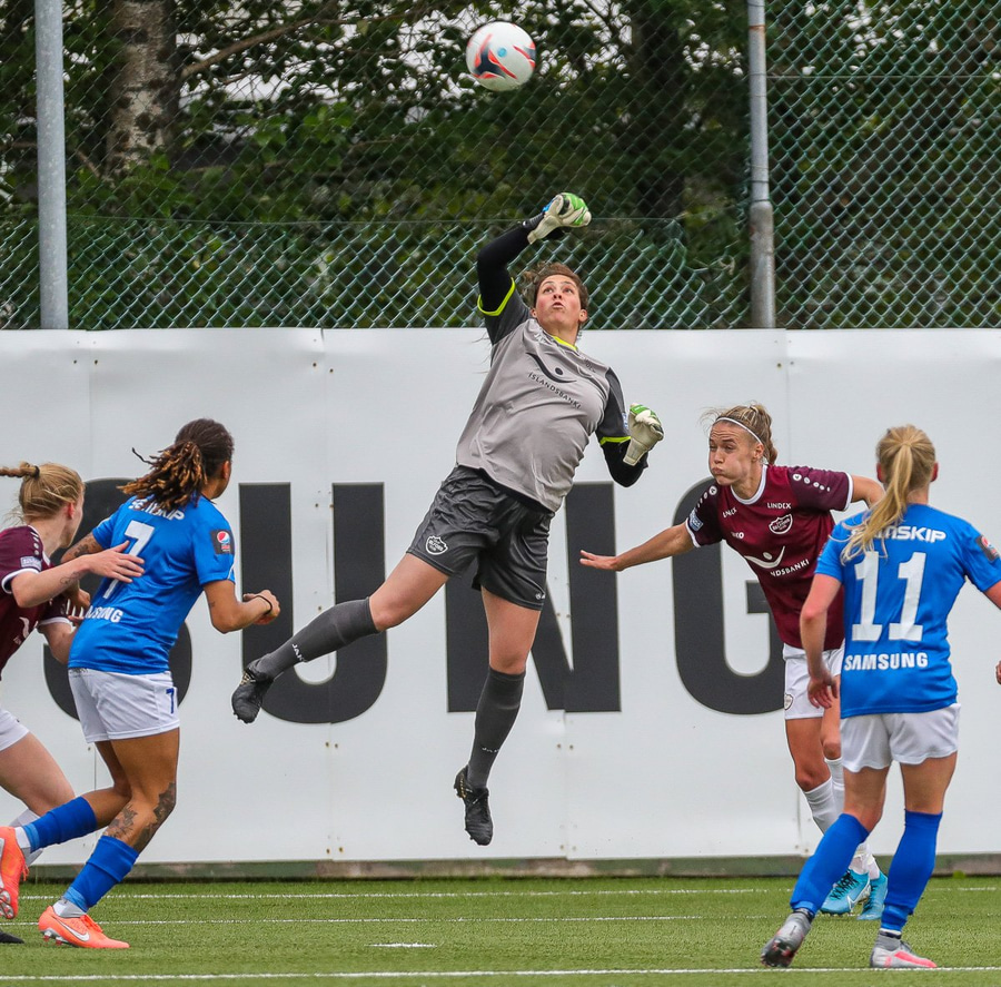 Jasmín Erla nær geggjuðu skoti vel fyrir utan teig. Maður hélt í fyrstu að skotið færi langt yfir en það var lúmskt og þurfti Kaylan að hafa vel fyrir því í markinu og rétt náði að nikka boltanum yfir. Heimakonur fá horn