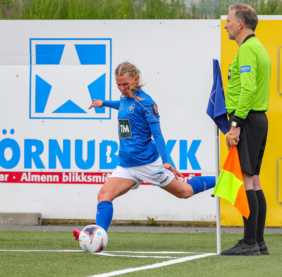Gestirnir fá fyrsta horn leiksins. Þær taka það stutt, senda inn í og Anna Björk reynir að nikka boltanum inn með hælnu en það gengur ekki og Birta handsamar boltann
